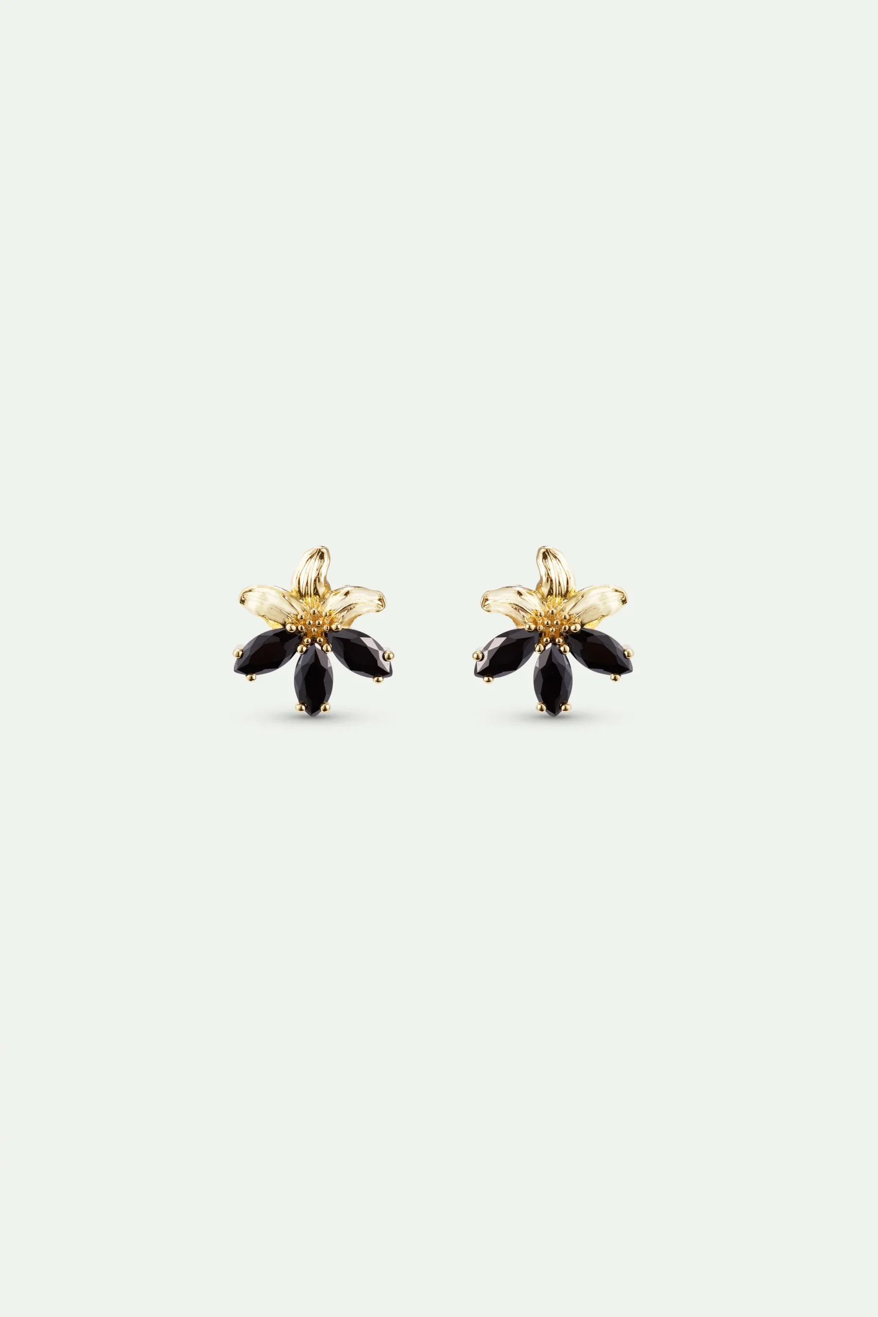 Boucles d’oreilles tiges dorées fleur de lys en laiton doré à l’or fin, et pierres noires en oxyde de zirconium taillées en marquise.