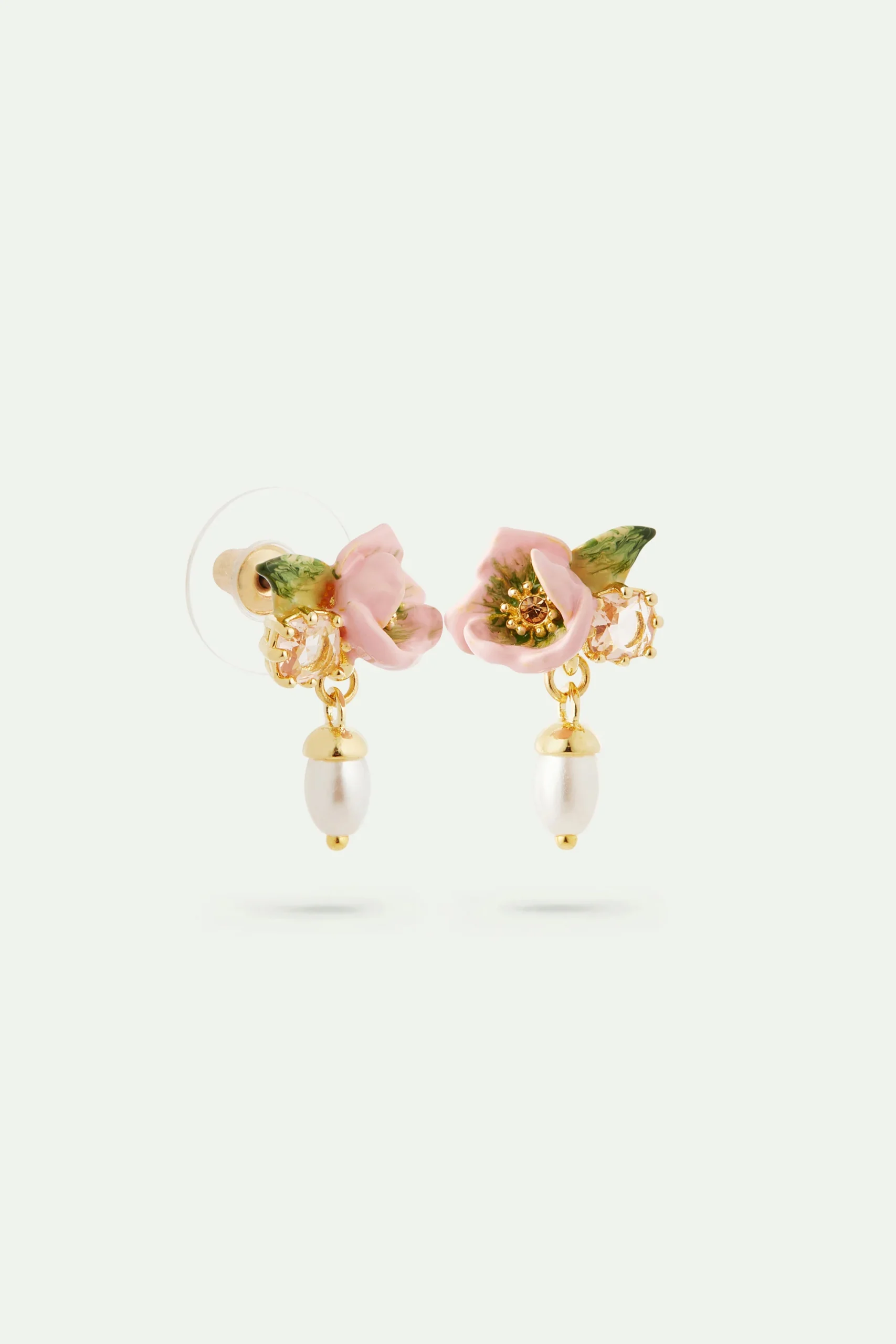 Paire de boucles d’oreilles tiges, fleur d’hellébore rose accompagnée d’une perle fantaisie blanche. La collection Velours d’Hiver honore les dernières fleurs de la saison comme le perce-neige et l’hellébore. Un bouvreuil virevolte dans cette collection aux montages travaillés.