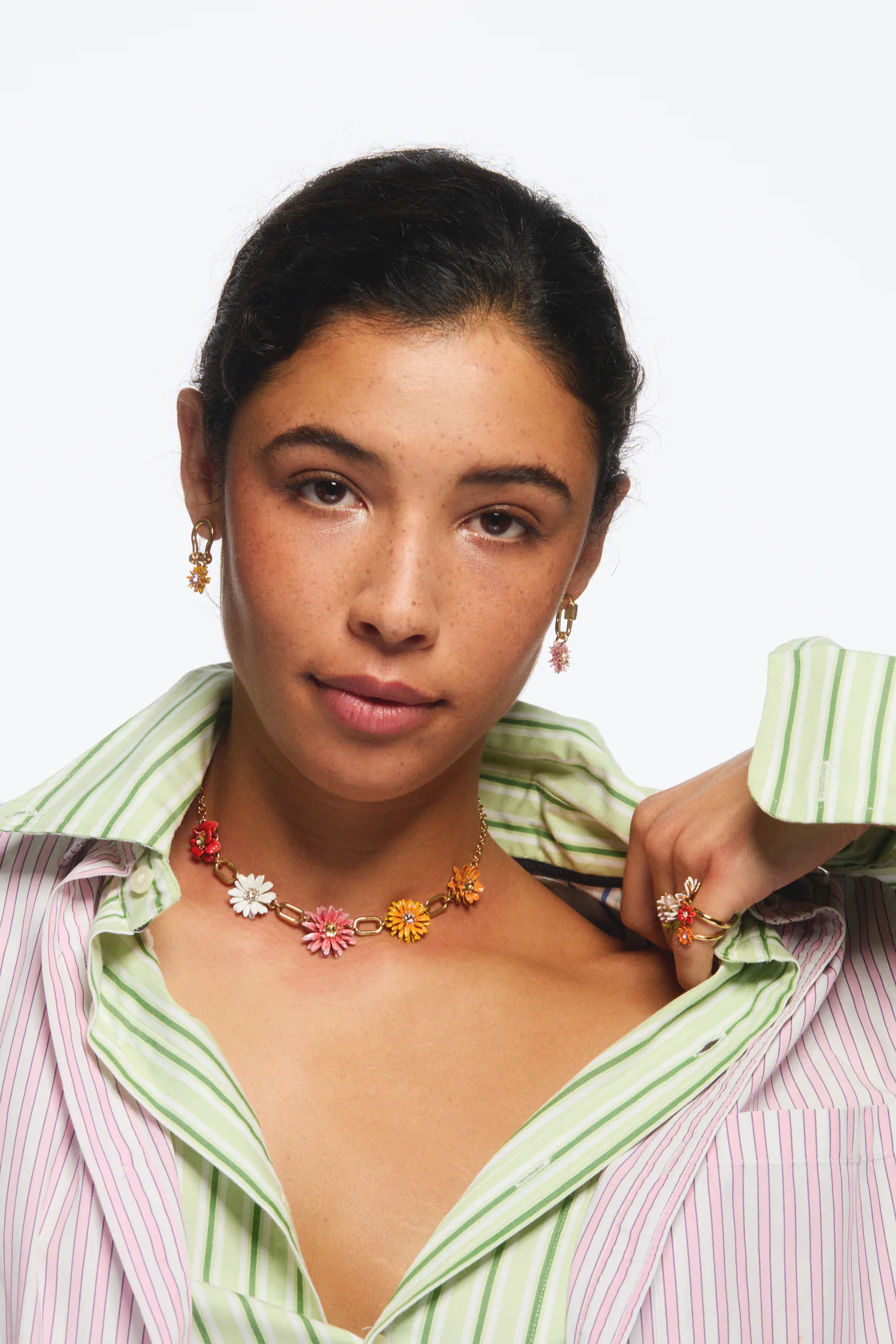 Boucles d’oreilles tiges rose et orange en forme de mousqueton en laiton doré à l’or fin, fleur pendante peinte à la main et ornée de cristaux. La collection Fleur de Roche invite à une promenade en montagne à la belle saison. Les fleurs naïves et simples poussent parmi les roches. Des détails techniques empruntés à l’escalade se mêlent aux bijoux.