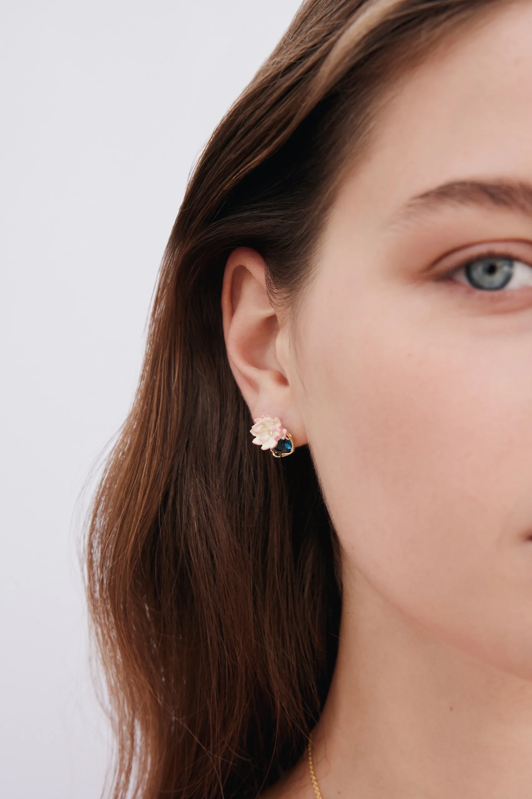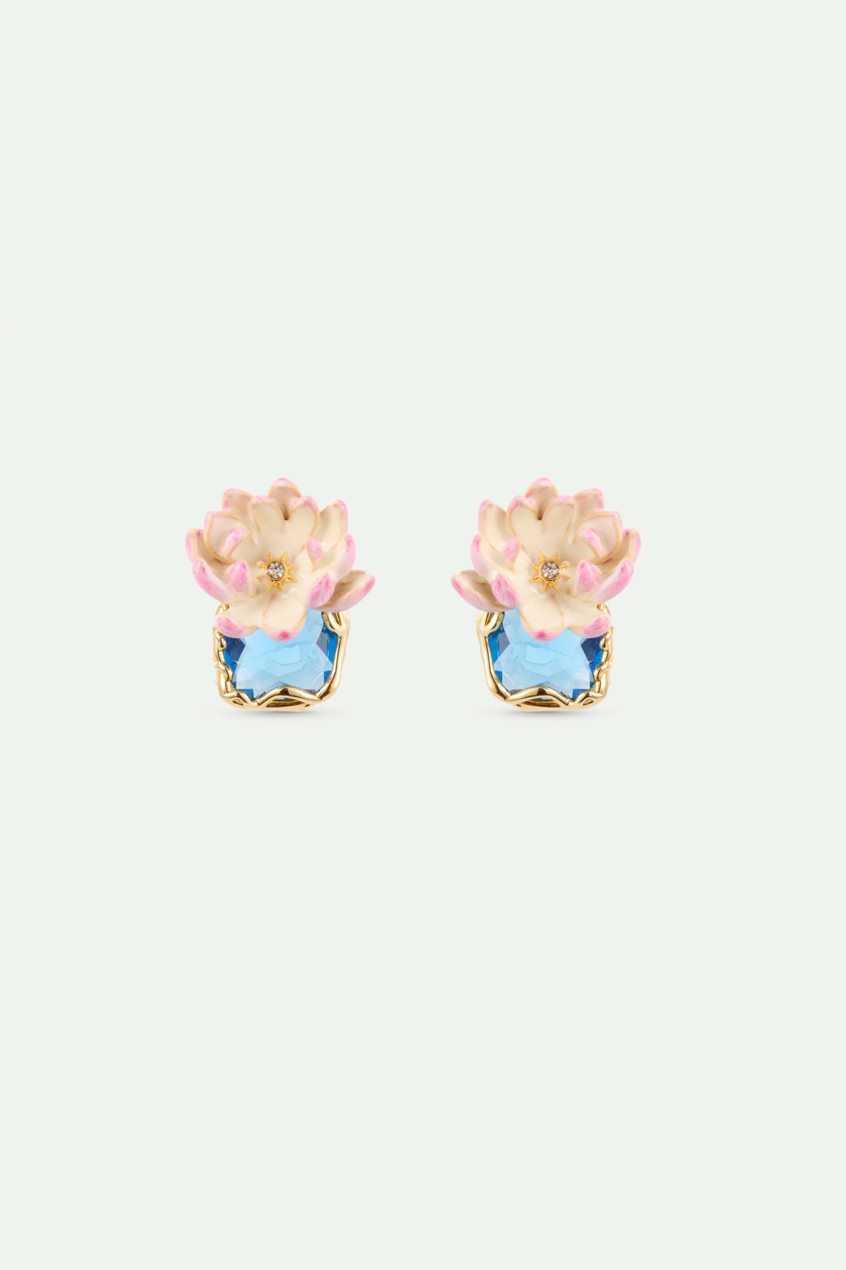Boucles d’oreilles tiges fleur de nymphéa rose peinte à la main ornée d’un cristal blanc, pierre ronde bleue claire sertie en laiton doré d’inspiration végétal.