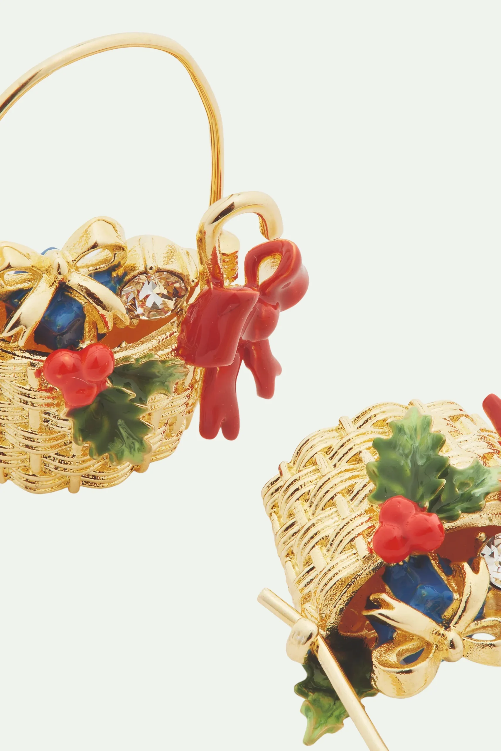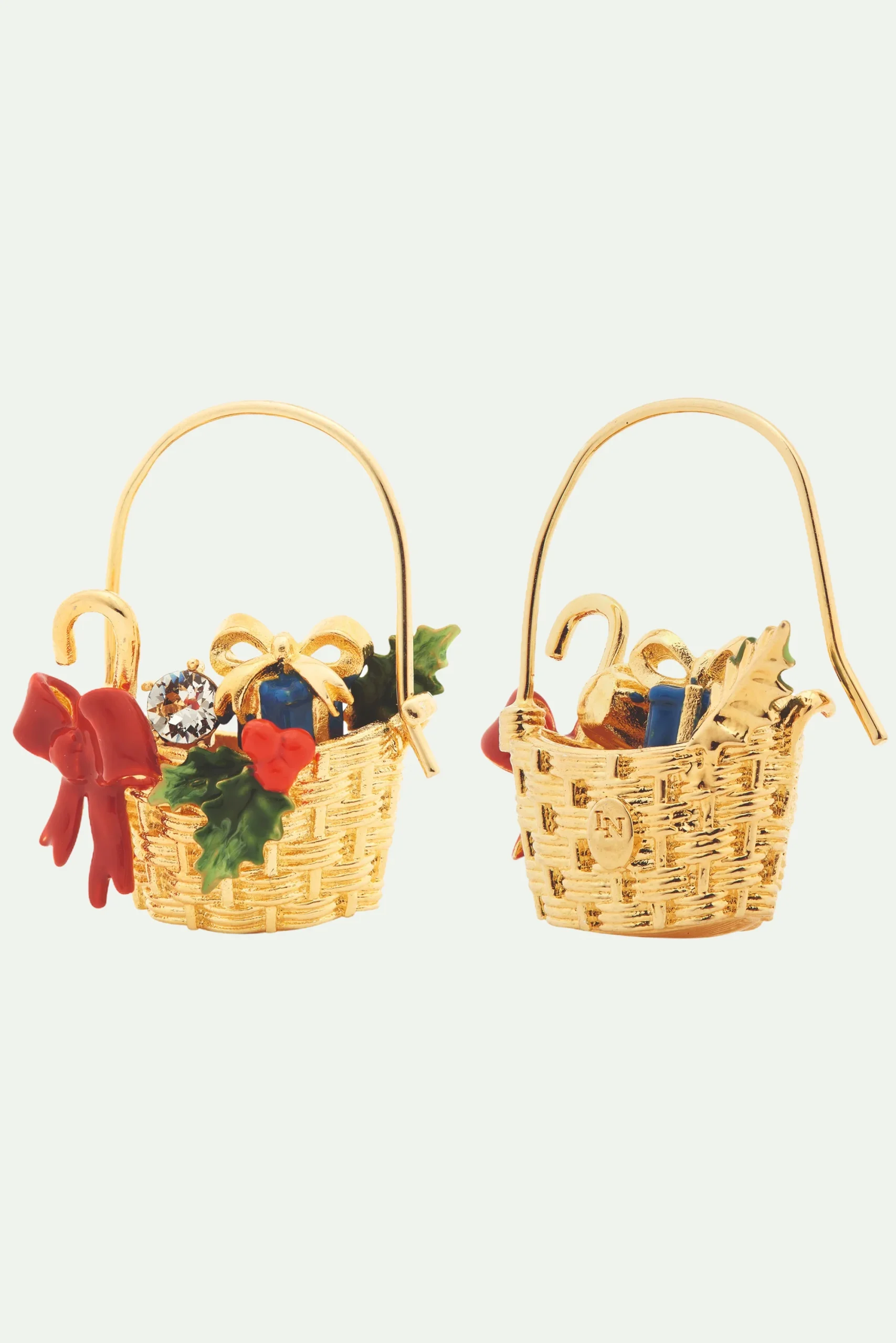 Pour Noël, La Maison Les Néréides vous propose cette collection de bijoux haute fantaisie spécialement conçus pour cette saison attendue par les petits et les grands. Découvrez, sur cette paire de boucles d’oreilles tiges, des paniers tressés garnis de cadeaux, de houx, d’un petit ruban rouge et d’un magnifique verre facetté. Pour une tenue en harmonie avec cette période de fêtes, adoptez ce bijou de créateur haut en couleur pour impressionner vos proches. Boucles d’Oreilles Tiges : Laiton doré à l’or fin, peint à la main et verre facetté.