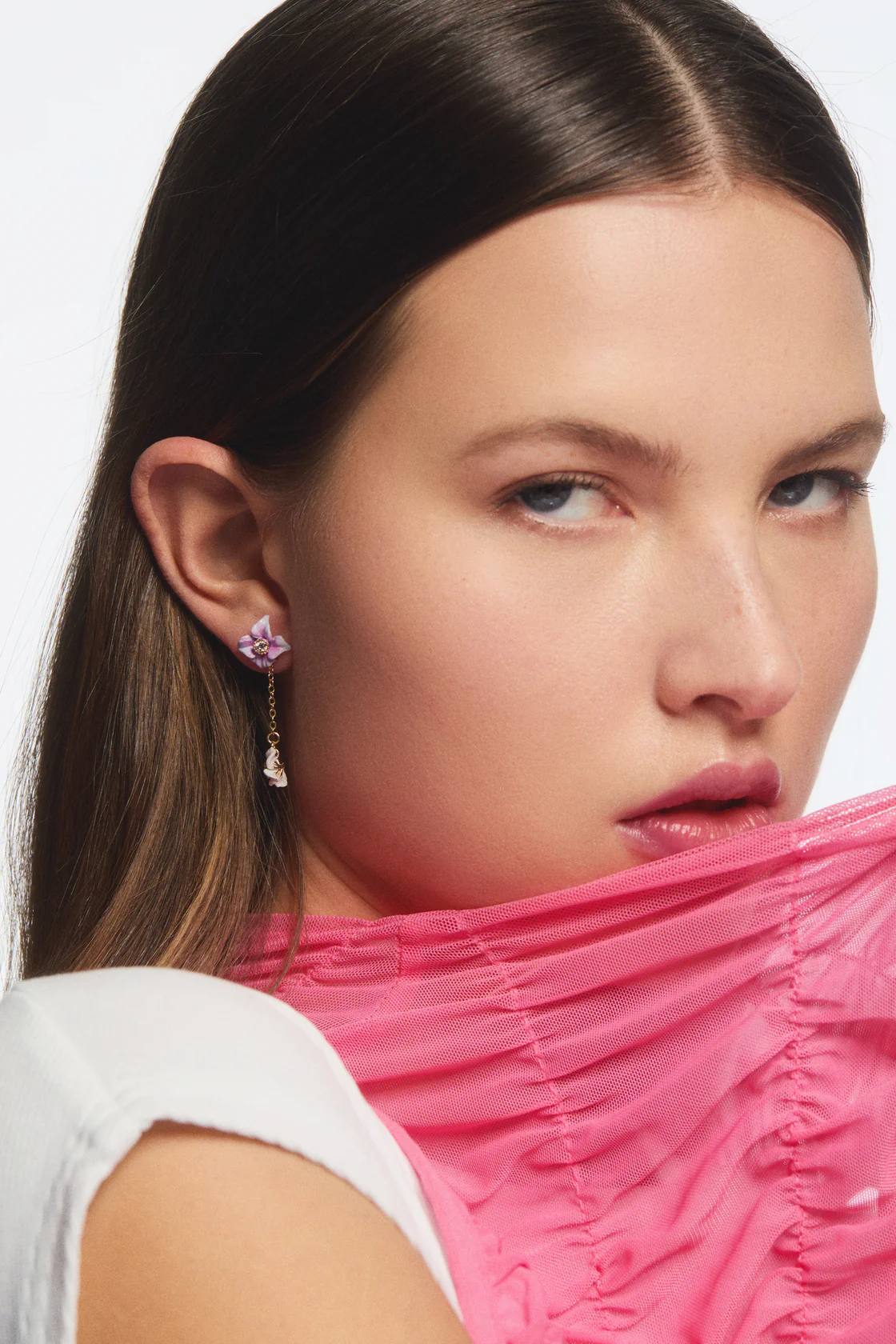 Boucles d’oreilles pendantes, fleurs d’hortensia peintes à la main, cristaux facettés blancs en leur centre, chaine en laiton doré à l’or fin. Cette collection célèbre avec douceur la fleur d’hortensia, qui nous époustoufle et nous envoûte et les jardins d’été.