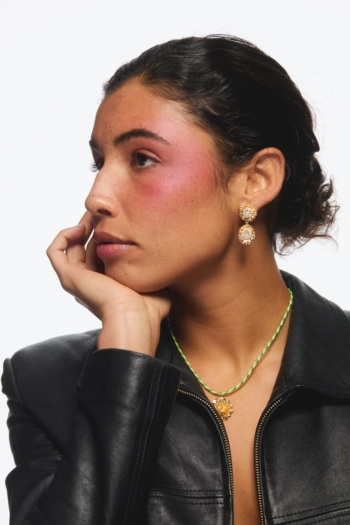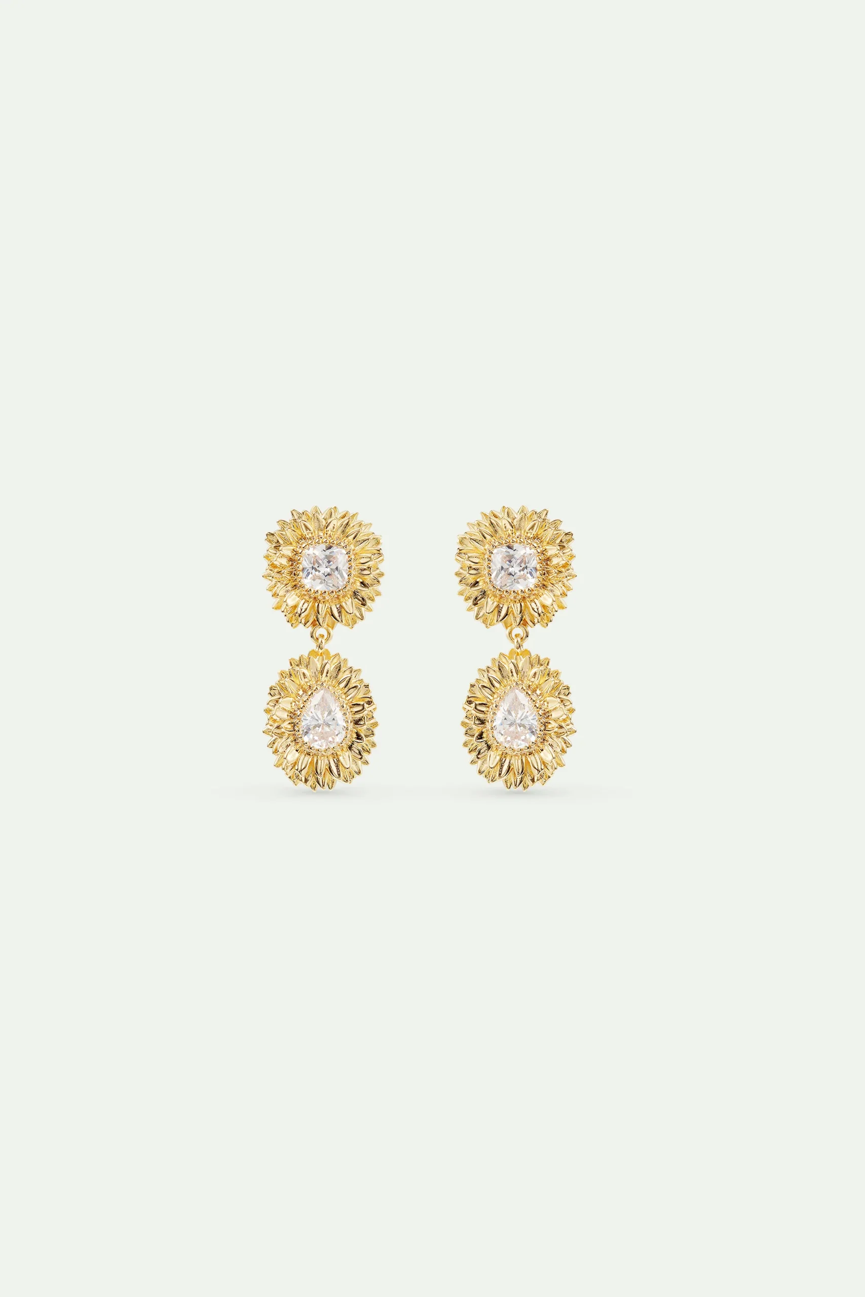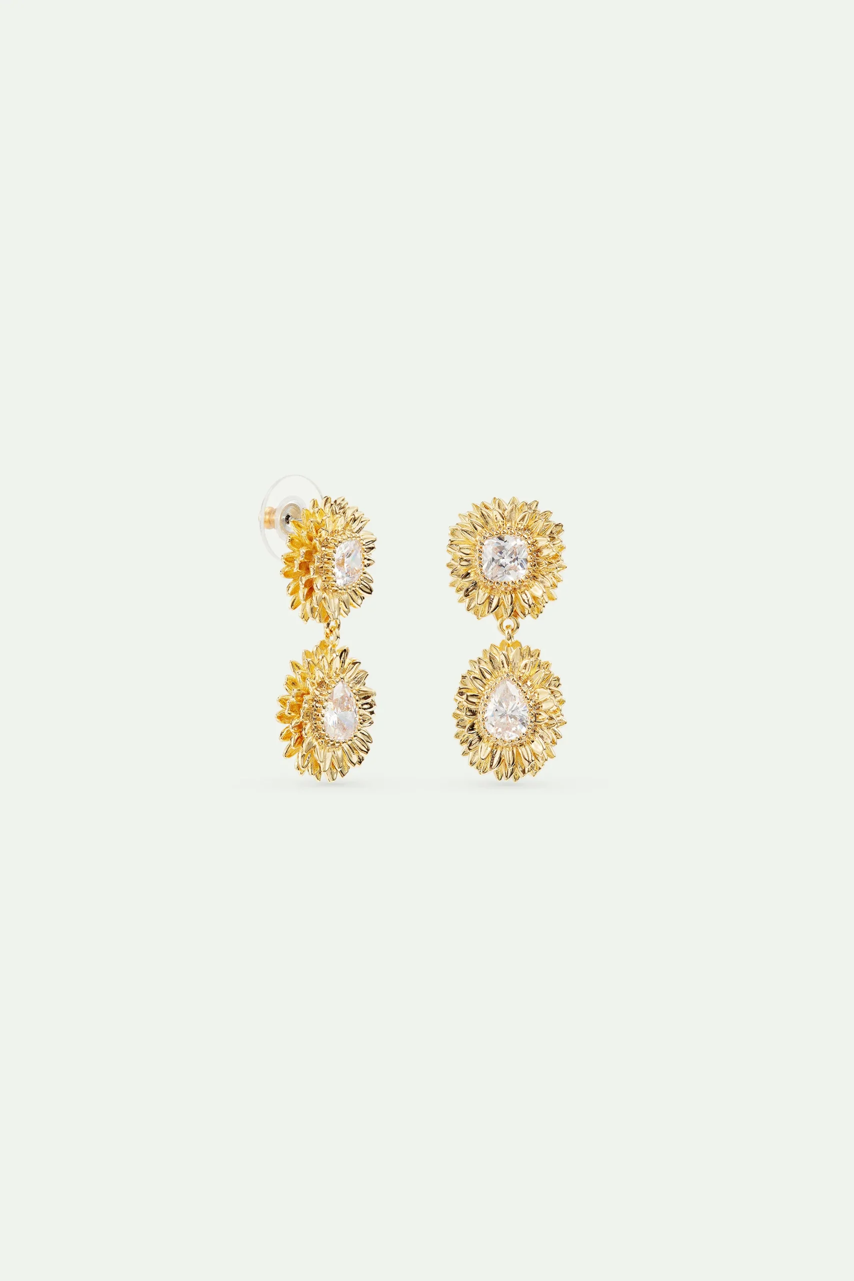 Boucles d’oreilles tiges pendantes, pierre taillée ornées de pétales de pissenlit en laiton doré à l’or fin.