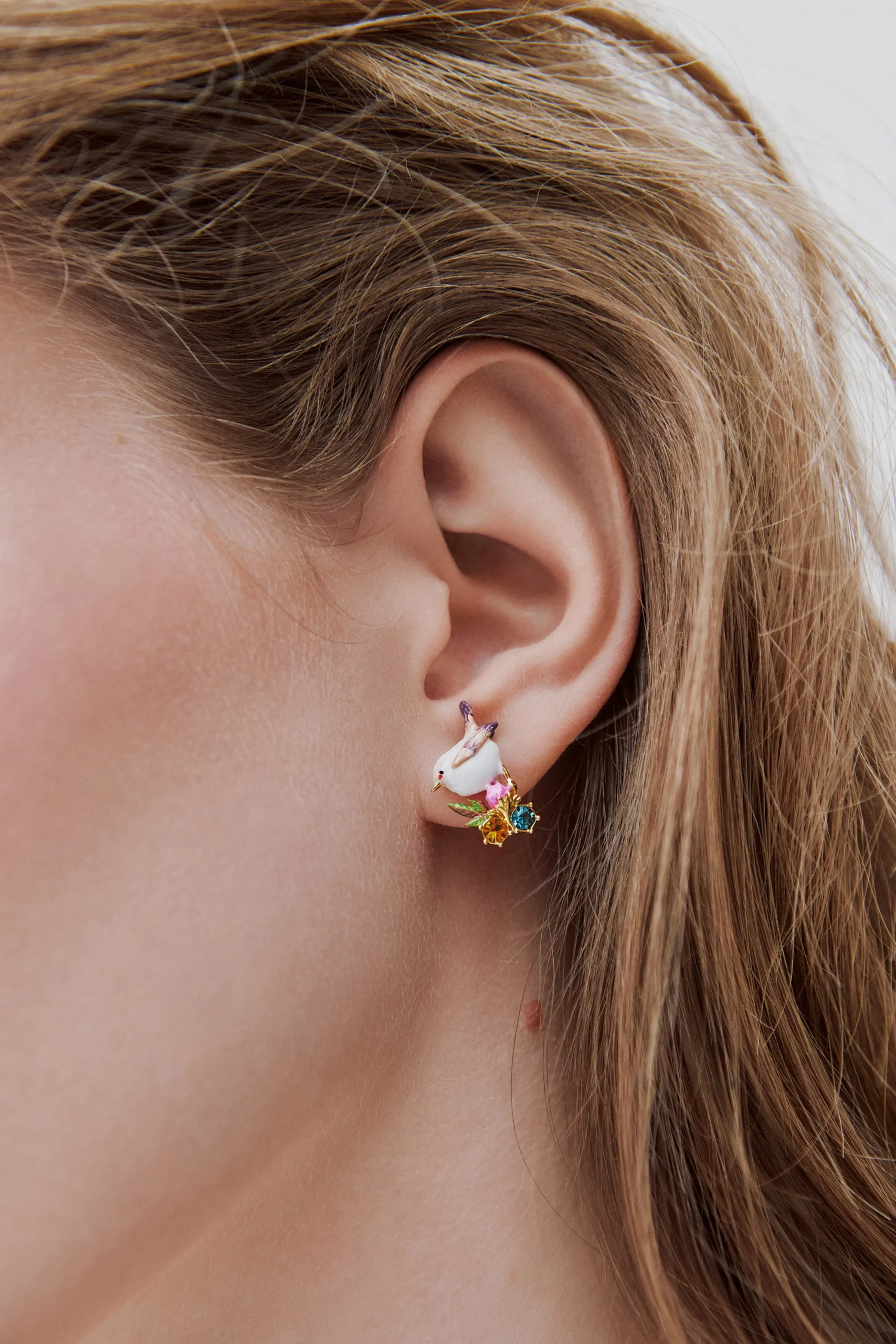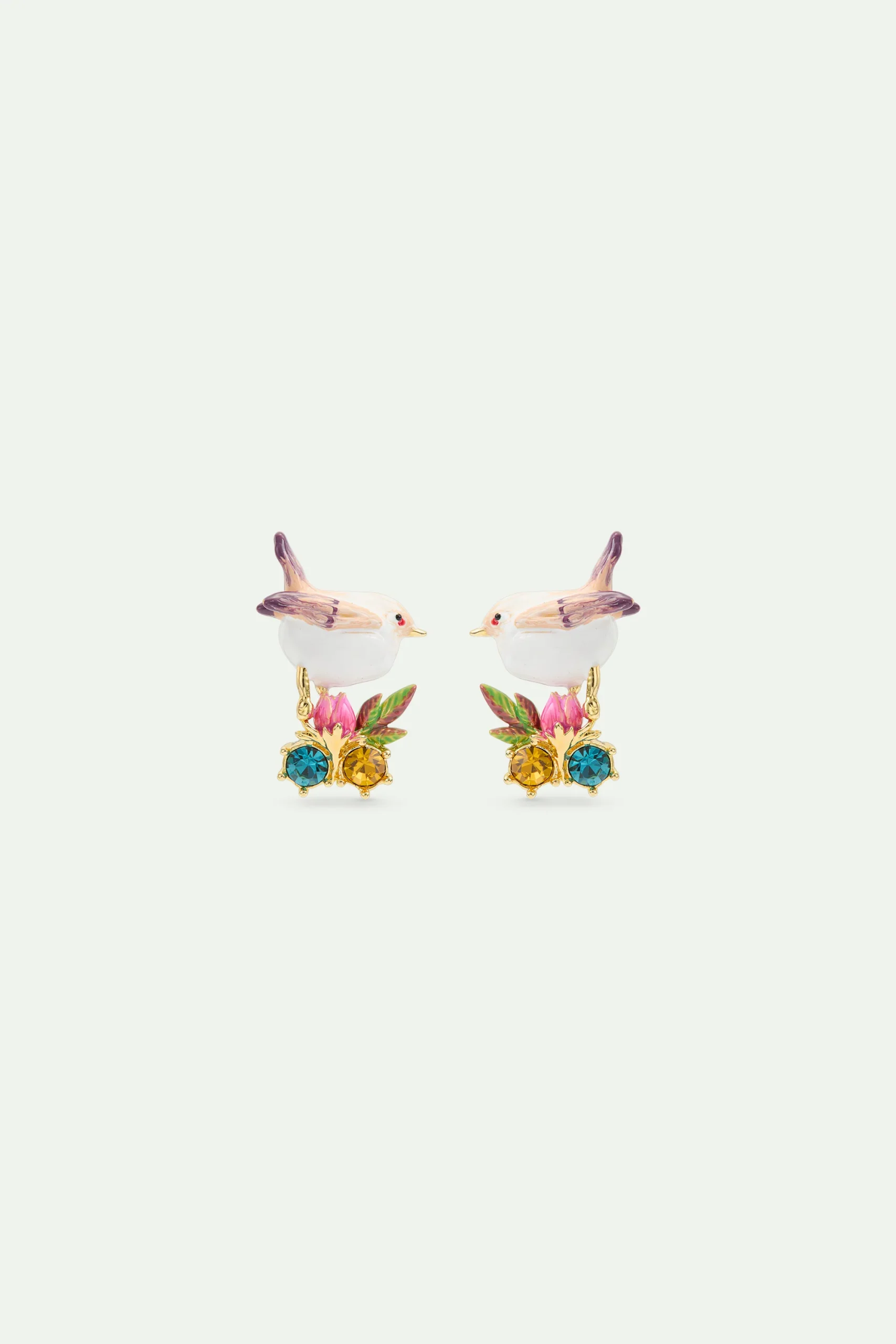 Boucles d’oreilles puces oiseau blanc ‘plectrophane des neiges’ peint à la main, bouton de rose et cristaux facettés bleu et jaune.