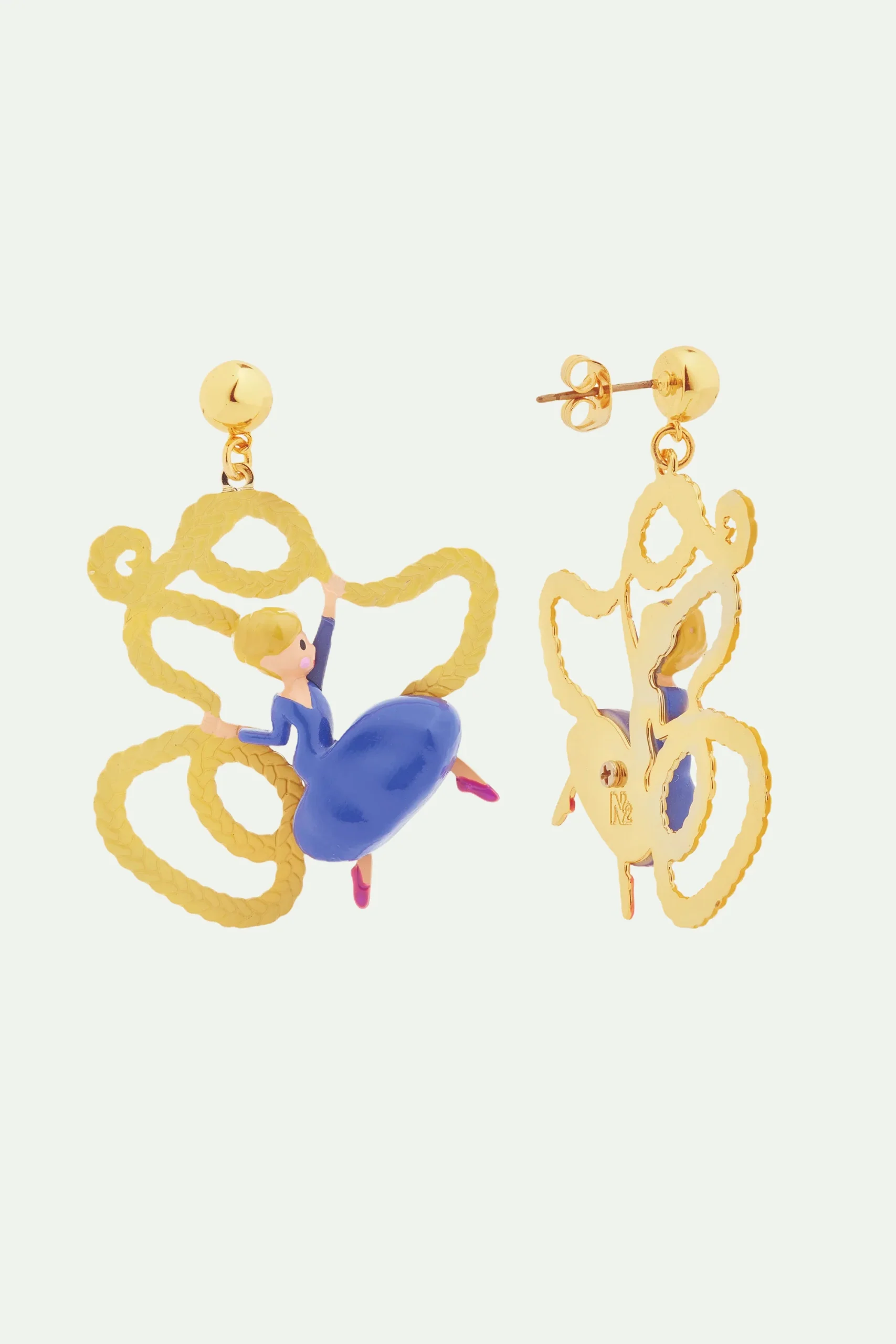 Laissez-vous séduire par ces boucles d’oreilles tiges qui mettent en scène la princesse Raiponce et sa belle chevelure blonde, aussi splendide qu’imposante. Habillée d’une robe bleue, Raiponce s’amuse avec ses longs cheveux en attendant avec impatience l’arrivée de son prince charmant. Plongez dans la douce nostalgie de l’enfance en portant ces magnifiques boucles d’oreilles haute fantaisie de N2 by Les Néréides, qui s’inspirent du célèbre conte des frères Grimm. Boucles d’Oreilles Tiges : Laiton doré à l’or fin, résine peinte à la main et estampe ajourée.