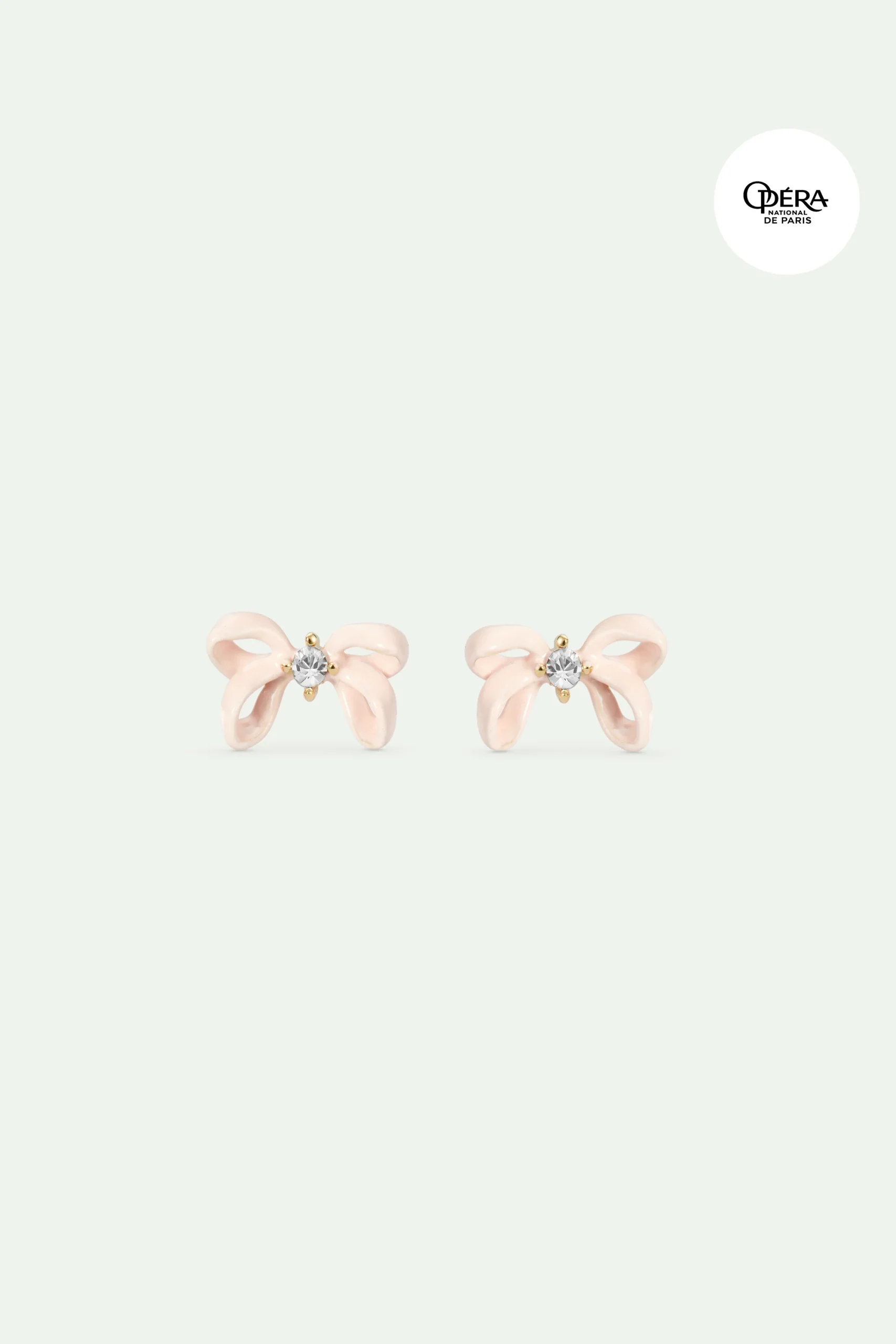 Petites boucles d’oreilles tiges ruban rose pâle peint à la main orné d’un cristal facetté. Pour célébrer les 150 ans du Palais Garnier, la Maison les Néréides a conçu des parures imprégnées de l’esprit de l’Opéra.