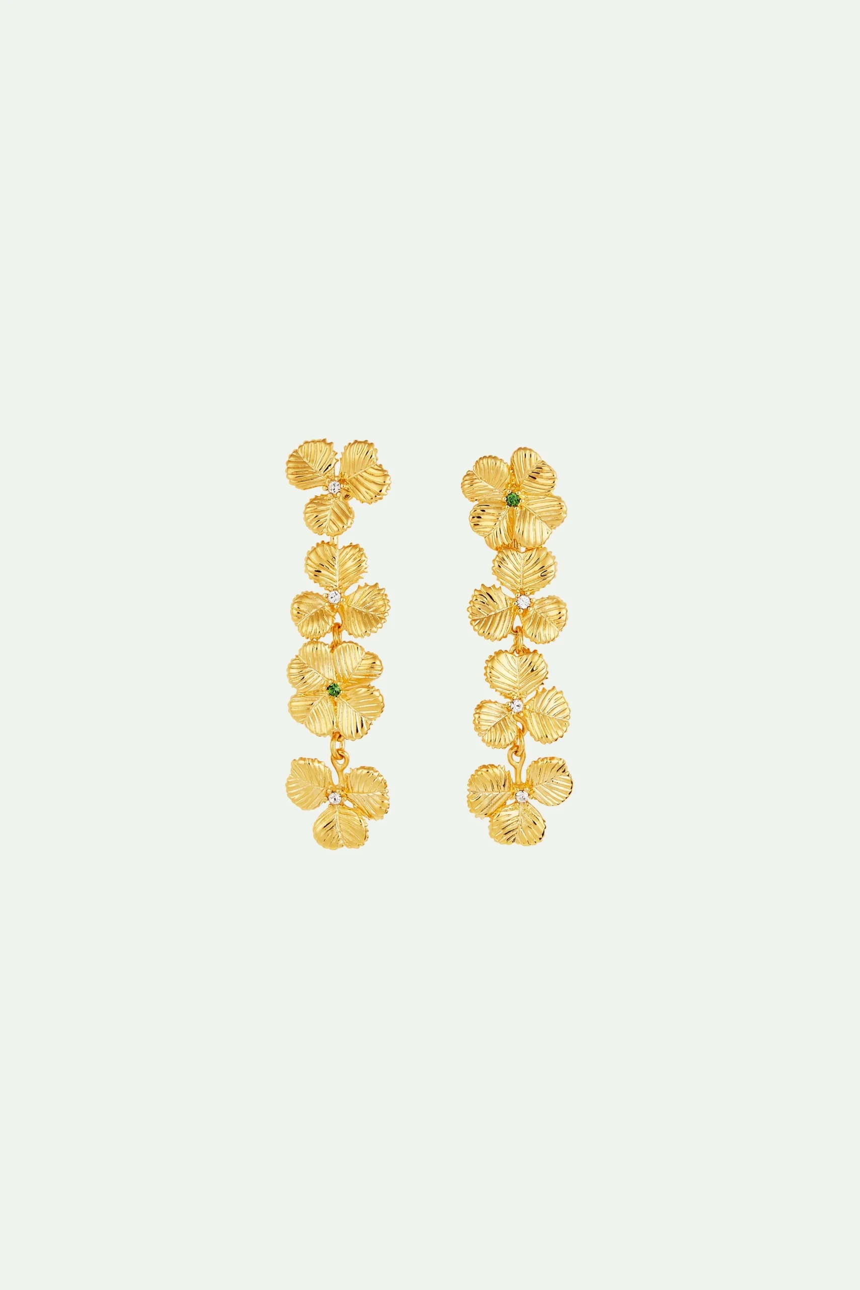 La Maison Les Néréides vient compléter sa collection Fleur de Chance avec ces boucles d’oreilles tiges pendantes pour femme et ses trèfles dorés. Un trèfle à quatre feuilles et petit cristal vert se trouve sur le haut de la boucle d’oreille gauche, un second est caché au milieu de trois autres trèfles à trois folioles dorées à l’or fin. Portez-les seuls ou associés à d’autres bijoux d’inspiration trèfle pour créer une parure de bijoux élégants. Boucles d’Oreilles Tiges : Trèfles en laiton texturé doré à l’or fin, coeurs brillants en cristaux taillés multicolores et chaîne maille forçat
