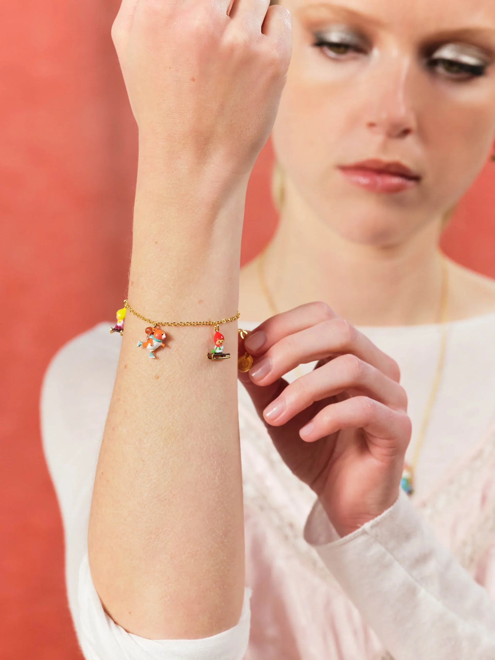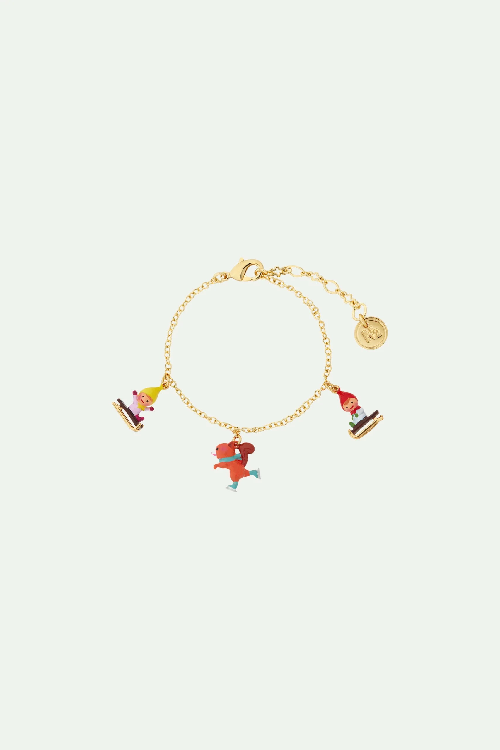 Écureuil sur patins à glaces et enfants nains de jardin assis sur une luge se retrouvent sur ce bracelet charm’s de N2 by Les Néréides. Ce bijou de créateur haut en couleur fait partie de la collection Les Champimignon, une adorable famille de nains de jardin que l’on aime suivre dans ses aventures de saison en saison. Assortissez ce bracelet porte-bonheur au collier plastron nains et patins à glace pour un look plein de malice. Bracelet Fin : Laiton doré à l’or fin, peint à la main, charm’s et chaîne.