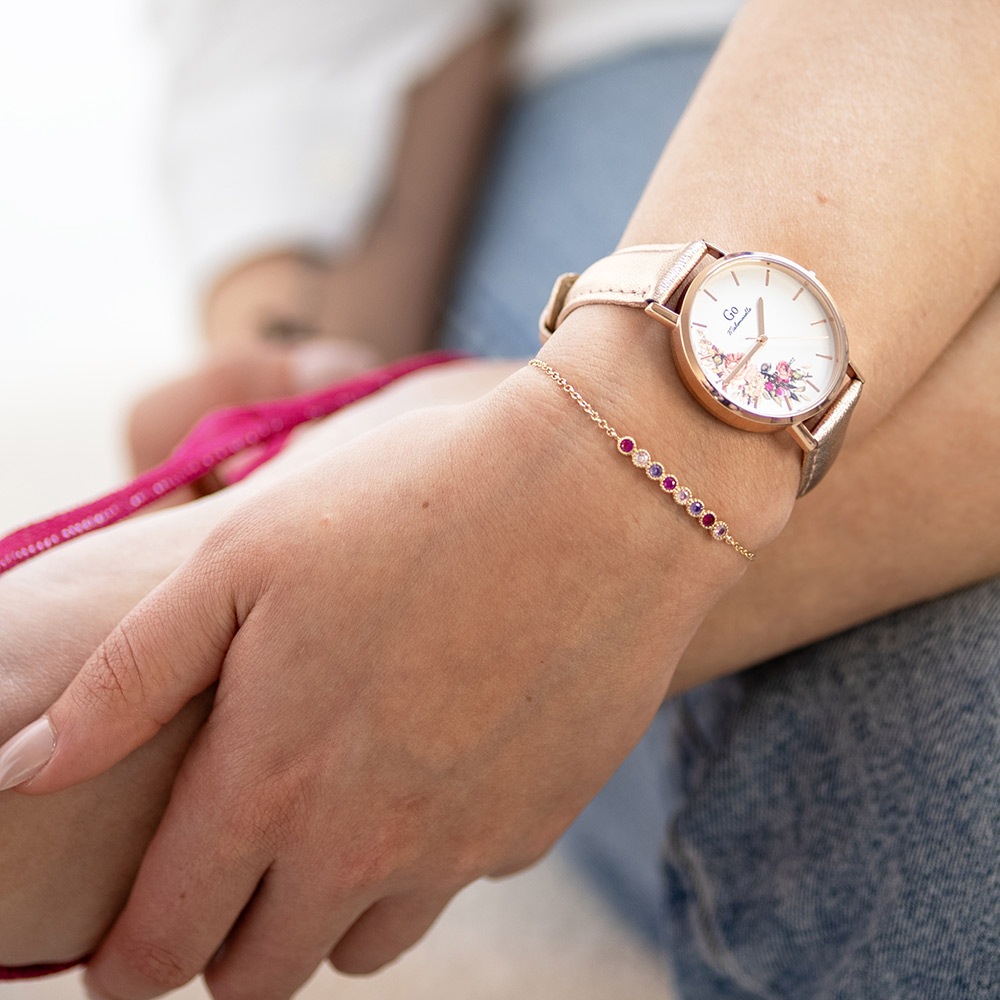 Ce bracelet 605618 unique et éclatant au mariage harmonieux entre le plaqué or et le Violet, rose, fuschia sera un vrai coup de cœur ! Il est un cadeau idéal à se faire à soi-même ou à offrir pour célébrer l’instant présent. Vous pourrez l’assortir à votre guise à nos colliers et boucles d’oreilles .