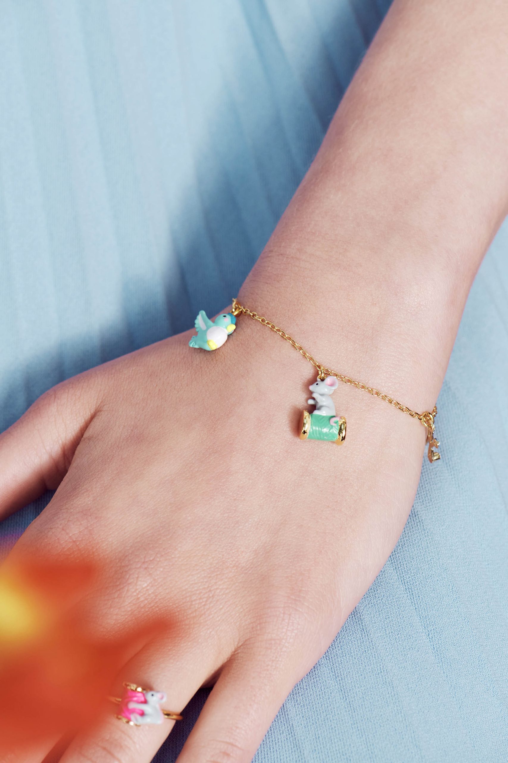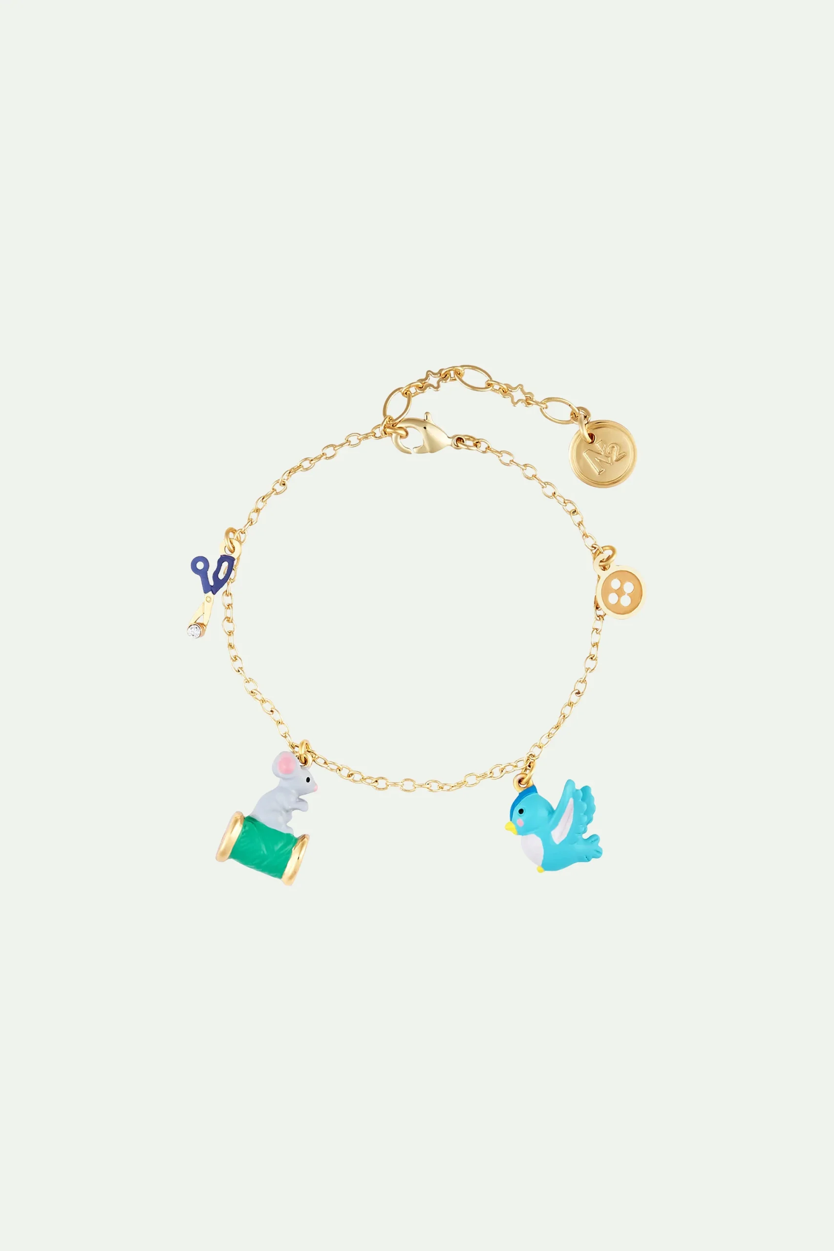 Ce bracelet fin met en avant les éléments du conte Cendrillon : le bouton, l’oiseau, la souris et la bobine de fil ainsi que la paire de ciseau. La collection de bijoux fantaisie Permission de Minuit vous replonge en enfance