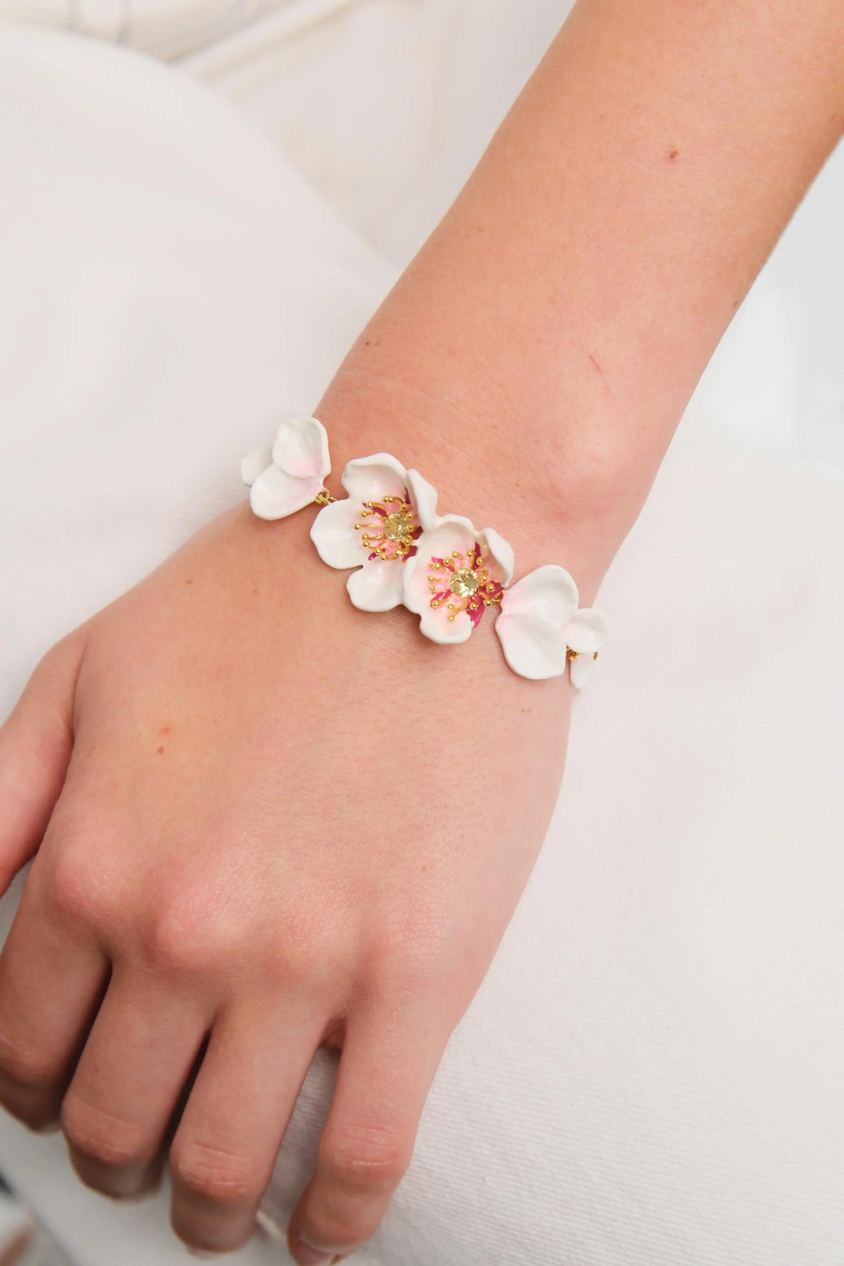 Symbole printanier par excellence, la fleur de cerisier s’invite dans la collection Hanami de la Maison Les Néréides et propose un bracelet fin avec ses fleurs de cerisier ouvertes et pétales mobiles. Vous pourrez le combiner en parure avec les boucles d’oreilles assorties. Bracelet Fin : Laiton doré à l’or fin et peint à la main, rehaussé de cristaux et d’oxydes de zirconium multicolores