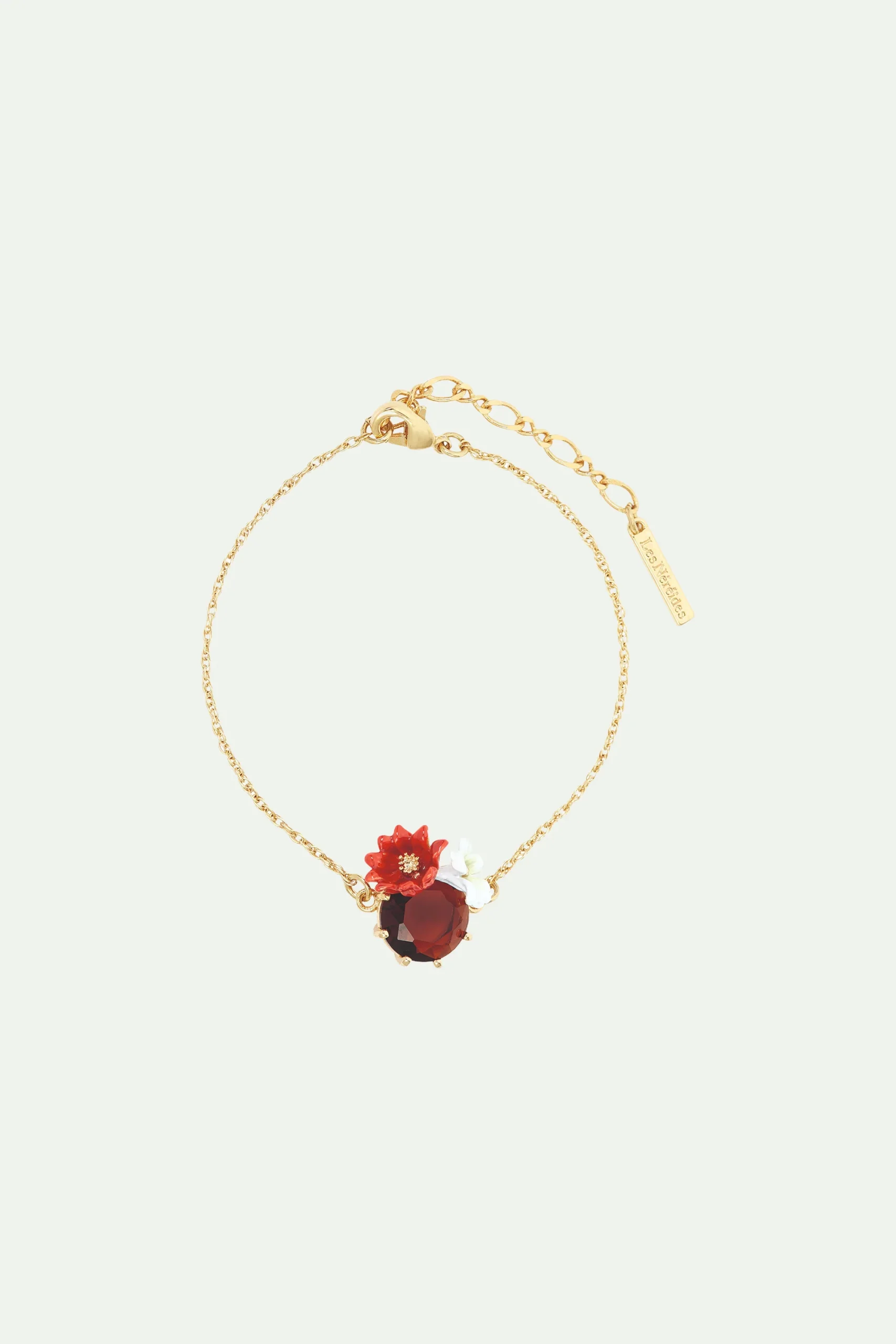 Le bracelet fin fleurs et verre facetté rond présente un élément central sur une chaîne fine dorée. Ce bijou est composé d’une fleur rouge apposée sur une pierre ronde, accompagnée d’une fleur blanche. La pierre de couleur bronze ajoute de la luminosité à ce bracelet aux teintes automnales, faisant partie de la collection Tableau de Maître. Cette collection offre des bijoux originaux représentant la brièveté de la vie à travers des éléments tels que des papillons, des fleurs, des clémentines et des scarabées. Bracelet Fin : Laiton doré à l’or fin peint à la main et verre facetté.
