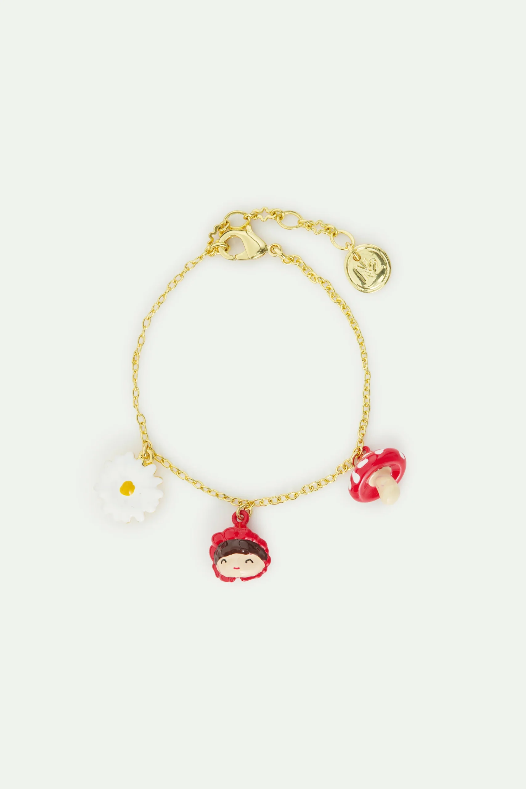 Bracelet fin en laiton doré à l’or fin, Le Petit Chaperon rouge, marguerite et champignon délicatement peints à la main. N2 imagine une collection de pantins articulés inspirés de contes célèbres. Ces bijoux ludiques et poétiques réinterprètent des personnages emblématiques : Le Petit Chaperon rouge, le Loup, Blanche-Neige, Alice et le Lapin blanc, pour célébrer les moments précieux avec une touche d’enchantement.