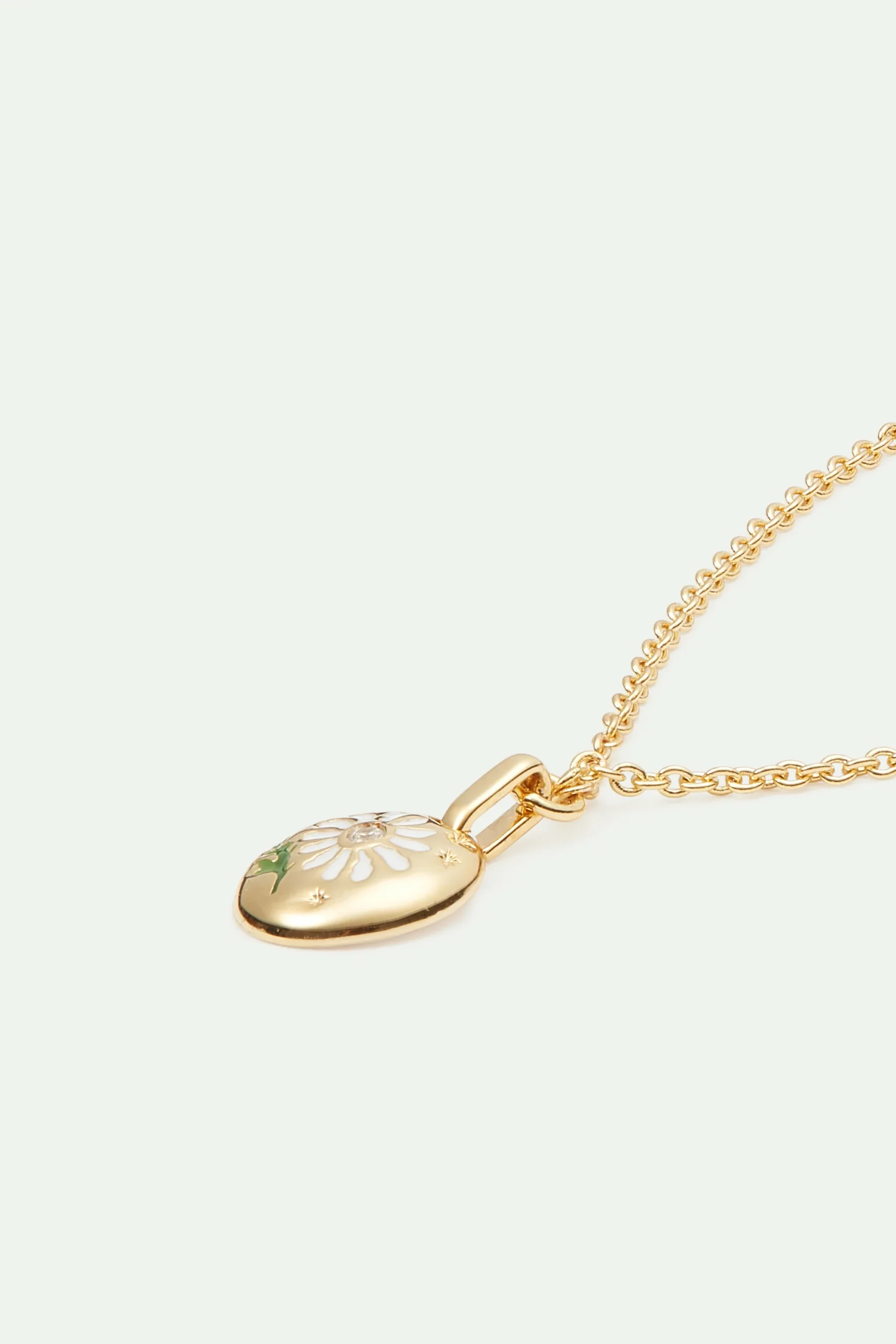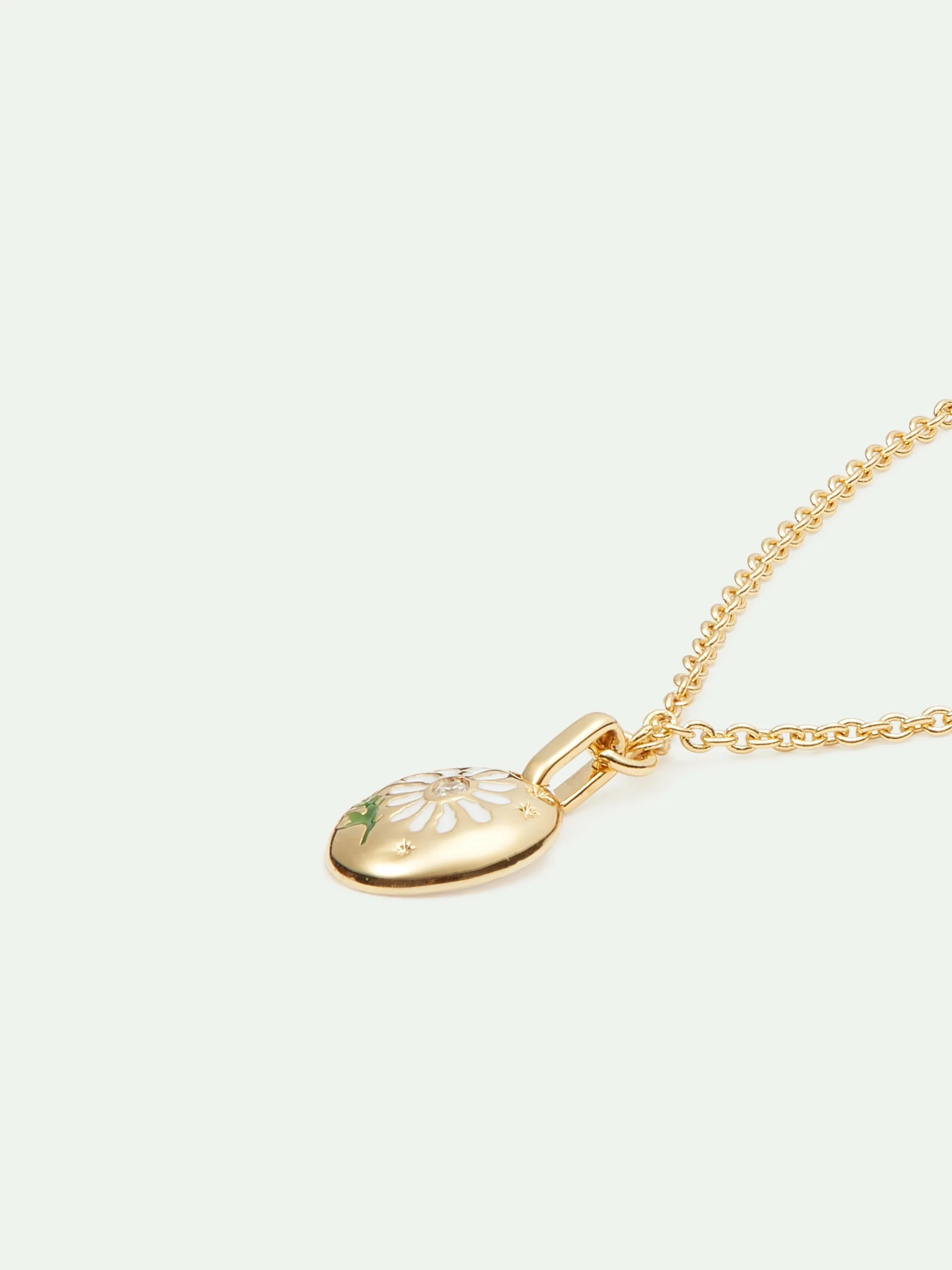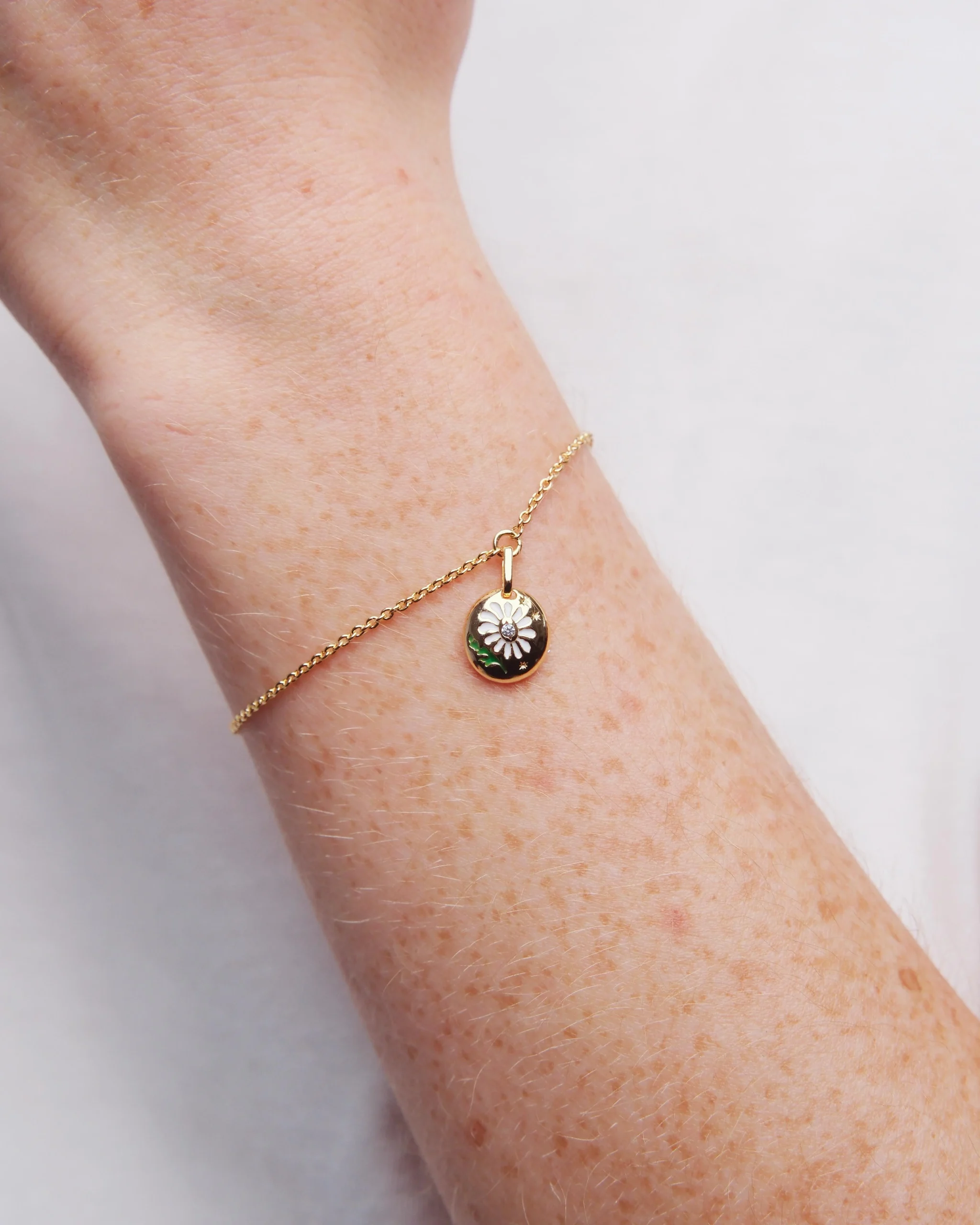 Bracelet fin, fleur de marguerite délicatement peinte à la main ornée d’un cristal d’oxyde de zirconium en son centre, monture en laiton doré à l’or fin. En s’inspirant des bijoux de sentiment, populaires dans l’Angleterre du XIXème siècle, Les Néréides propose une nouvelle manière d’exprimer sa flamme à l’être aimé avec la collection Mon Petit Secret.