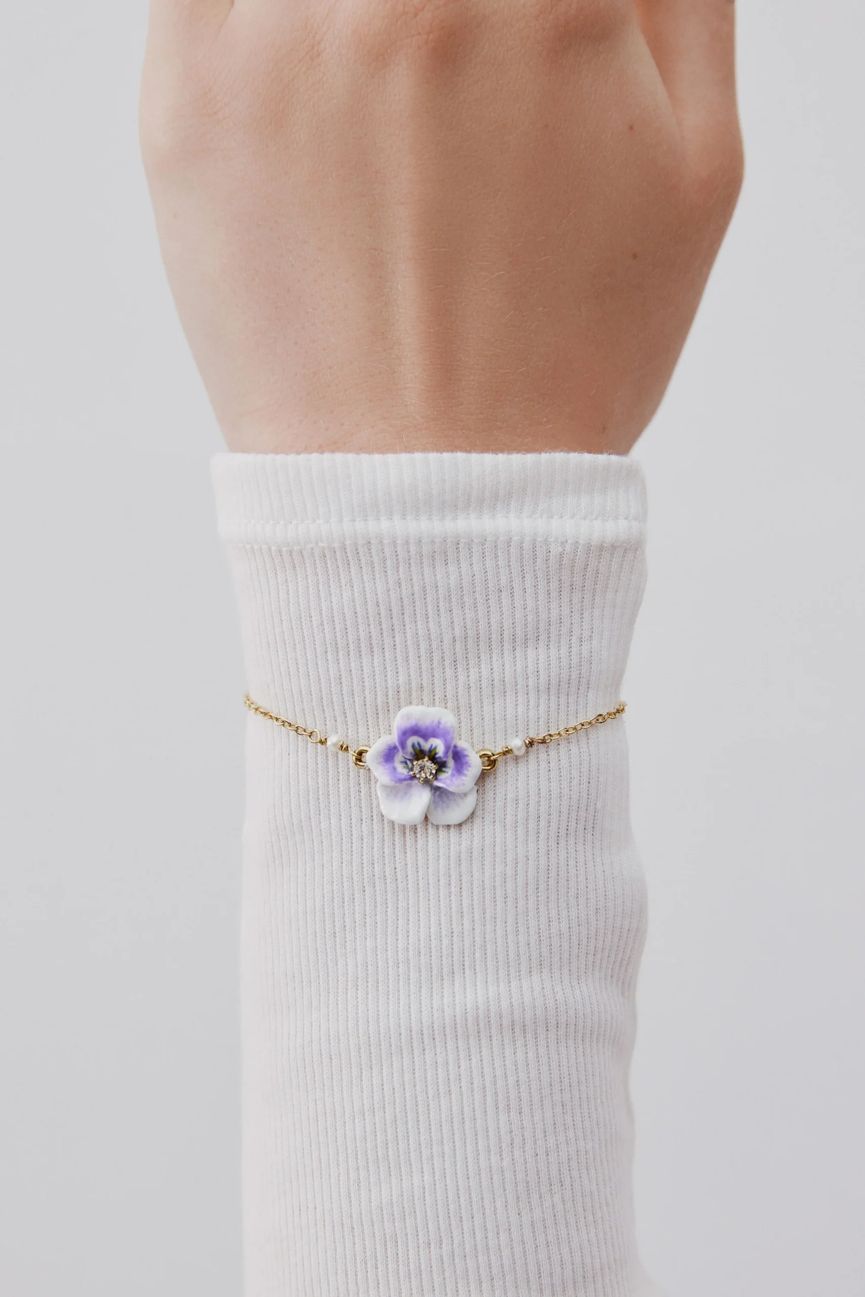 Bracelet fin pensée violette, cristal taillé et chaine perlée en laiton dorée à l’or fin. La collection Mille Pensées décline la douceur d’une pensée intemporelle, avec ses fleurs aux teintes crépusculaires mêlant bleu et violet. À la frontière du jour et de la nuit, ces bijoux capturent l’émotion muette et l’apaisement, révélant ce que seul le cœur sait dire.