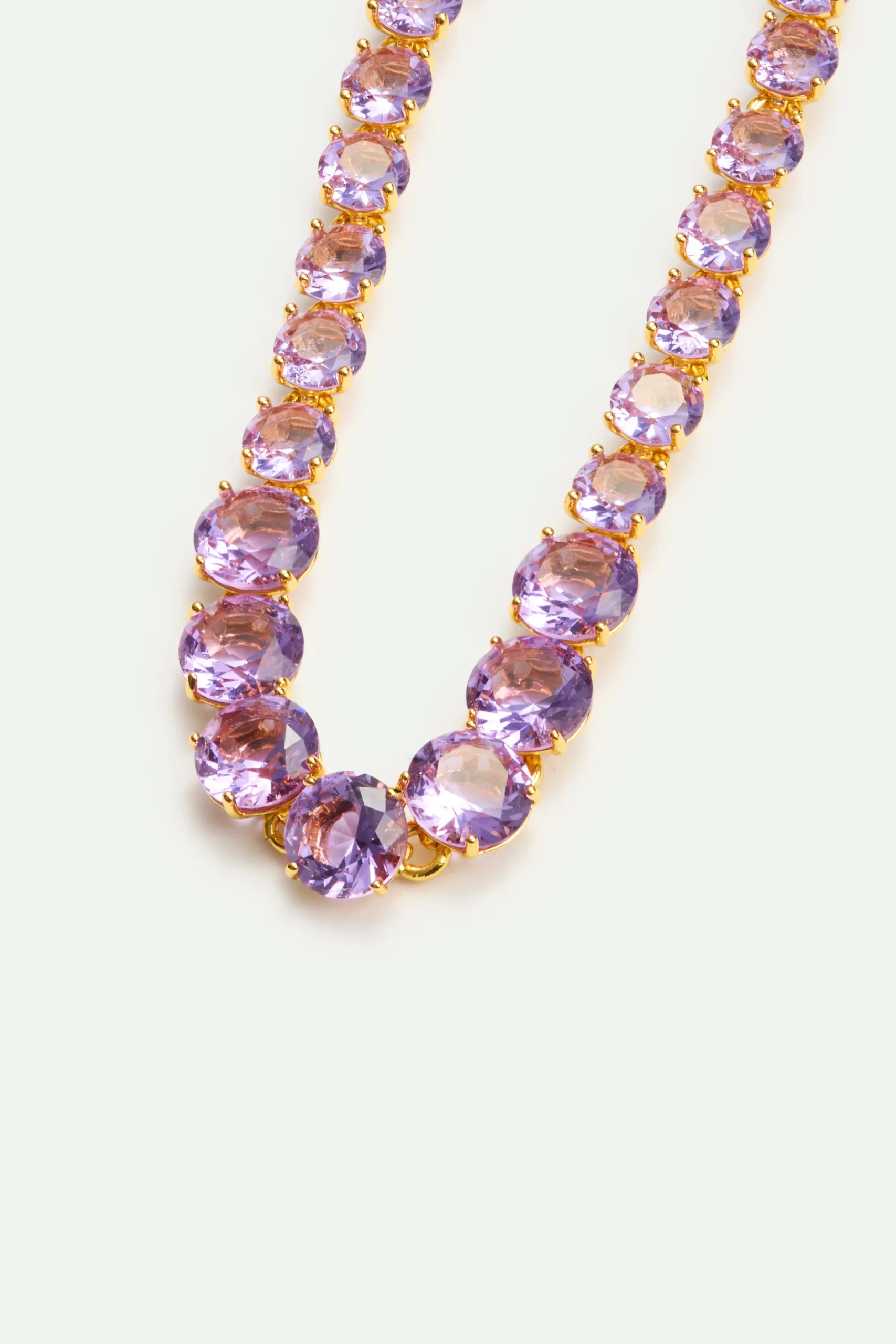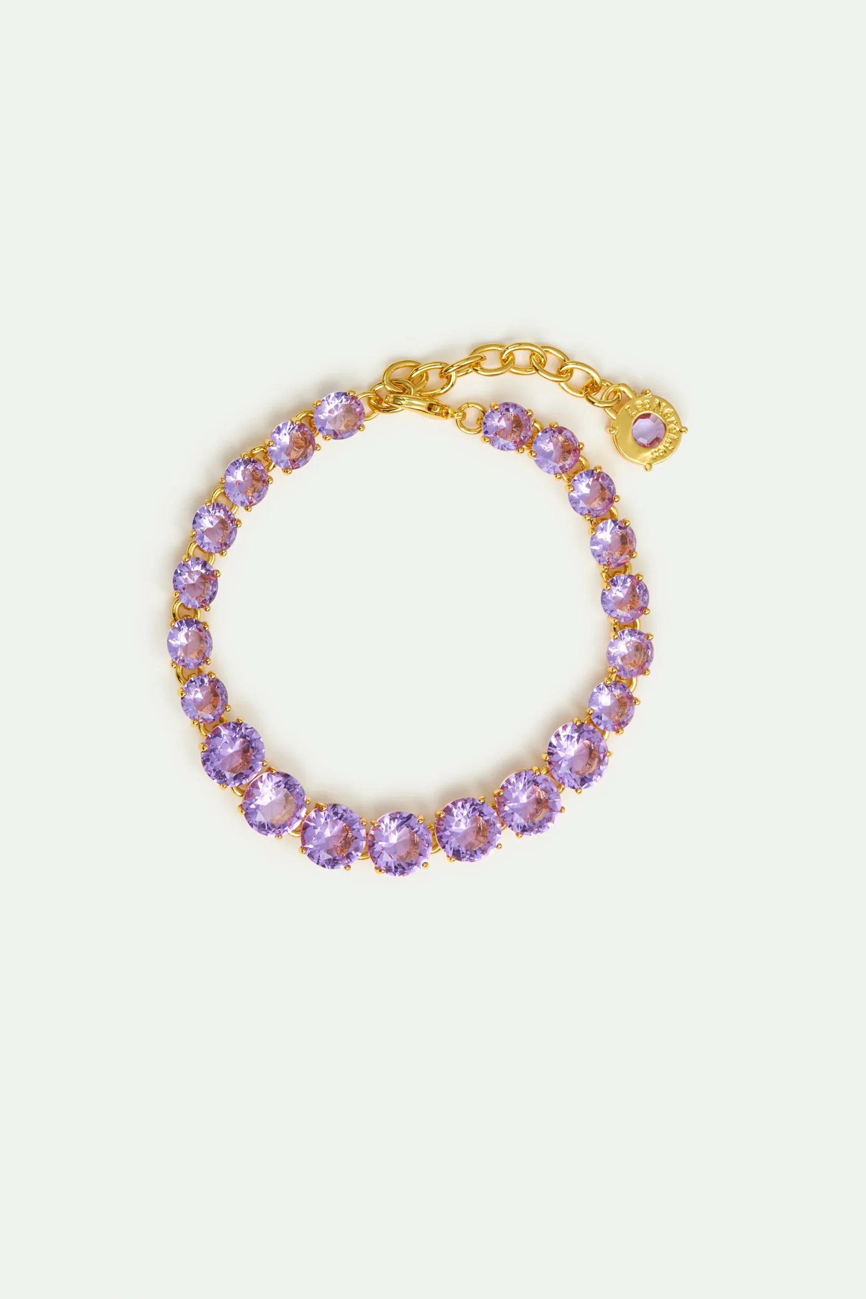 Bracelet fin doré, rang de pierres en verre facetté violet, détail de pierre pendante sur le fermoir, chaine et monture en laiton doré à l’or fin. L’élégante Diamantine se transpose cette année en Provence. La collection revêt le raffinement bucolique d’une prairie où marguerites et lavandes aromatiques ondulent dans le vent. Une parure féminine composée de pièces aux nuances douces qui nous renvoient à la quiétude d’un rayon de soleil rasant les tonnelles.