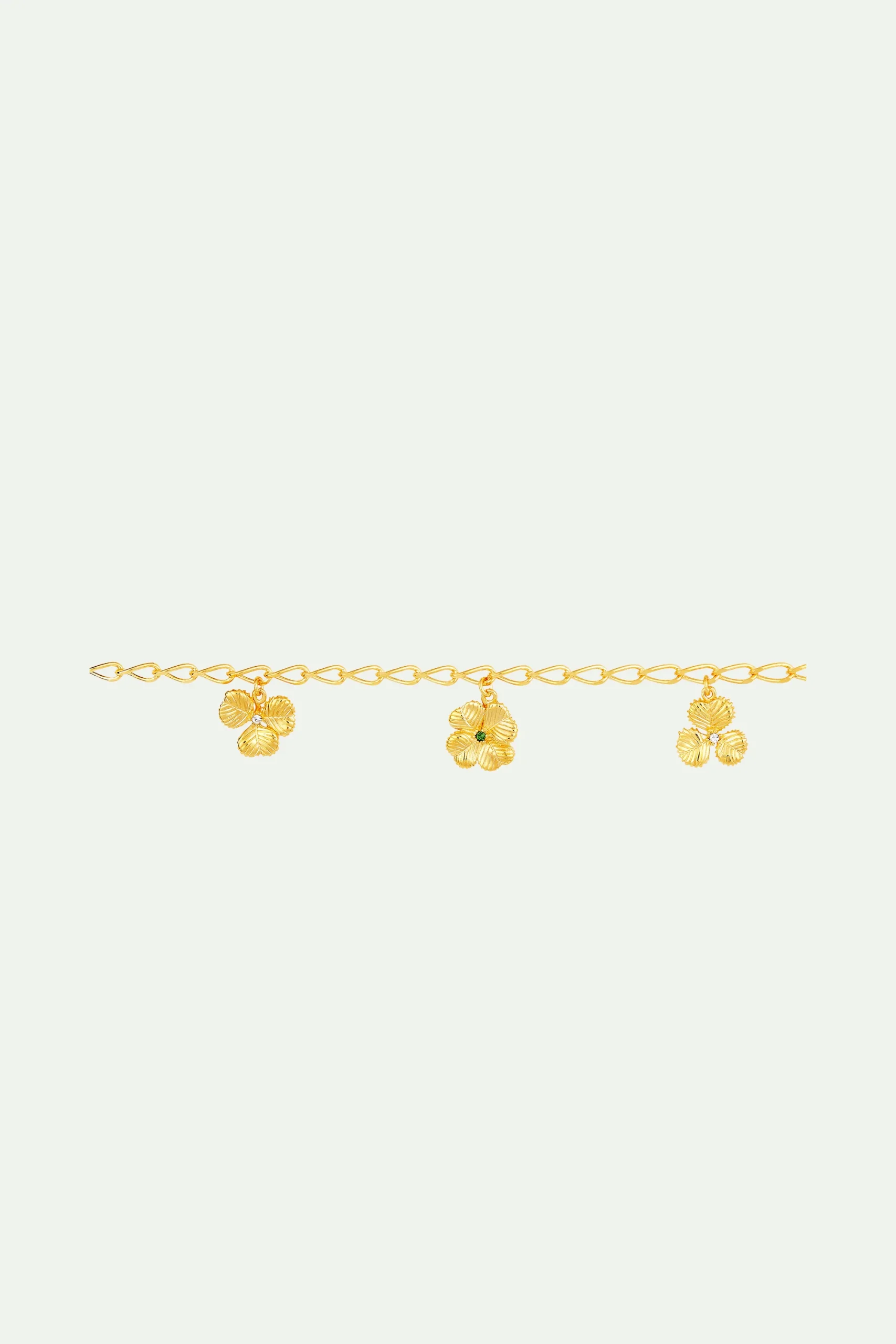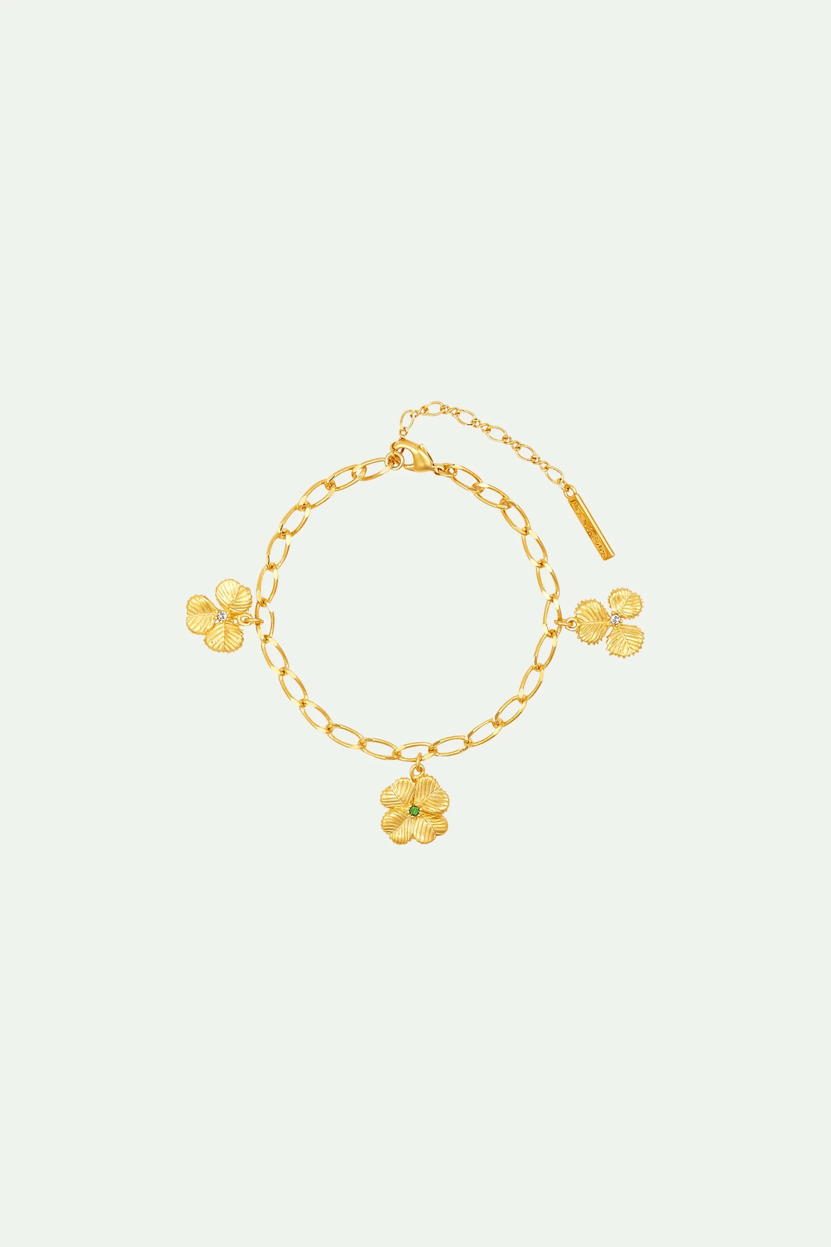 La collection Fleur de Chance propose différents bracelets à accrocher à votre poignet. Montés sur une chaine à larges maillons, un trèfle à quatre feuilles et cristal vert est entouré de deux trèfles à trois folioles et cristaux blancs. Mettez un peu de chance sur vos avant-bras avec les bijoux porte-bonheur Les Néréides. Bracelet Fin : Trèfles en laiton texturé doré à l’or fin, coeurs brillants en cristaux taillés multicolores et chaîne maille forçat