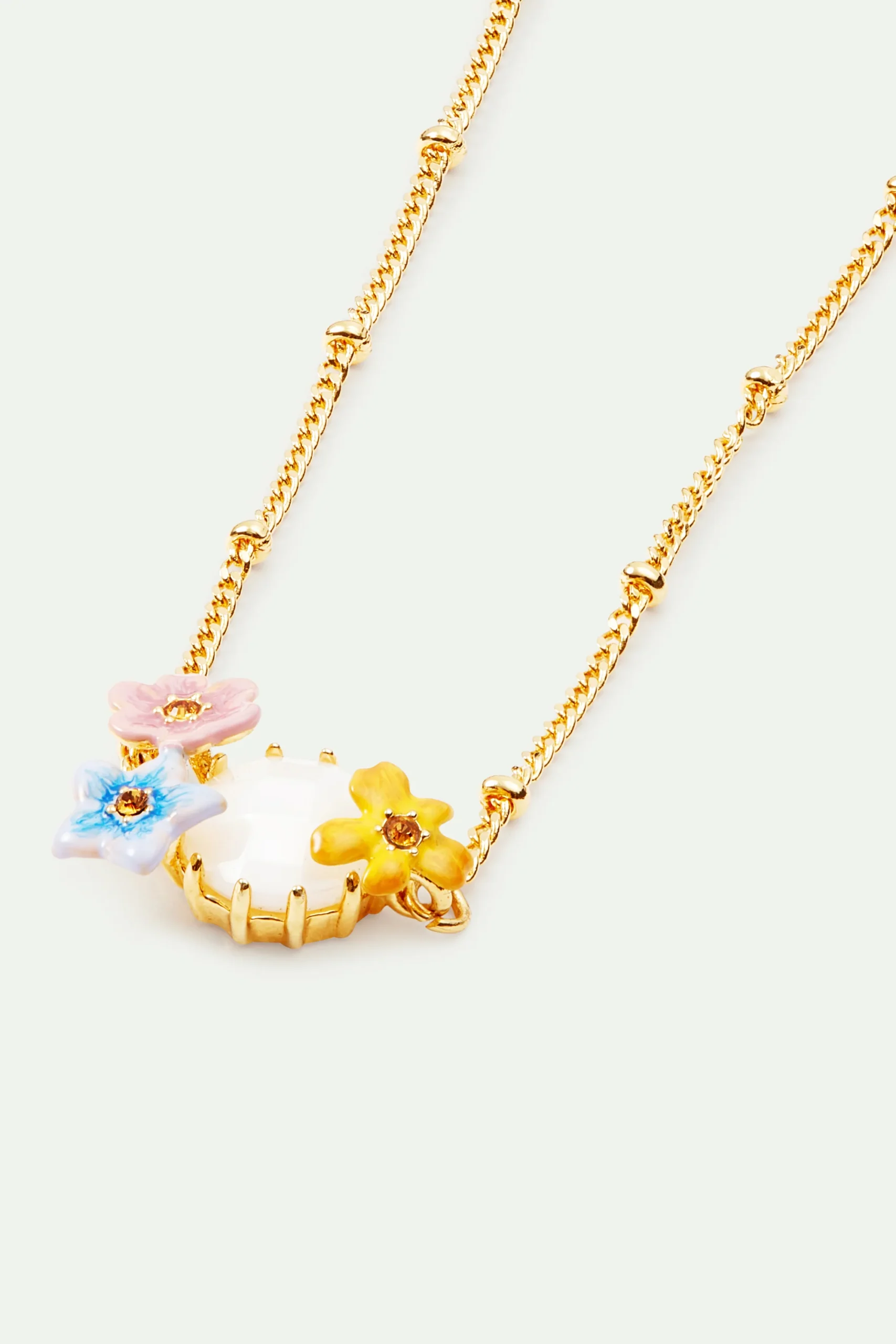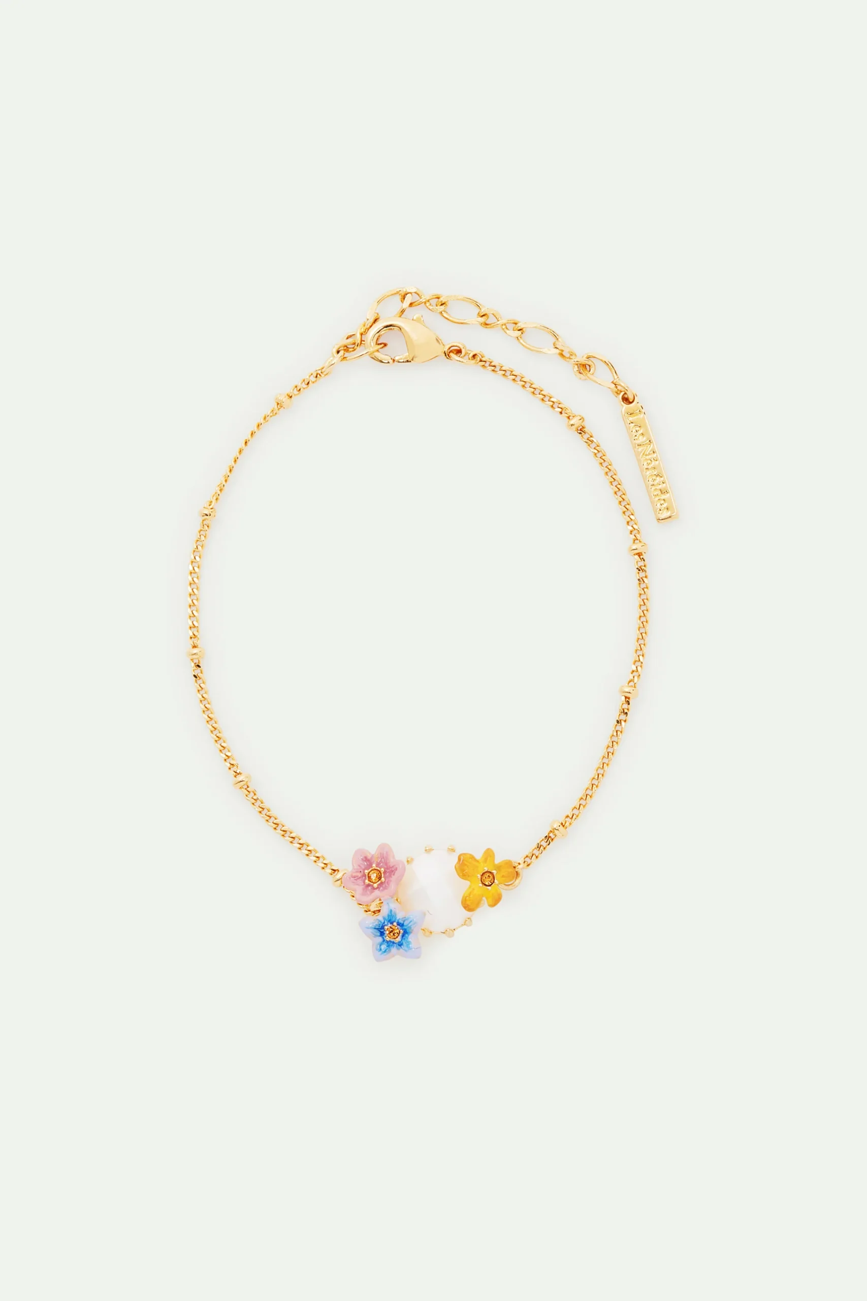 Bracelet fin, pierre en verre facetté effet nacré sur laquelle reposent trois fleurs de jasmin colorées. Le Temps des Rêves présente une fleur de solanum pour marquer une fraîcheur dans les compositions.