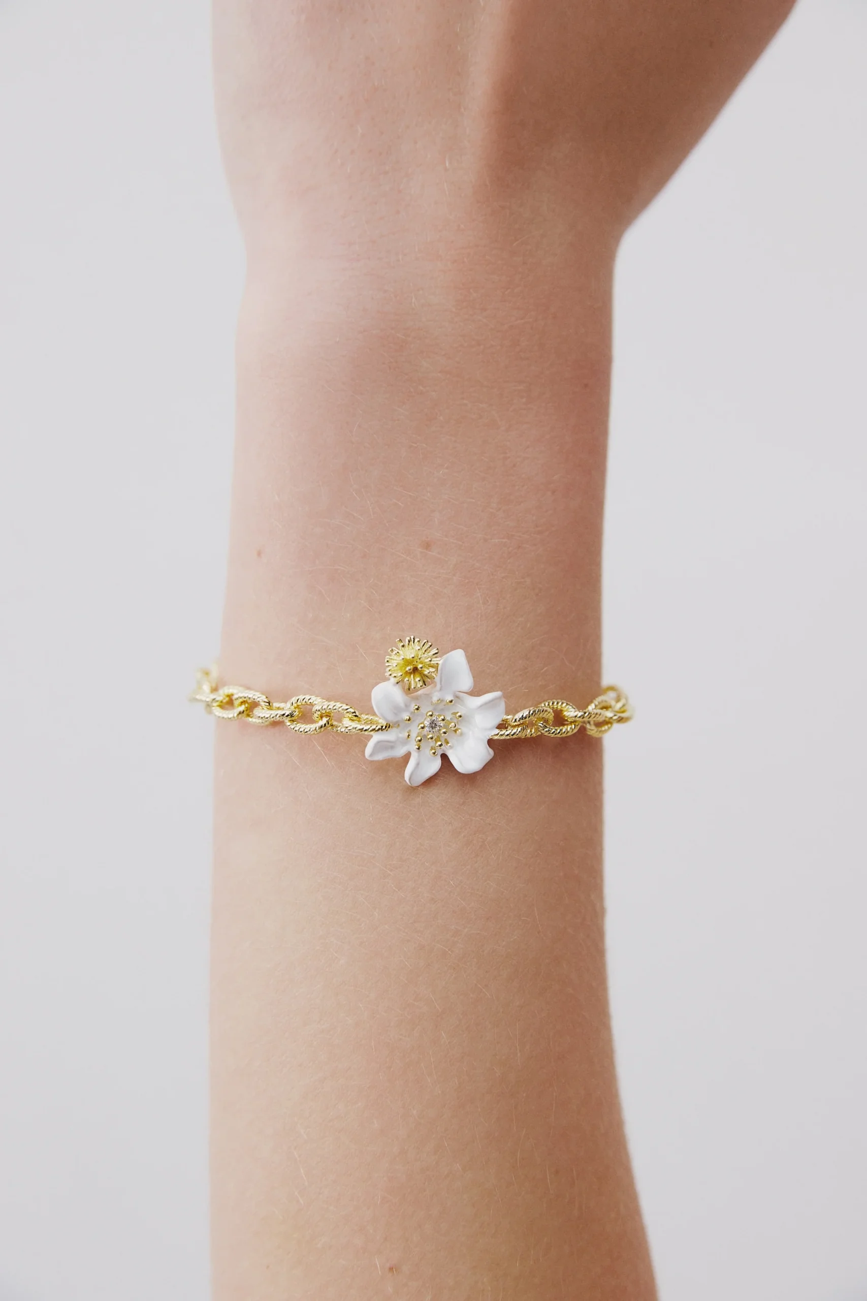Bracelet grande fleur de clématite blanche peinte à la main, chaine en grosse maille, pierre facettée et corête du japon jaune en laiton doré à l’or fin. La collection Nature Flamboyante raconte Montmartre en fête. Des parures éclatantes dorées à l’or fin, inspirées du Paris festif et insouciant, entre fastes impériaux et joie populaire. On célèbre la vie et les événements importants, pavant les rues d’or et de blanc.