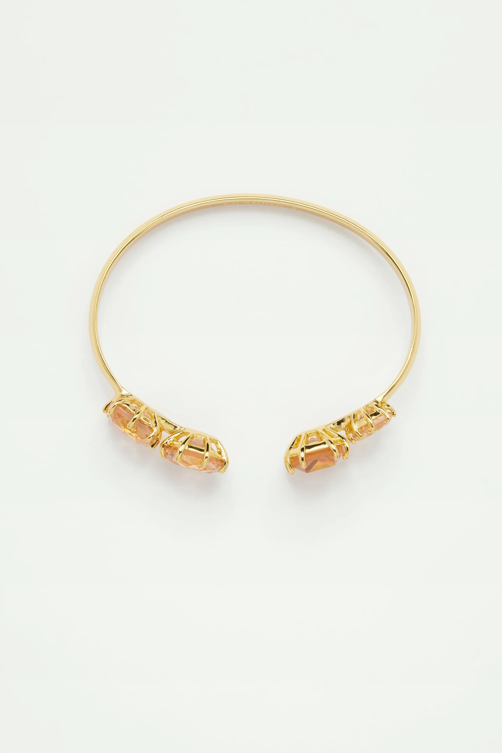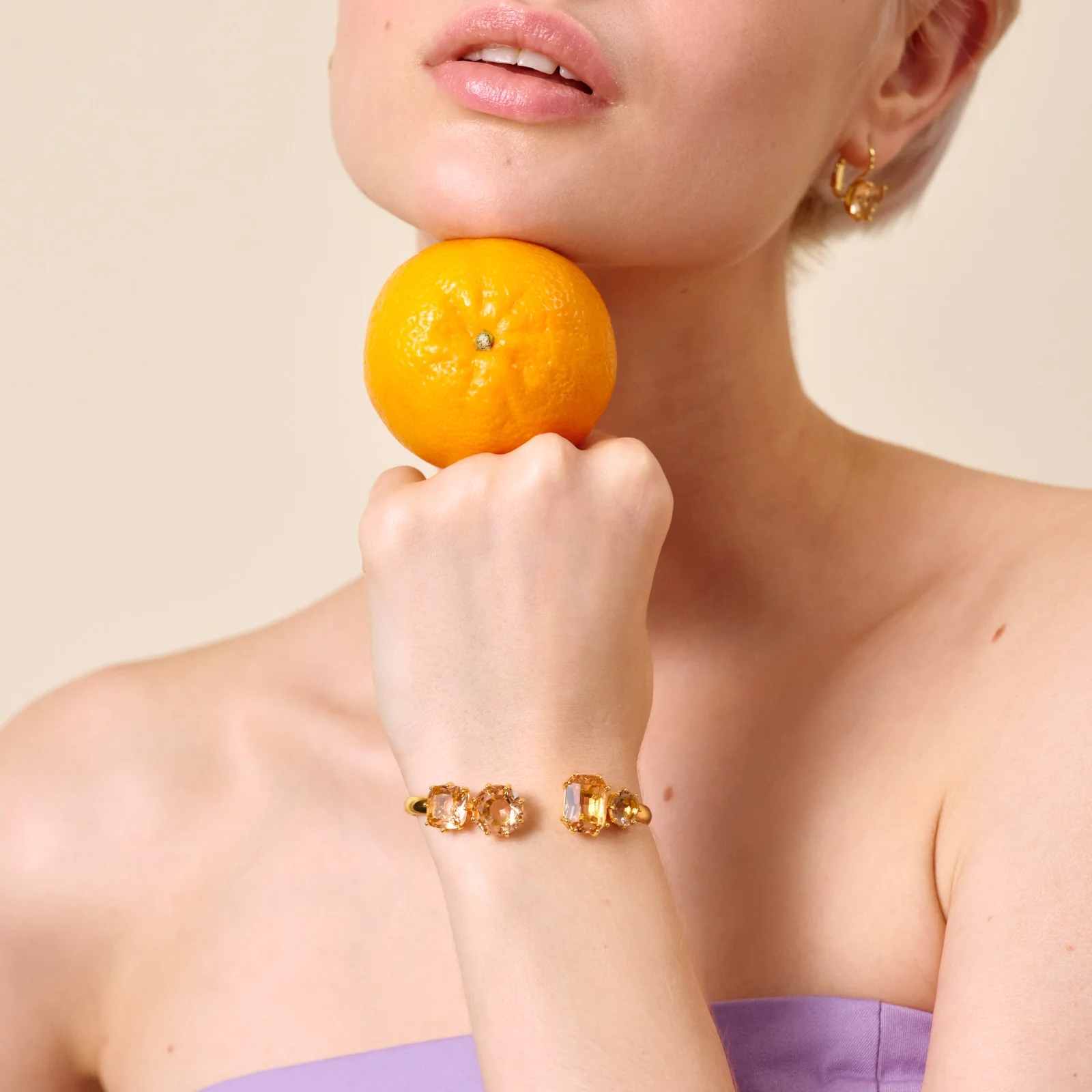Bracelet jonc fin en laiton doré, 4 pierres en verre facetté dans les tons abricot, 1 pierre carrée, 2 pierres rondes, 1 pierre forme coussin, détail de pierre pendante sur le fermoir. La Diamantine, un incontournable en verre facetté sur mesure, témoignant de l’excellence en matière de haute fantaisie de la Maison Les Néréides. A combiner avec les autres bijoux de la collection pour créer une parure assortie.