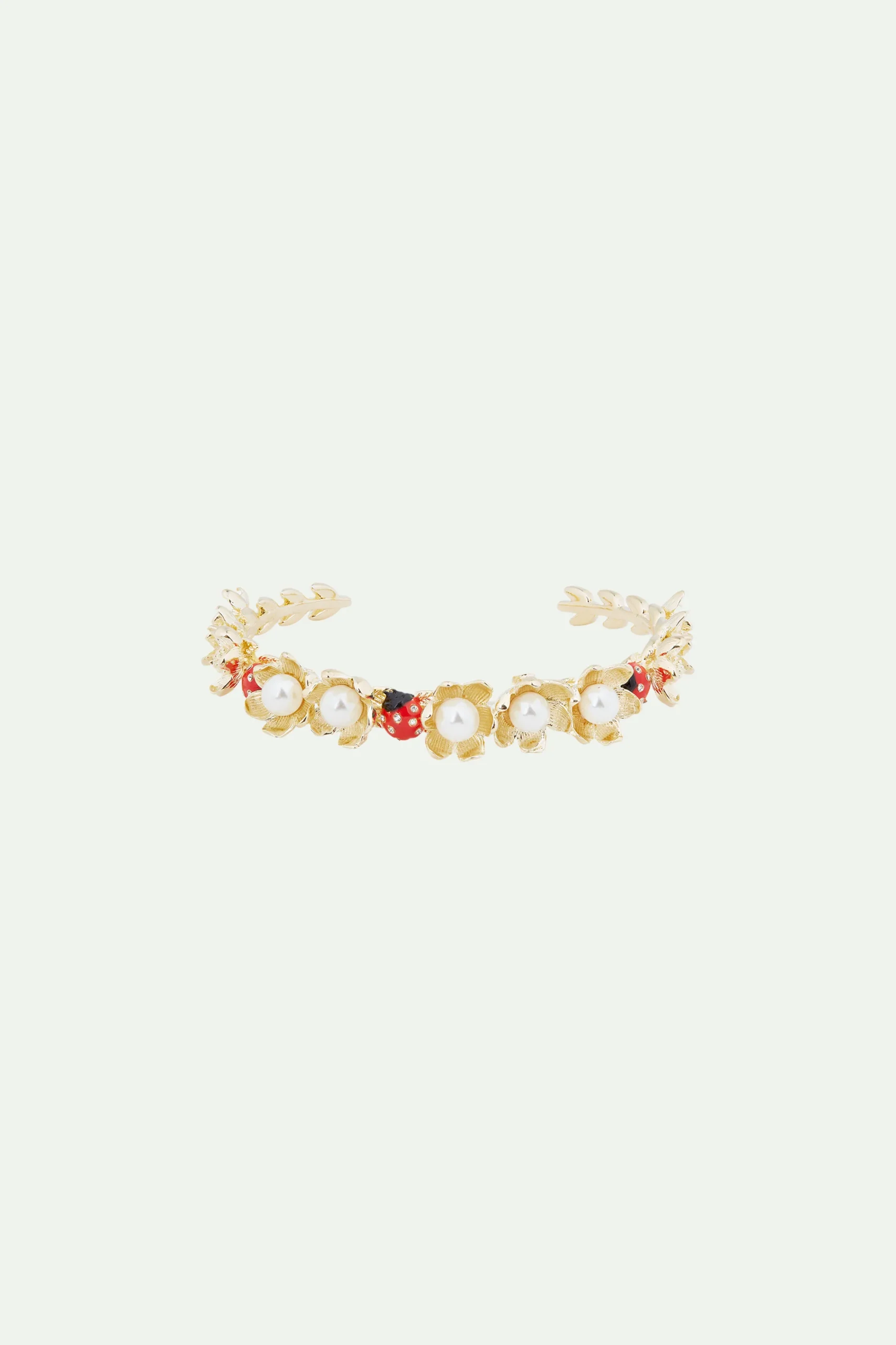 Cachées derrière les pétales de magnifiques fleurs sauvages, se trouvent trois petites coccinelles grandeur nature. Séparées par des anémones couleur or, elles vous porteront chance. Ce bijou fantaisie revêt un caractère vintage par sa composition florale garnie et ses perles de nacre volumineuses. Bracelet Jonc : Laiton doré à l’or fin, peint à la main, perles de nacre et cristaux facettés.