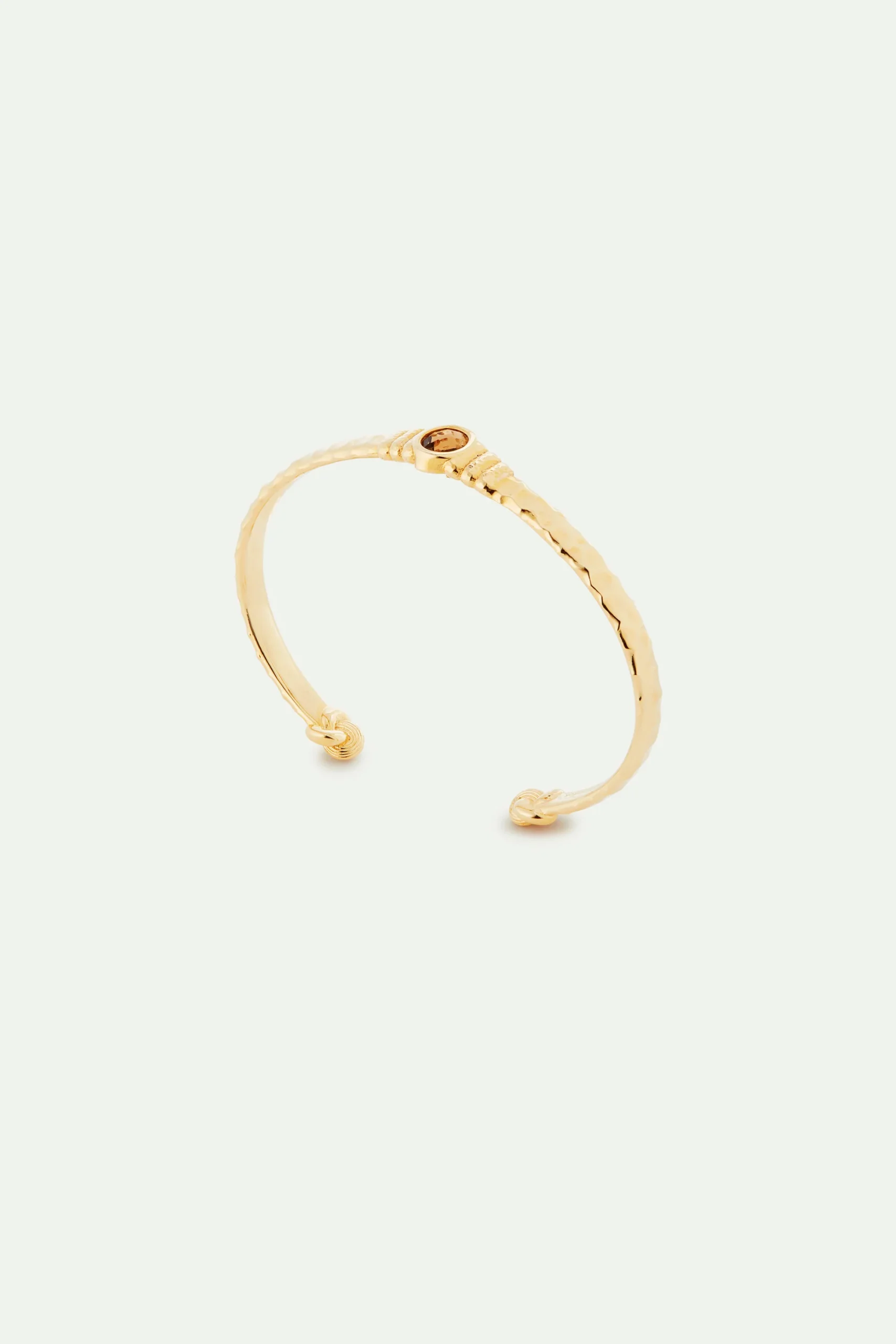 Bracelet jonc, à la texture martelée en laiton doré à l’or fin et agrémenté d’un verre facetté au centre. La collection Nuit Blanche s’inspire des années 1980 pour proposer des bijoux de soirée dorés. L’accent est mis sur un jeu de textures appliqué sur des formes abstraites souples.