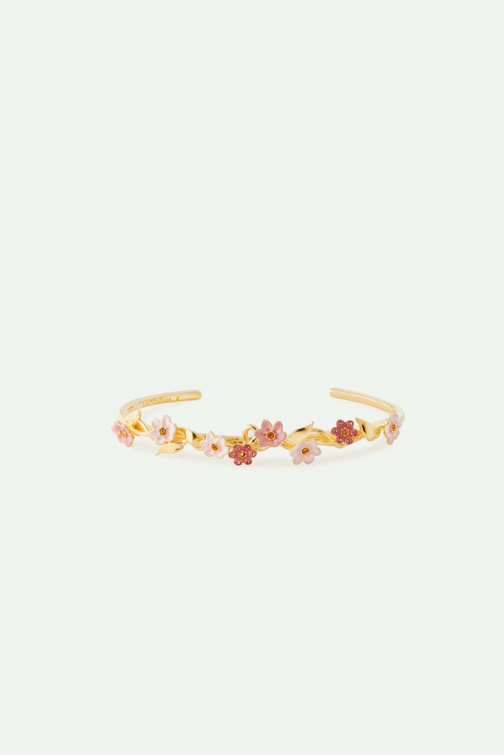 Bracelet jonc orné de fleurs de jasmin délicatement peintes à la main dans des tons roses et serties de cristaux. La monture est en laiton doré à l’or fin. Succombez à la beauté de cette fleur sous toutes ses formes et couleurs avec cette collection dédiée au jasmin.