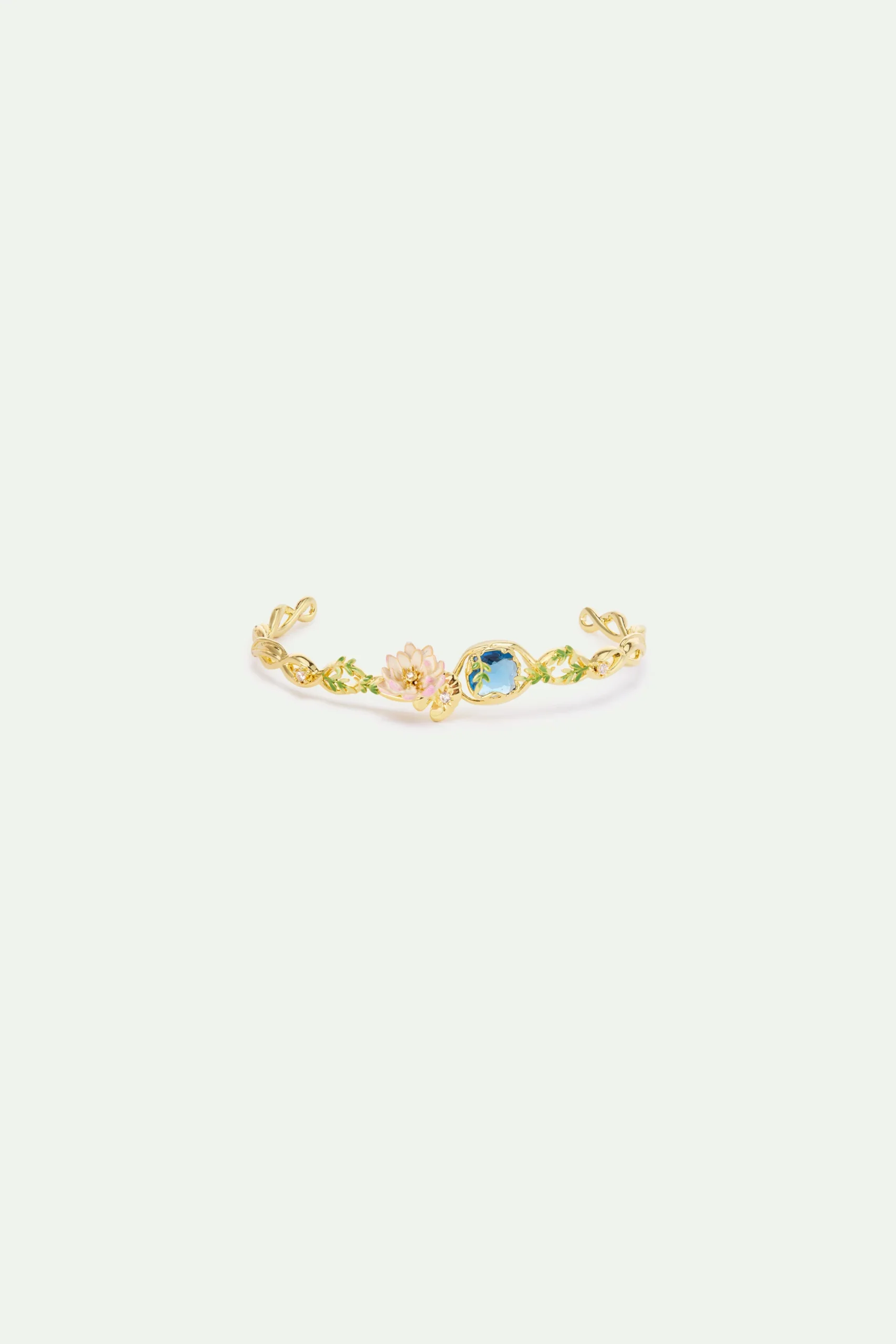 Bracelet jonc torsadé en laiton doré à l’or fin, fleur de nymphéa rose peinte à la main ornée d’un cristal blanc, pierre ronde bleue claire sertie en laiton doré d’inspiration végétal.