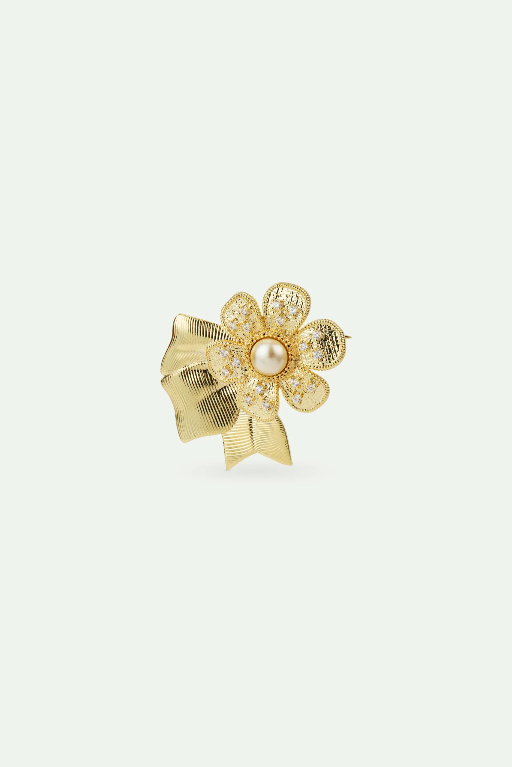 Broche petite fleur bouton d’or aux pétales en laiton doré ornés d’oxydes de zirconium, perle fantaisie au centre. Inspirée des défilés de la haute couture parisienne, cette collection évoque le chic à la française. Les détails rappellent les tissus et les broderies chers aux créateurs.