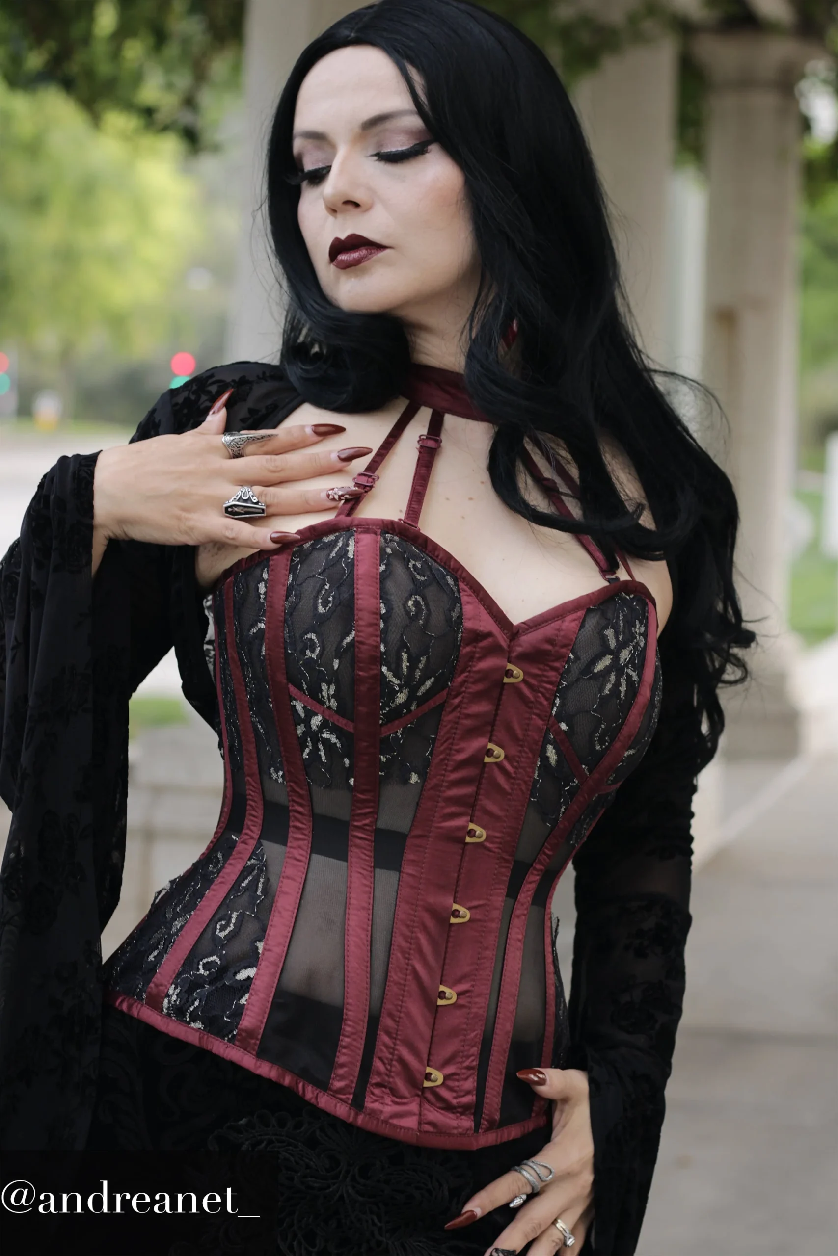 We proudly present our show-stopping exquisite overbust lingerie corset. Attention to detail is meticulous, with intricate burgundy and gold lace embroidery on sheer panels. The ribbon lacing at the back offers a comfortable custom fit and a retro feminine touch. The neckline is a removable satin band choker, fastened with a small swan hook and loop. This is a lightweight corset offering a generous three- and four-inch waist reduction. A truly sensational piece.