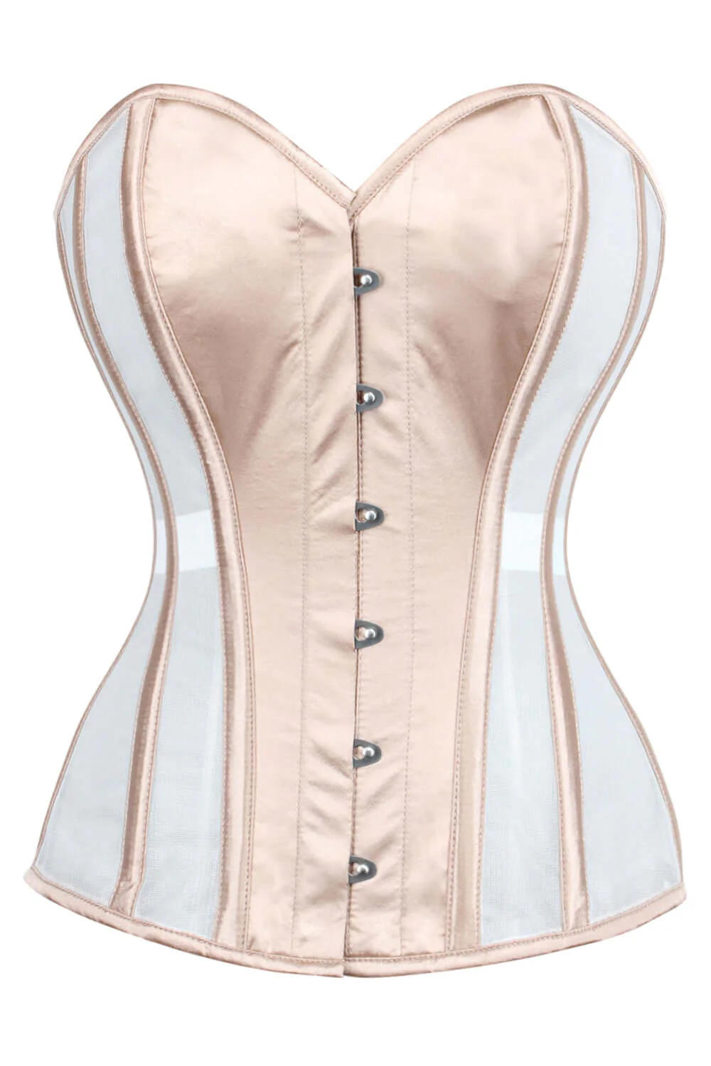 Notre corset overbust en satin et mesh fait le choix parfait pour une réduction discrète de la taille sous vos vêtements. Les empiècements en maille transparente laissent la peau respirer tout en camouflant vos vêtements de forme. Le satin doré rose en fait un choix populaire auprès de ceux qui aiment un look profondément féminin, tout en offrant une réduction de taille allant jusqu’à quatre « . Les os en acier intégral sont recouverts de tissu, alliant un contrôle fort, un confort et une silhouette épurée.