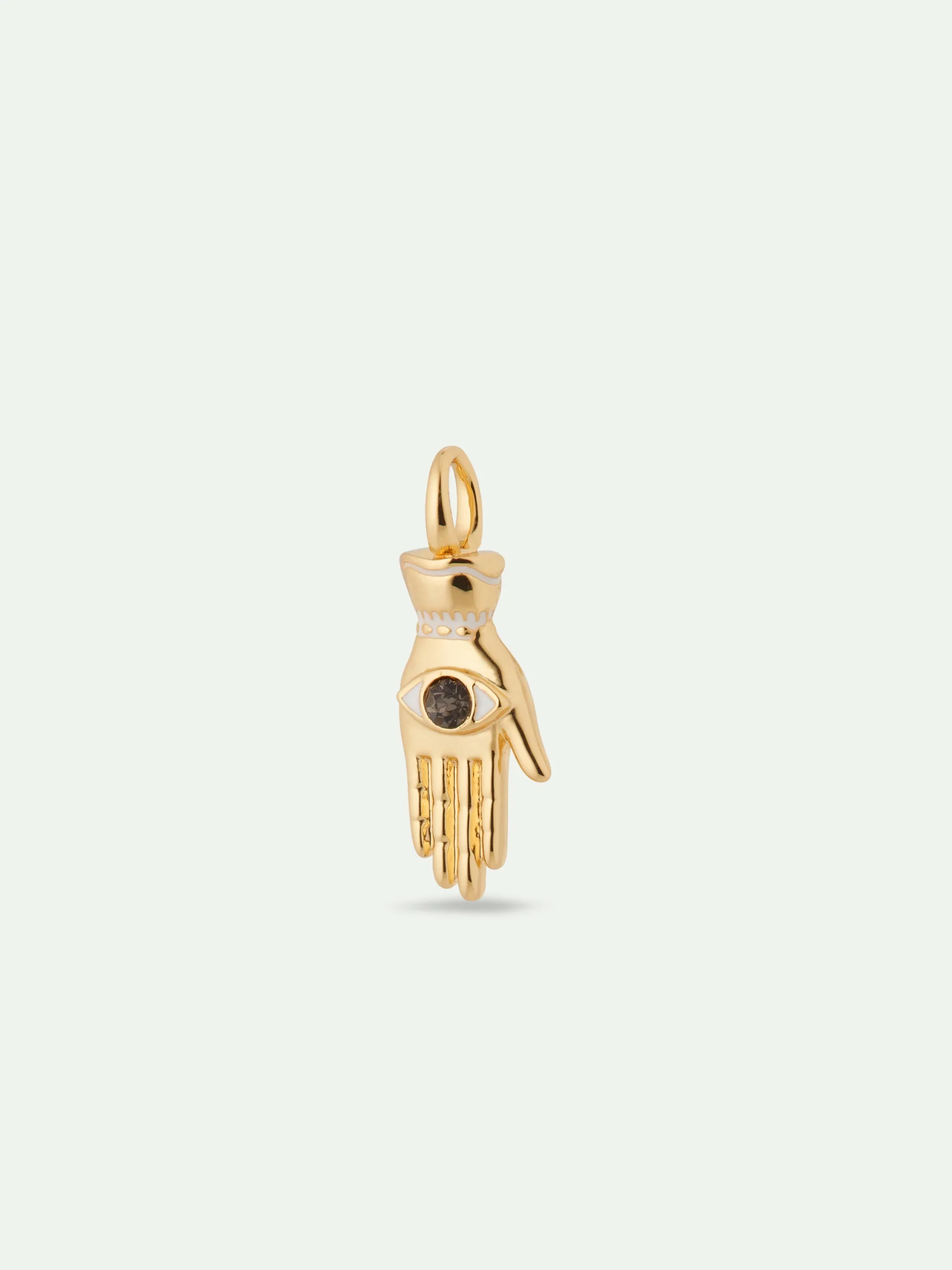 Charm’s main de fatma ou Khamsa doré à l’or fin et décoré d’un oeil au milieu de la paume de main. Cette saison, les Charm’s de N2 s’inspirent de mysticisme, avec une jolie touche d’effroi, entre philtre d’amour, boule de cristal et carte de tarot, tout l’attirail d’une petite sorcière.