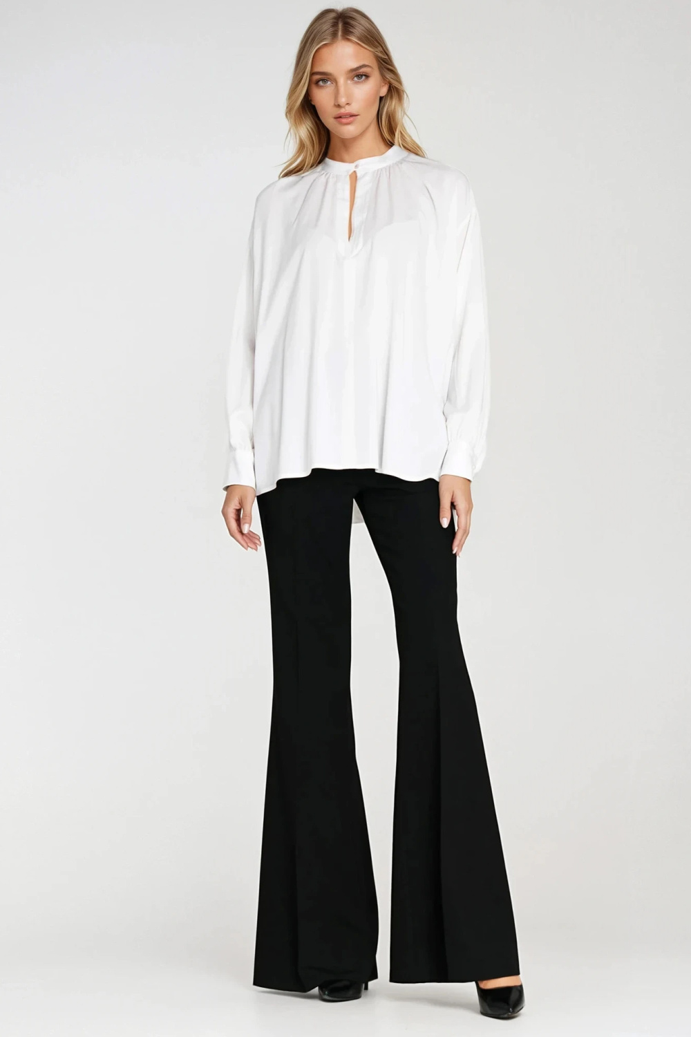 Élégant chemisier de coupe oversize, fabriqué en viscose légère et agréable au toucher, offrant un confort toute la journée. Le modèle avec un décolleté en forme de goutte fermé par un bouton souligne subtilement le cou et ajoute du charme féminin. Le chemisier a des manches longues avec des poignets et de délicats plis au niveau du décolleté et des poignets, lui donnant légèreté et caractère élégant. Un modèle polyvalent qui conviendra parfaitement aussi bien dans des tenues de bureau que décontractées.