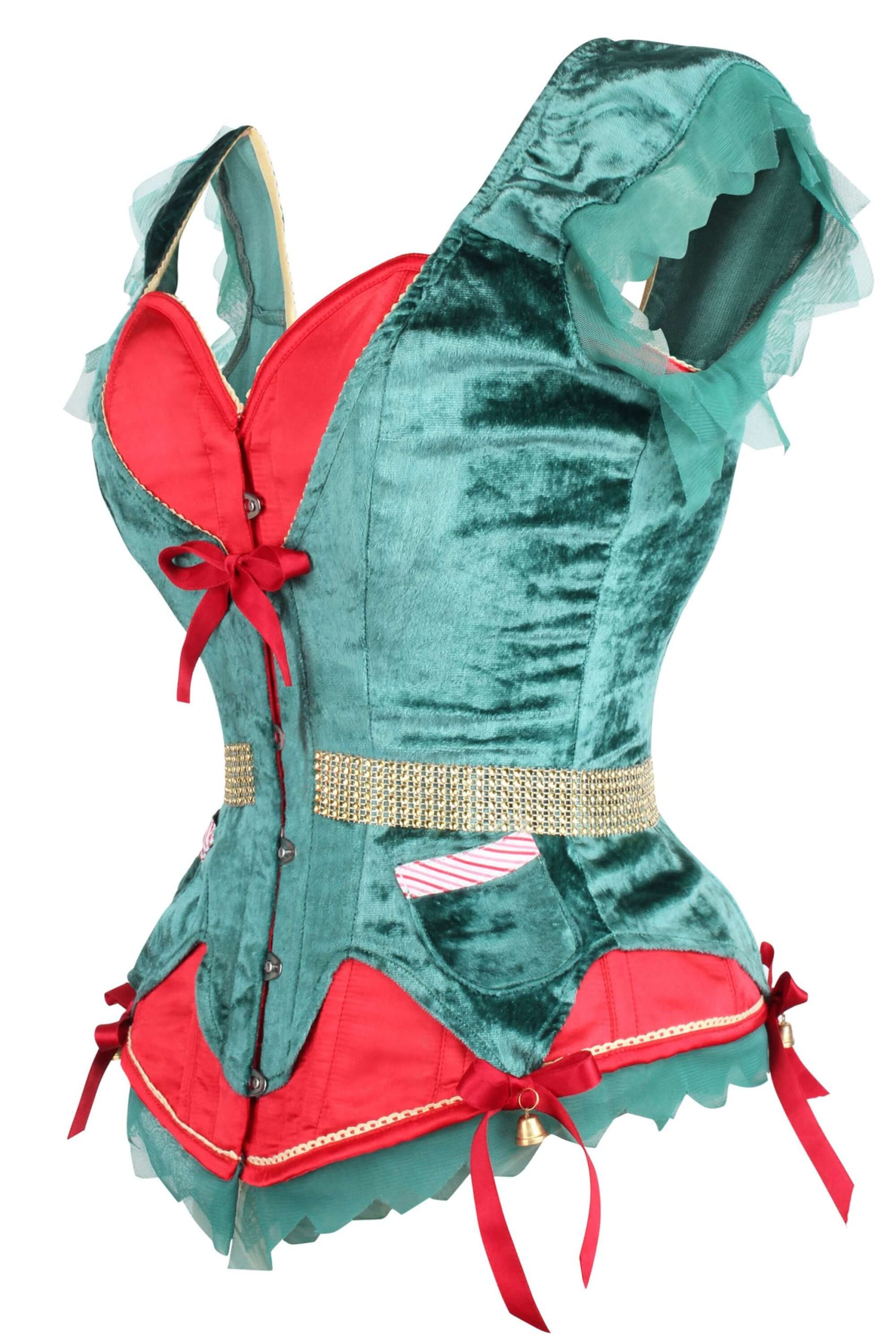 Ajoutez une touche espiègle à votre look avec notre corset Little Helper du Père Noël overbust. Le charme festif regorge d’une tunique verte en velours écrasé sur un corset rouge rempli d’arcs et de cloches. Les bretelles couvertes offrent un soutien, tandis que les désossages réglables simplifieront votre taille et feront ressortir la confiance de votre elfe. Personne ne laissera cet elfe sur l’étagère !