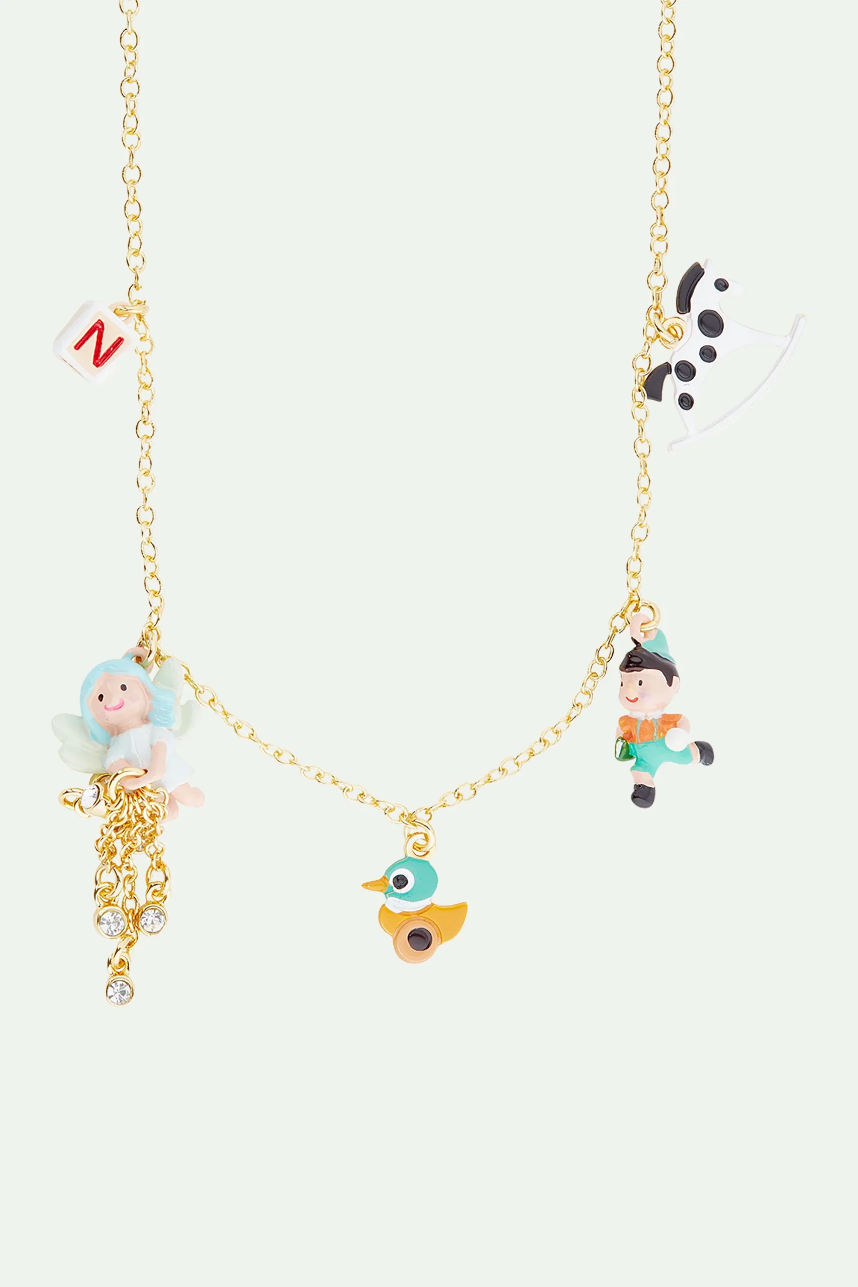 Ce collier charms’ vous introduit dans l’univers féerique du célèbre pantin de bois. Le personnage est entouré par des jouets indémodables comme le cheval à bascule et le canard de bain. La fée bleue et le dé à lancer sont aussi présentés sur le collier et viennent compléter cette série de grigris allégoriques de l’enfance et de son univers récréatif, empreint de magie. Collier : Laiton doré à l’or fin, peint à la main.