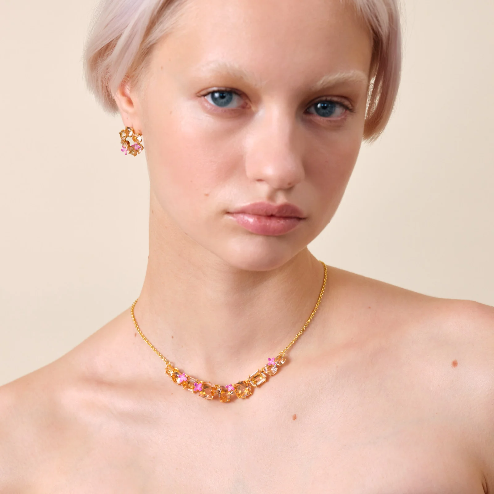 Collier fin doré, 9 pierres en verre facetté dans les tons abricot de formes différentes, pierre taillée en coeur au centre du bijou, détails de fleurs roses, chaine et monture en laiton doré à l’or fin. La Diamantine, un incontournable en verre facetté sur mesure, témoignant de l’excellence en matière de haute fantaisie de la Maison Les Néréides. Des fleurs de lilas, déjà présentes dans la collection Fleurs des Poètes, parsèment les compositions de pierres.