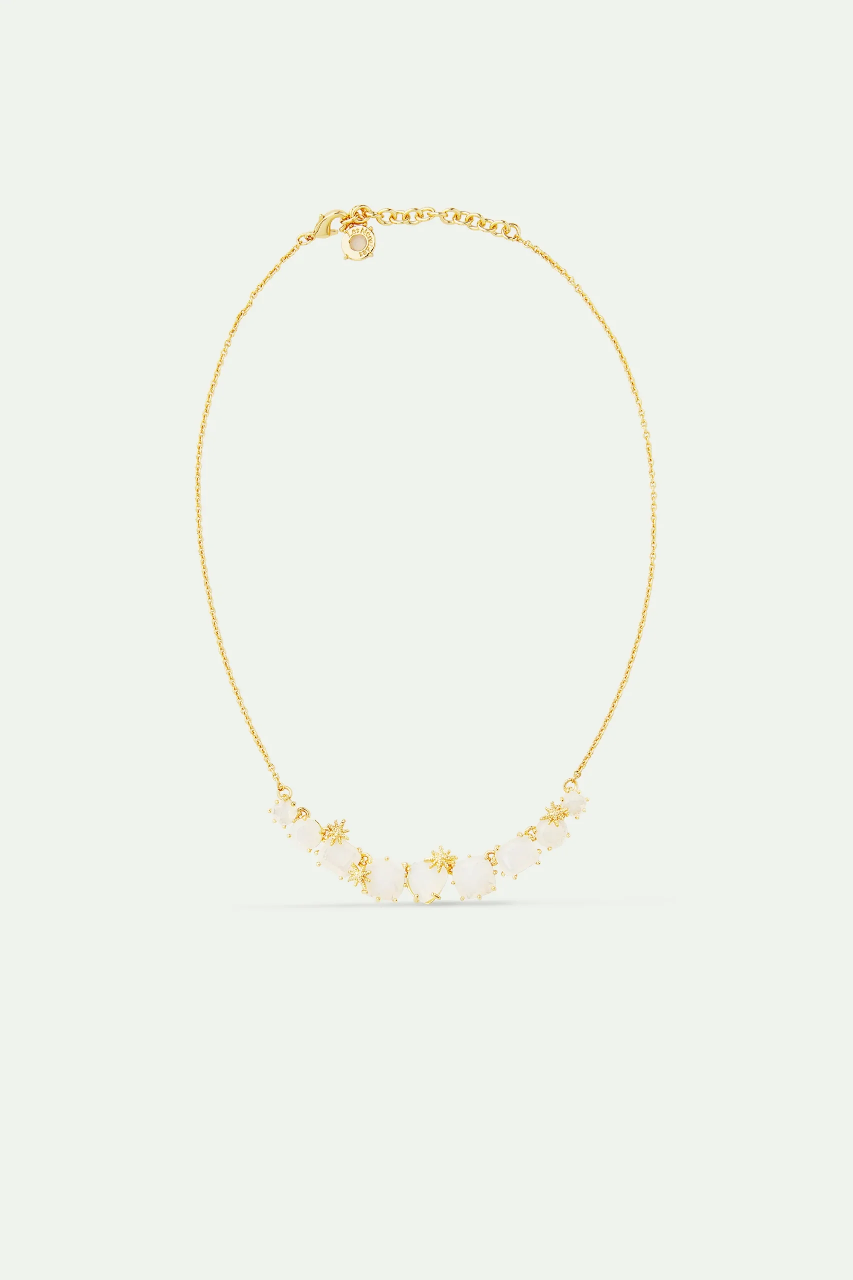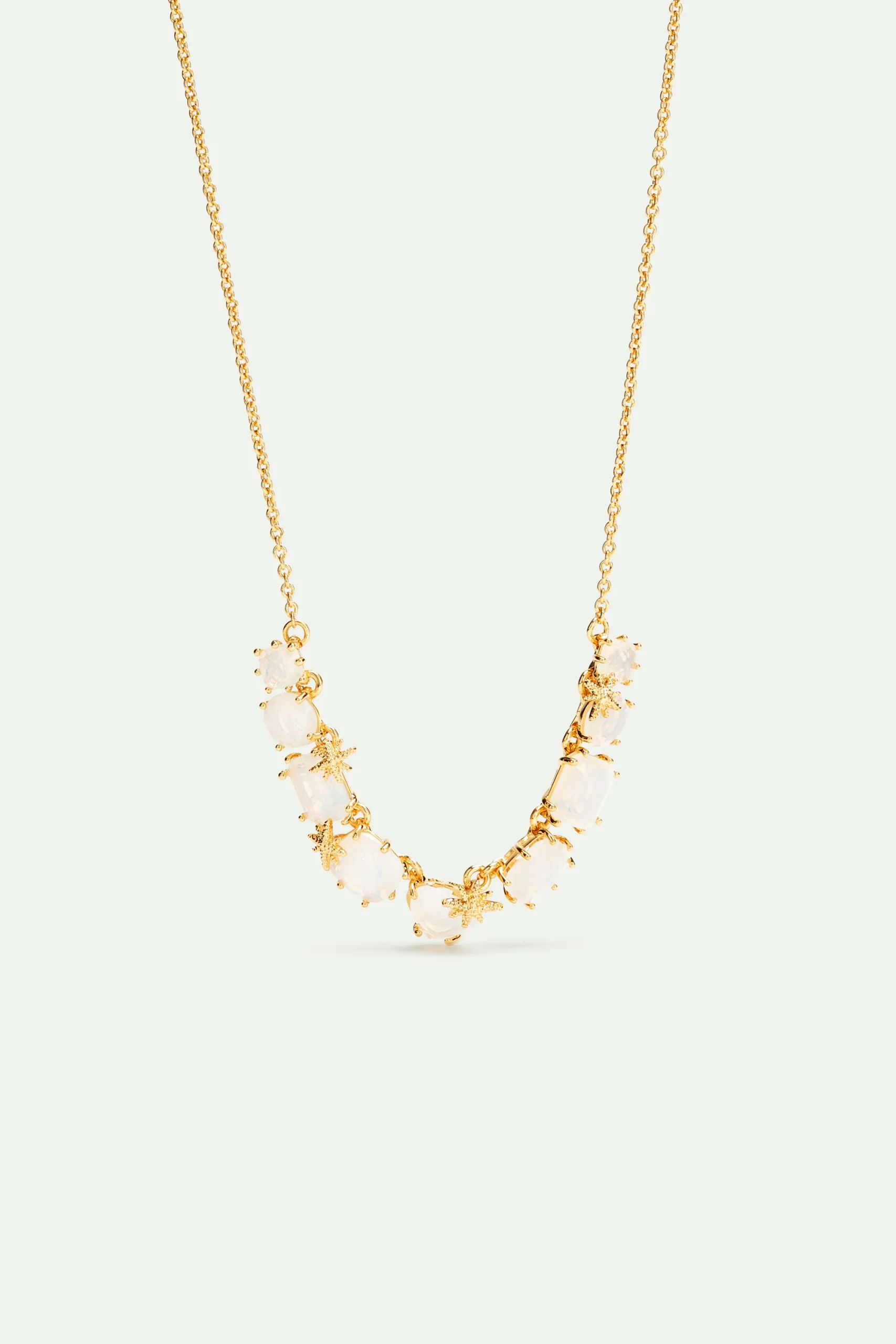 Collier fin présentant des pierres rondes, carrées et en forme de cœur en verre facetté, couleur blanc opalescent et accompagnées de fines étoiles dorées. La collection Diamantine, en verre taillé sur mesure, se décline cette saison en coloris blanc opalescent. Les étoiles de la collection Mon Petit Secret s’invitent sur les pièces et apportent ainsi un éclat supplémentaire.