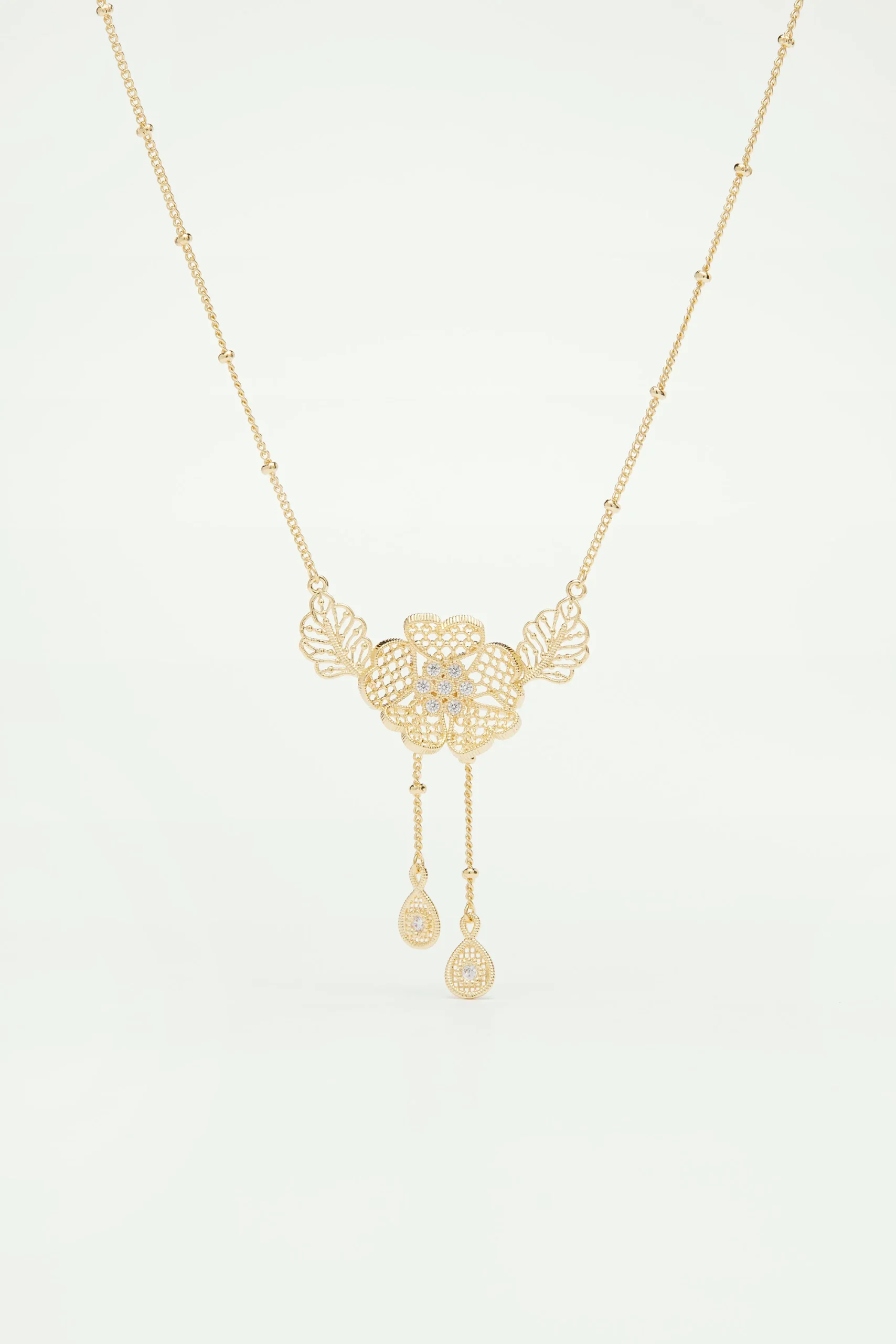 Le collier pendentif fil d’or est agrémenté d’une fleur d’or en son centre et orné de brillants pour vêtir votre cou d’un bijou des plus distingué. L’élégance et la subtilité de ces bijoux viennent orner poignets, cous, oreilles et doigts à la façon de la dentelle d’Alençon.