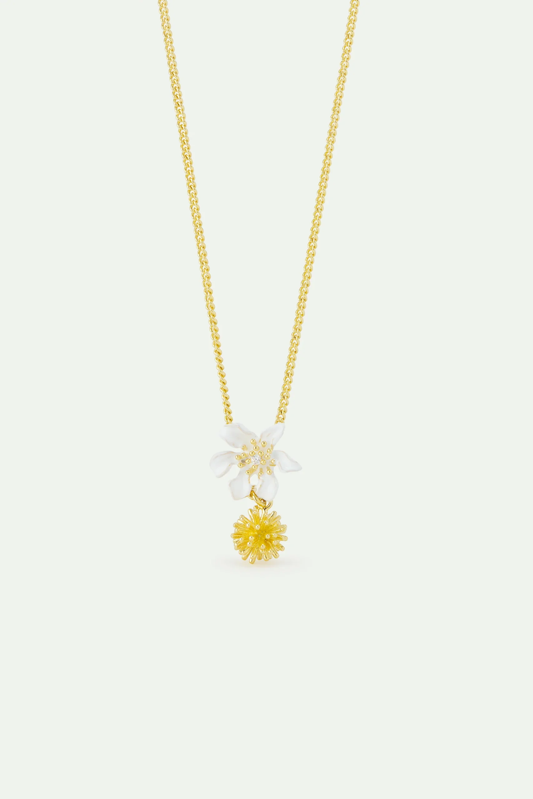 Collier grande fleur de clématite blanche peinte à la main, pierre facettée, corête du japon en laiton doré à l’or fin. La collection Nature Flamboyante raconte Montmartre en fête. Des parures éclatantes dorées à l’or fin, inspirées du Paris festif et insouciant, entre fastes impériaux et joie populaire. On célèbre la vie et les événements importants, pavant les rues d’or et de blanc.