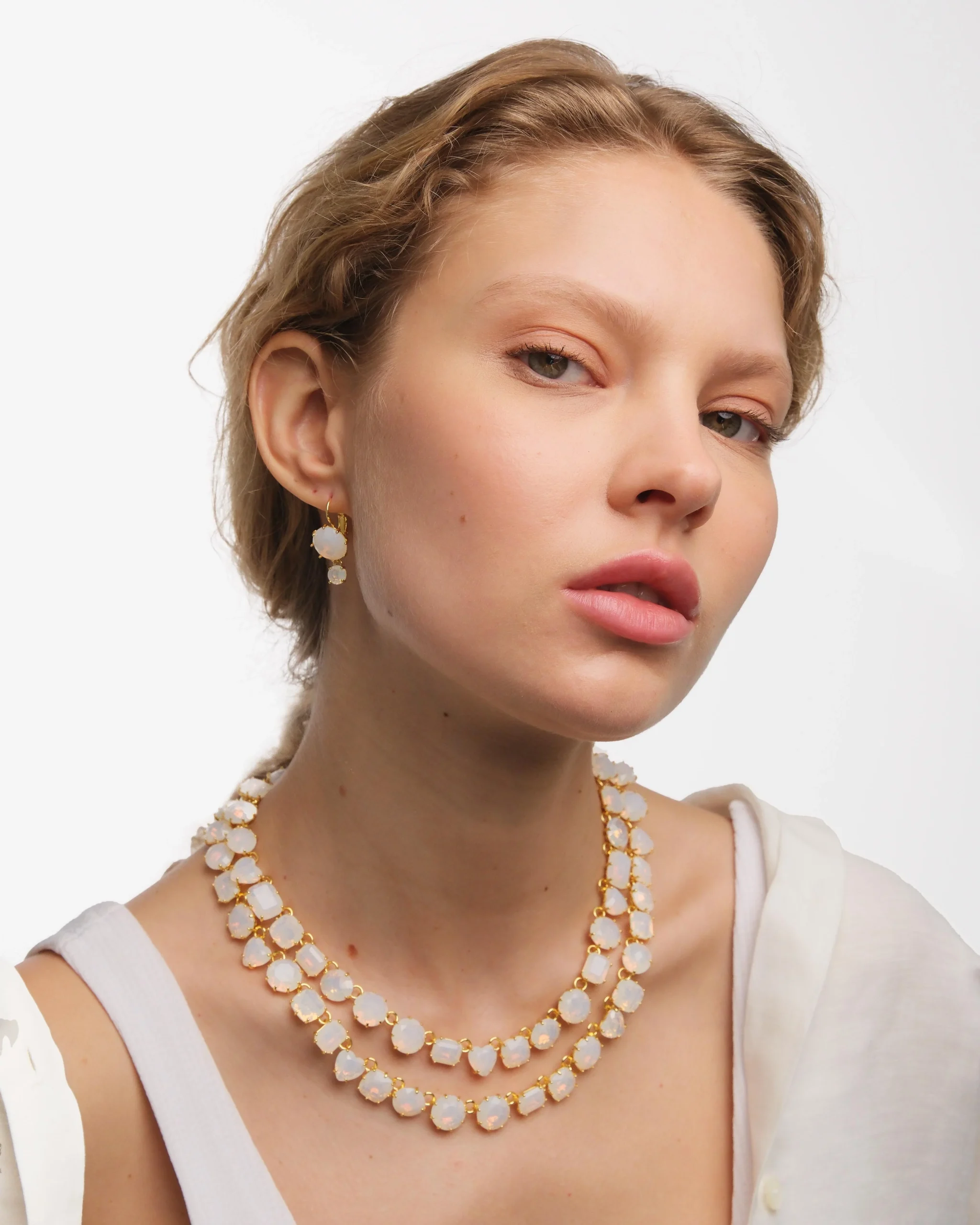 Collier luxe présentant deux rangs de pierres rondes, carrées et en forme de cœur en verre facetté, couleur blanc opalescent. La collection Diamantine, en verre taillé sur mesure, se décline cette saison en coloris blanc opalescent. Les étoiles de la collection Mon Petit Secret s’invitent sur les pièces et apportent ainsi un éclat supplémentaire.