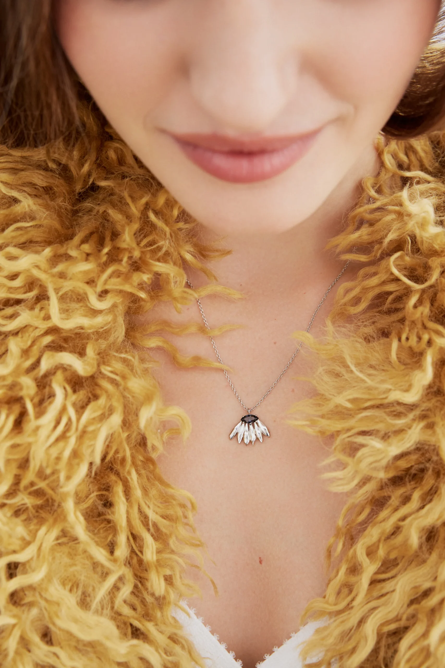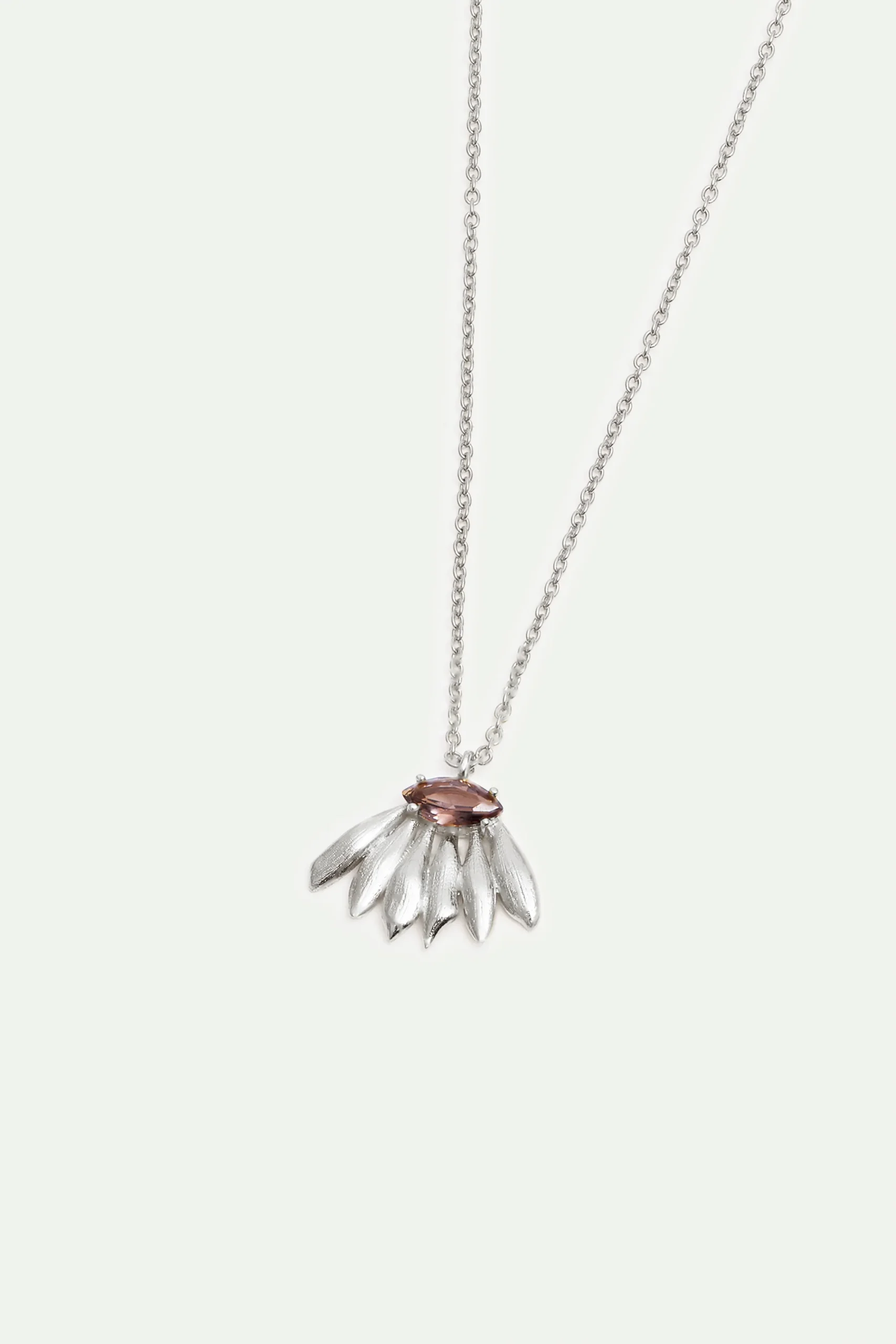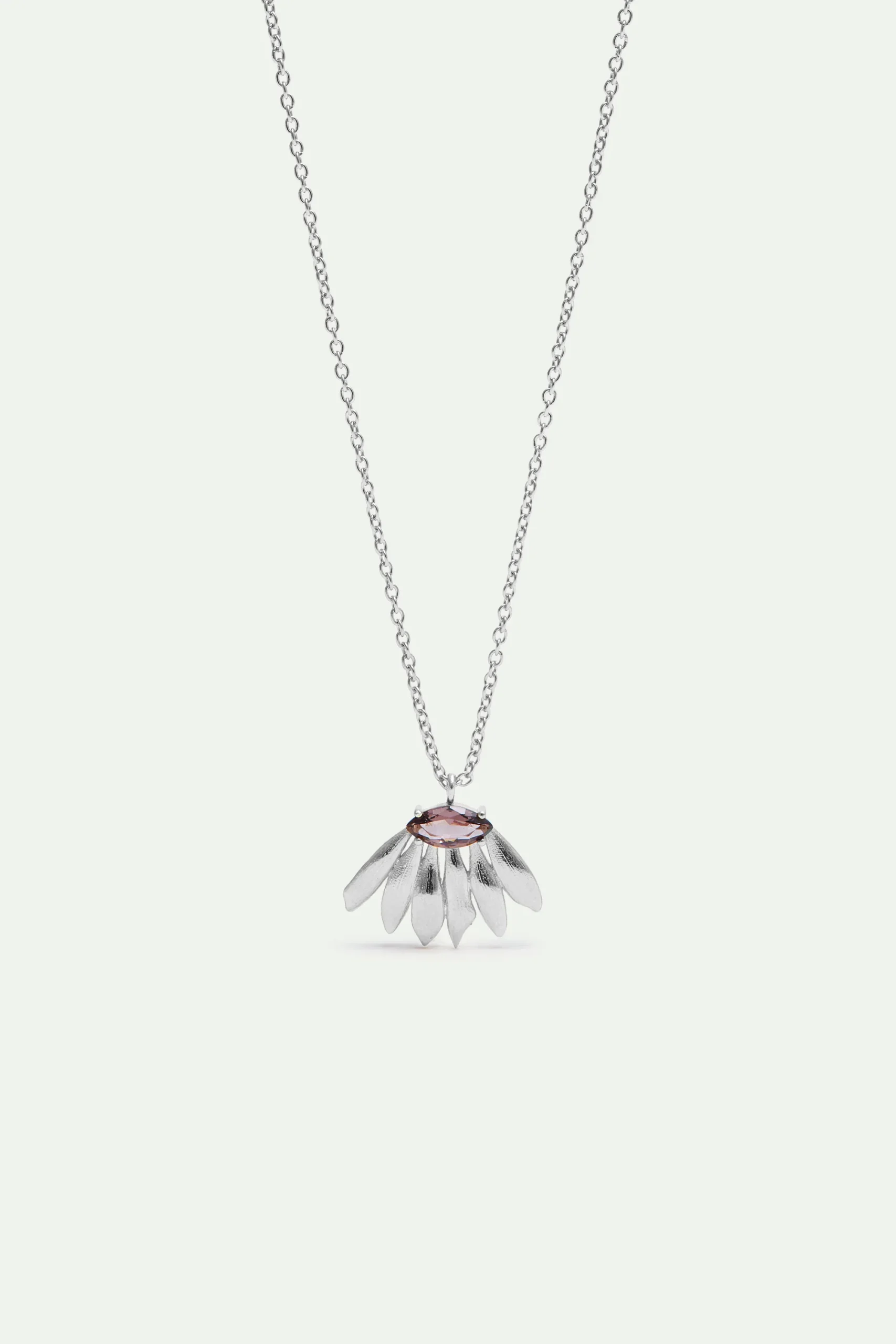 Collier pendentif argenté fleur de tournesol en laiton plaqué rhodium, pétales en forme d’éventail, et pierre couleur prune en oxyde de zirconium taillées en marquise.
