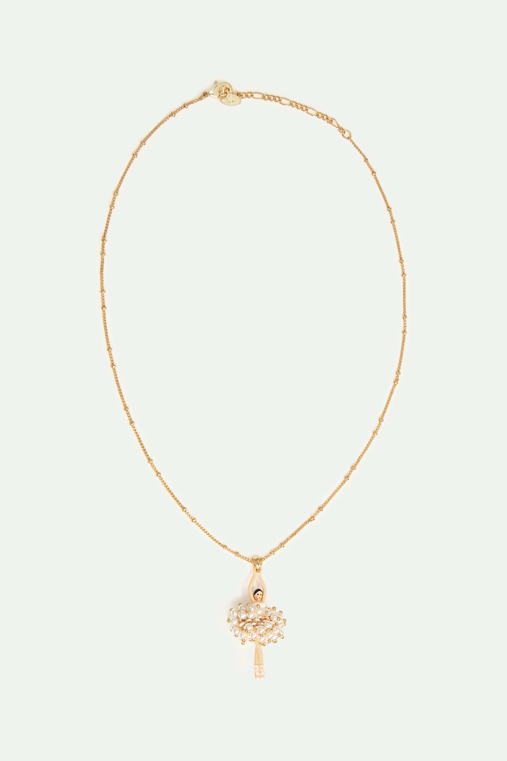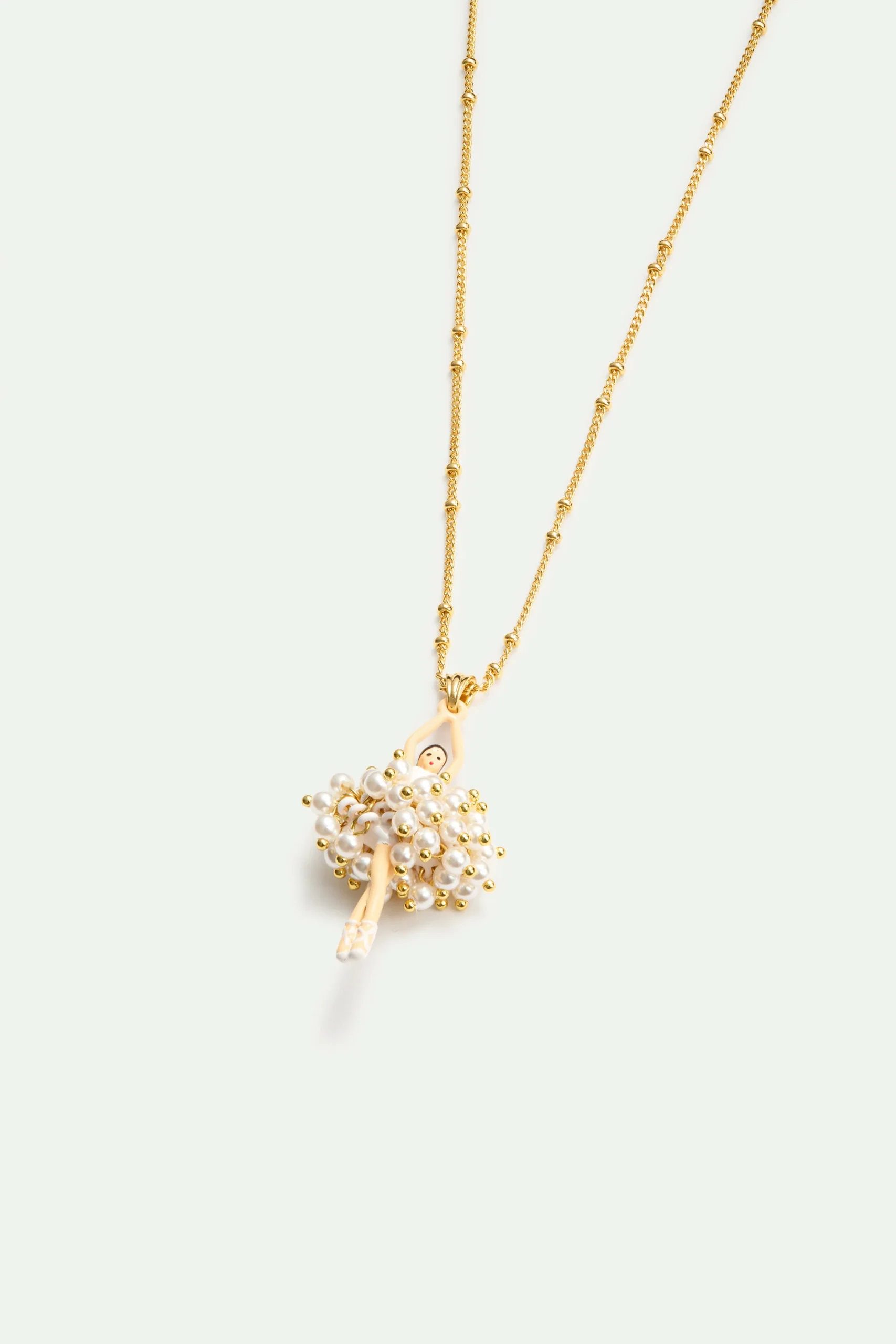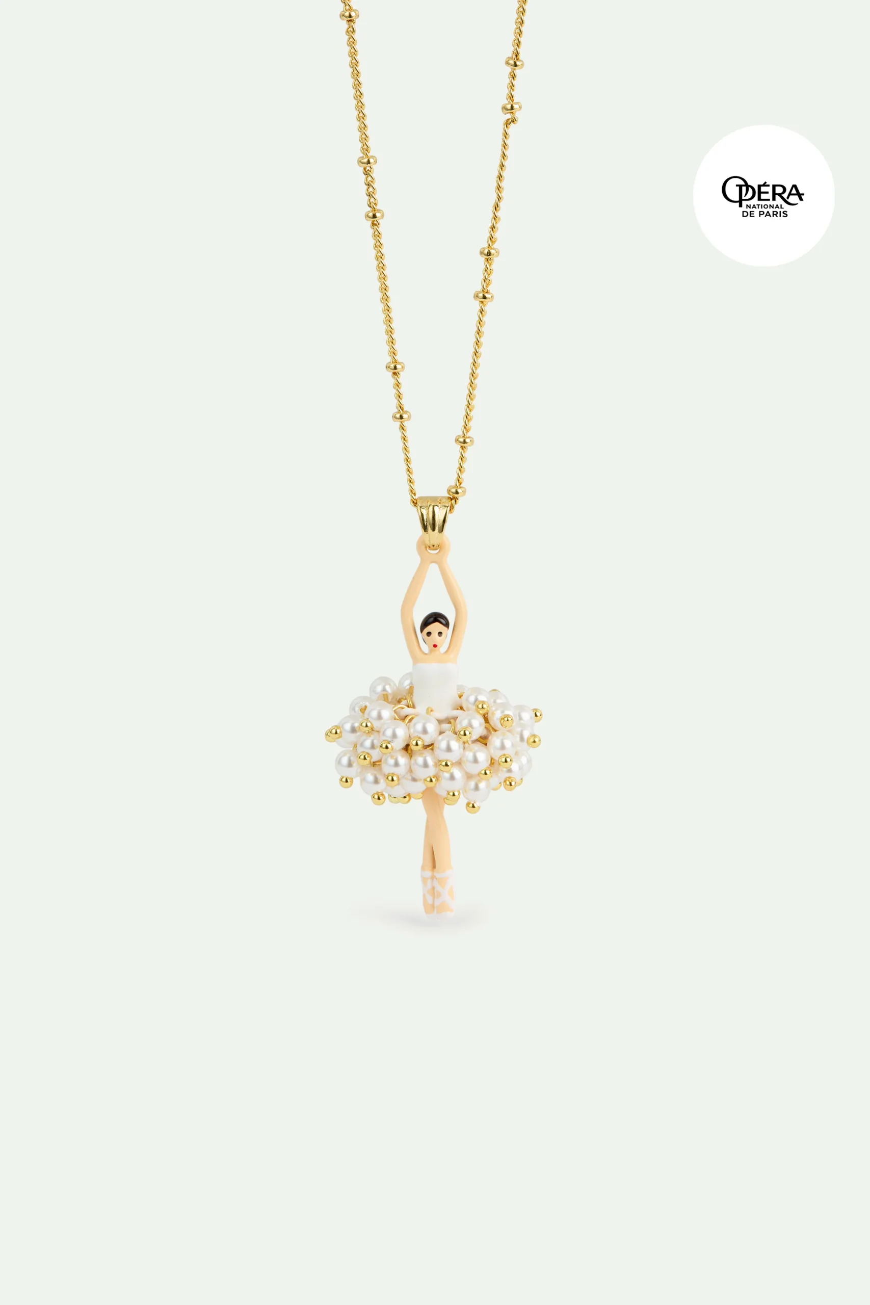 Collier pendentif ballerine peinte à la main, vêtue d’un bustier blanc et d’un tutu perlé doré. Chaine perlée en laiton doré à l’or fin. Autre grand classique chez Les Néréides, la collection Pas de Deux met à l’honneur cette saison la collaboration exclusive avec l’Opéra National de Paris.