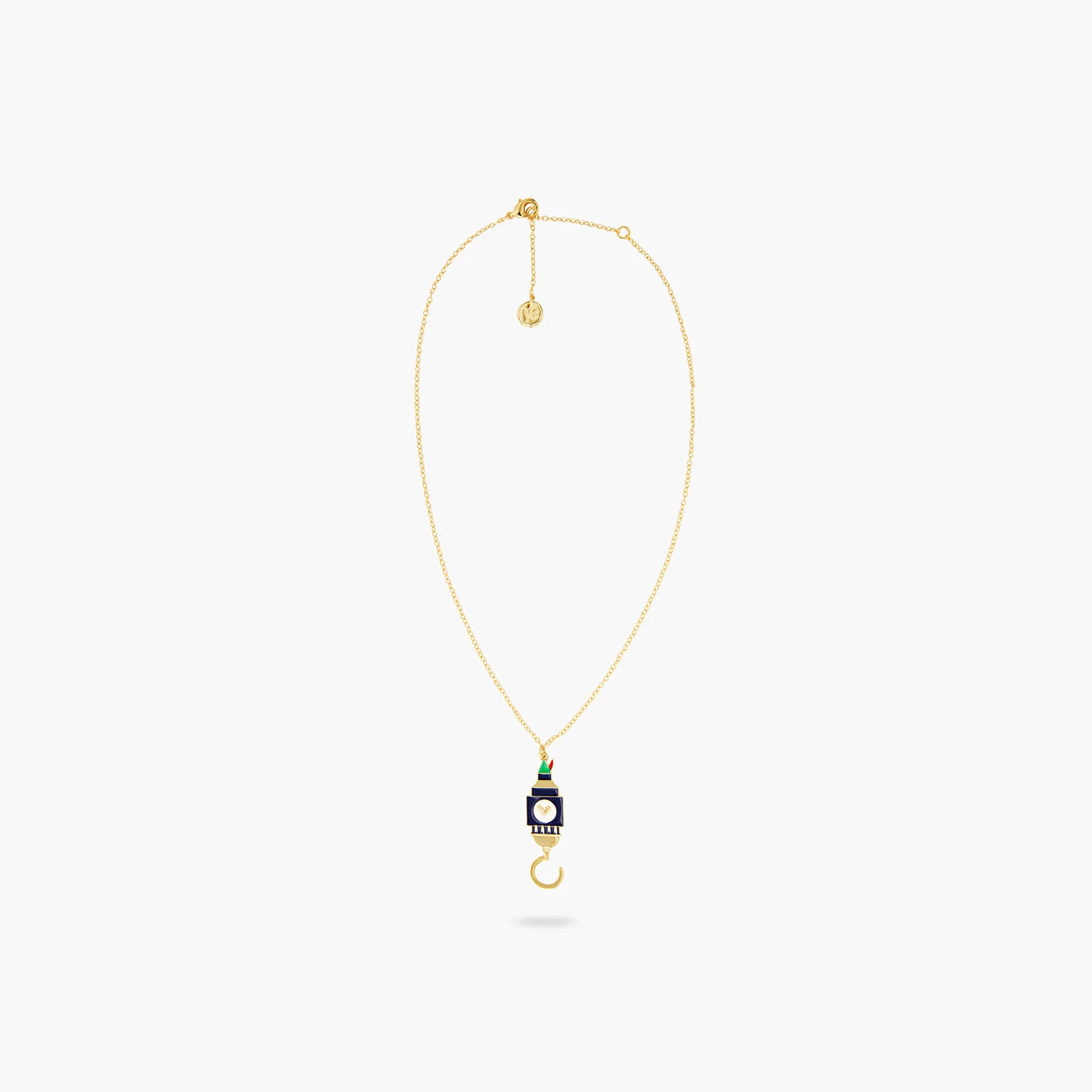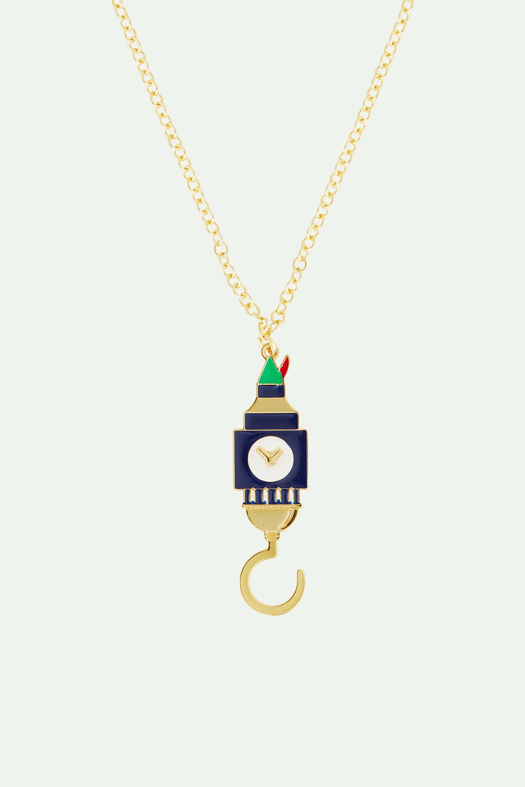 Découvrez la nouvelle collection Qui est Qui ? Un nouveau jeu dont vos bijoux sont les indices. Tentez de deviner en un clin d’œil à quel conte ce collier pendentif correspond. Au sommet, on aperçoit le chapeau ‘du petit garçon qui ne voulait pas grandir’. Et en bas, le crochet de son pire ennemi. Il s’agit bien évidemment du conte Peter Pan. Le Big Ben fait référence à la scène dans laquelle les enfants sont en ligne avec Peter Pan sur l’aiguille de la grande horloge, prêts à prendre leur envol. Collier Pendentif : Laiton doré à l’or fin et peint à la main