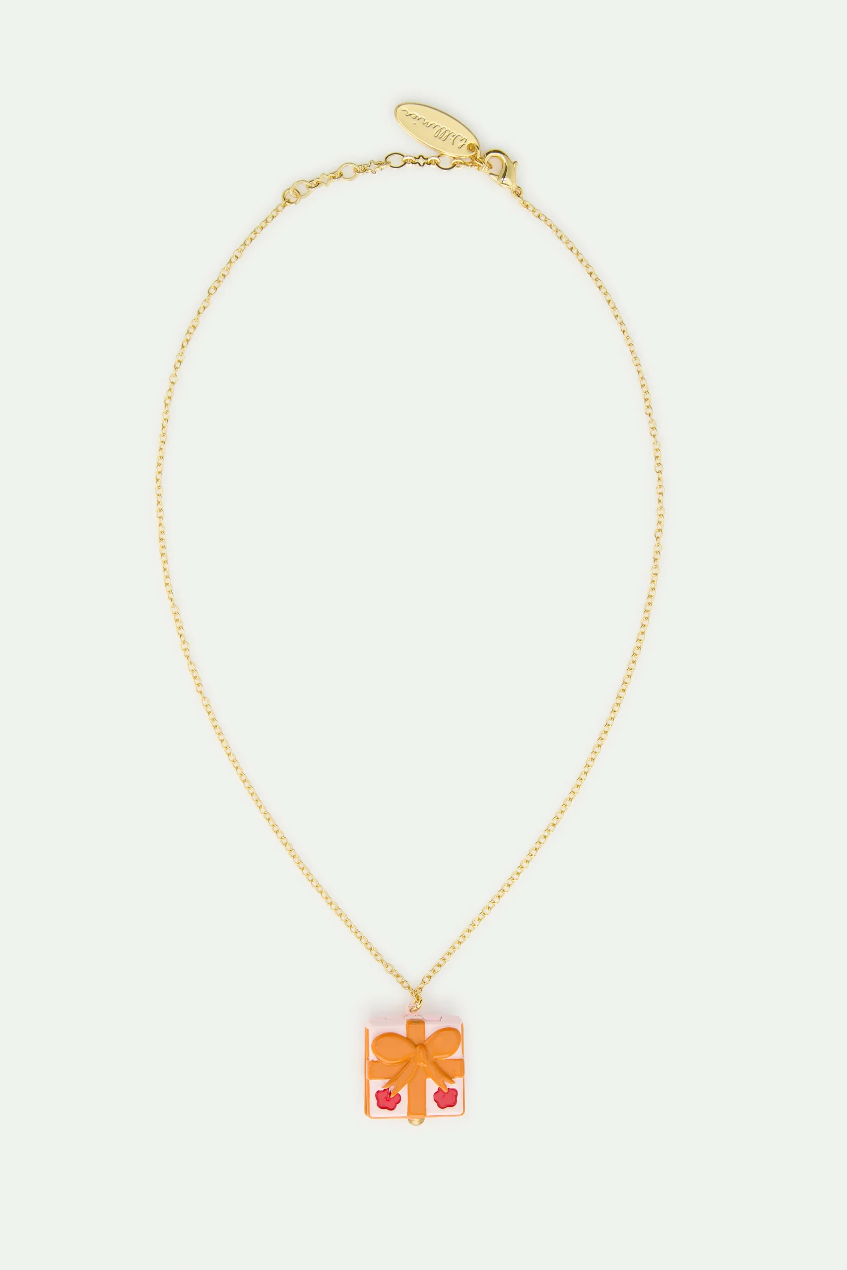 Collier pendentif cadeau surprise rose pâle qui s’ouvre en laiton doré à l’or fin, orné de fleurs rouges et d’un nœud orange peints à la main.