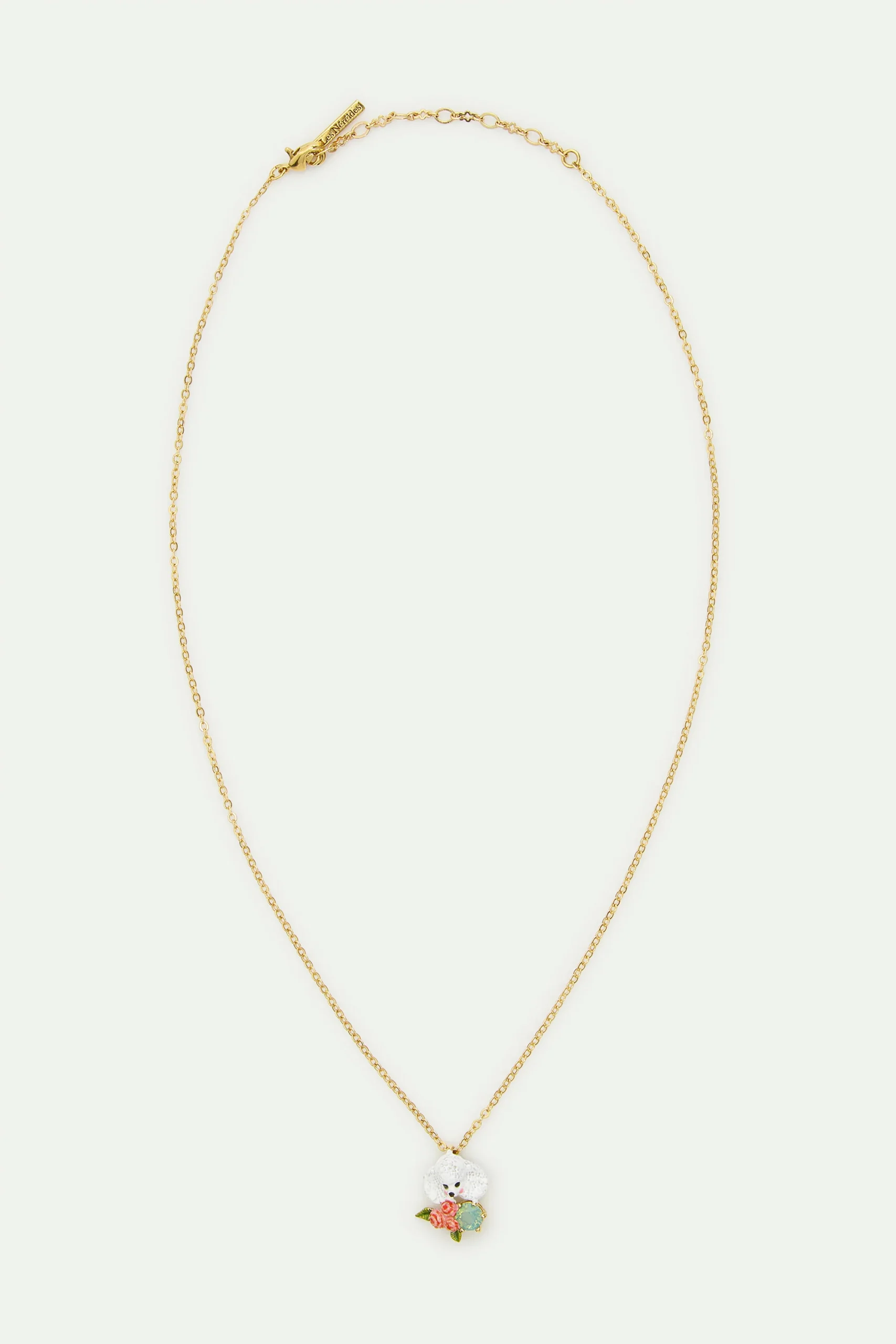 Collier pendentif chien caniche blanc peint à la main accompagné de fleurs roses et d’une pierre en verre facetté bleu. Chaine en laiton doré à l’or fin.