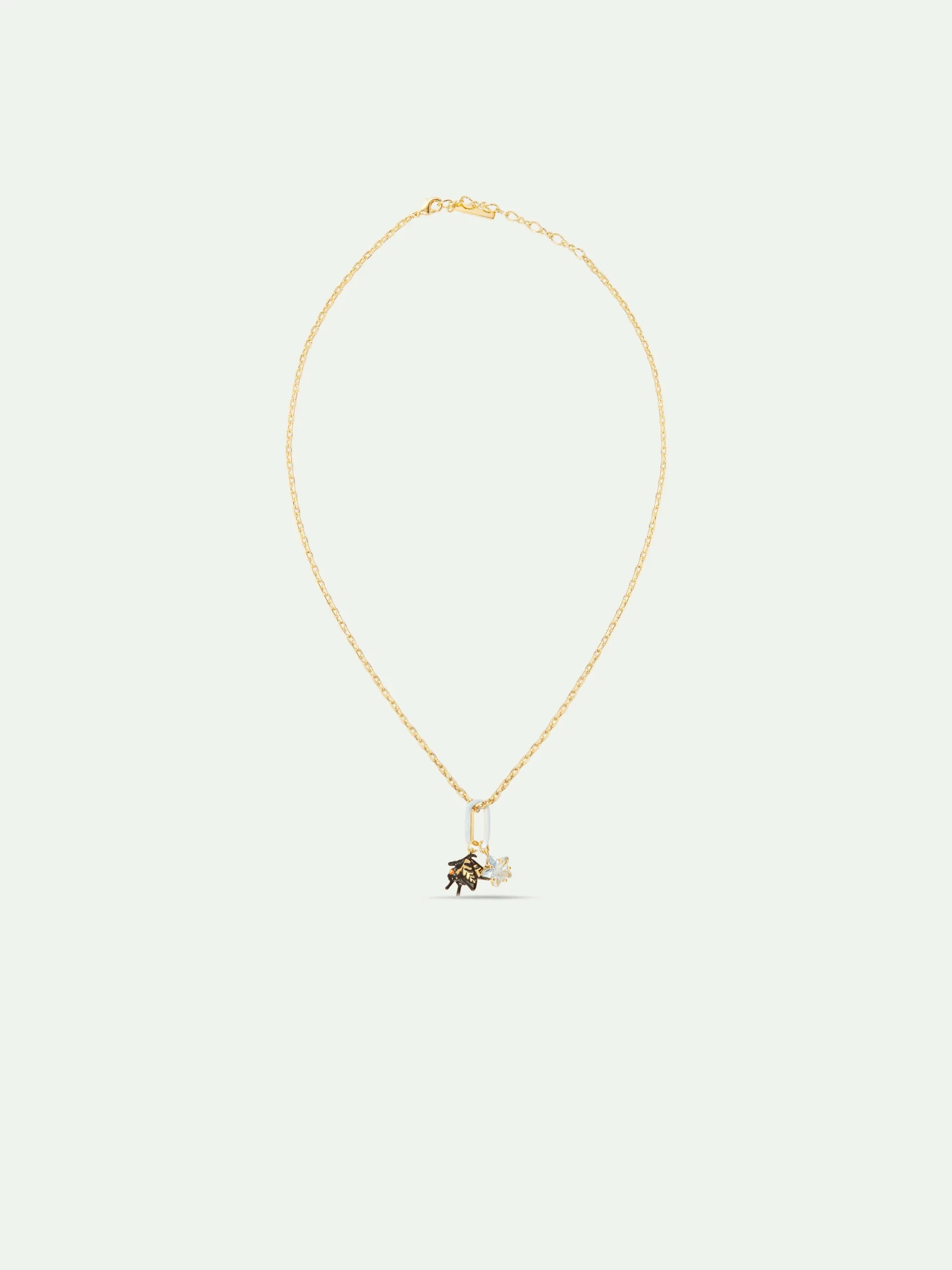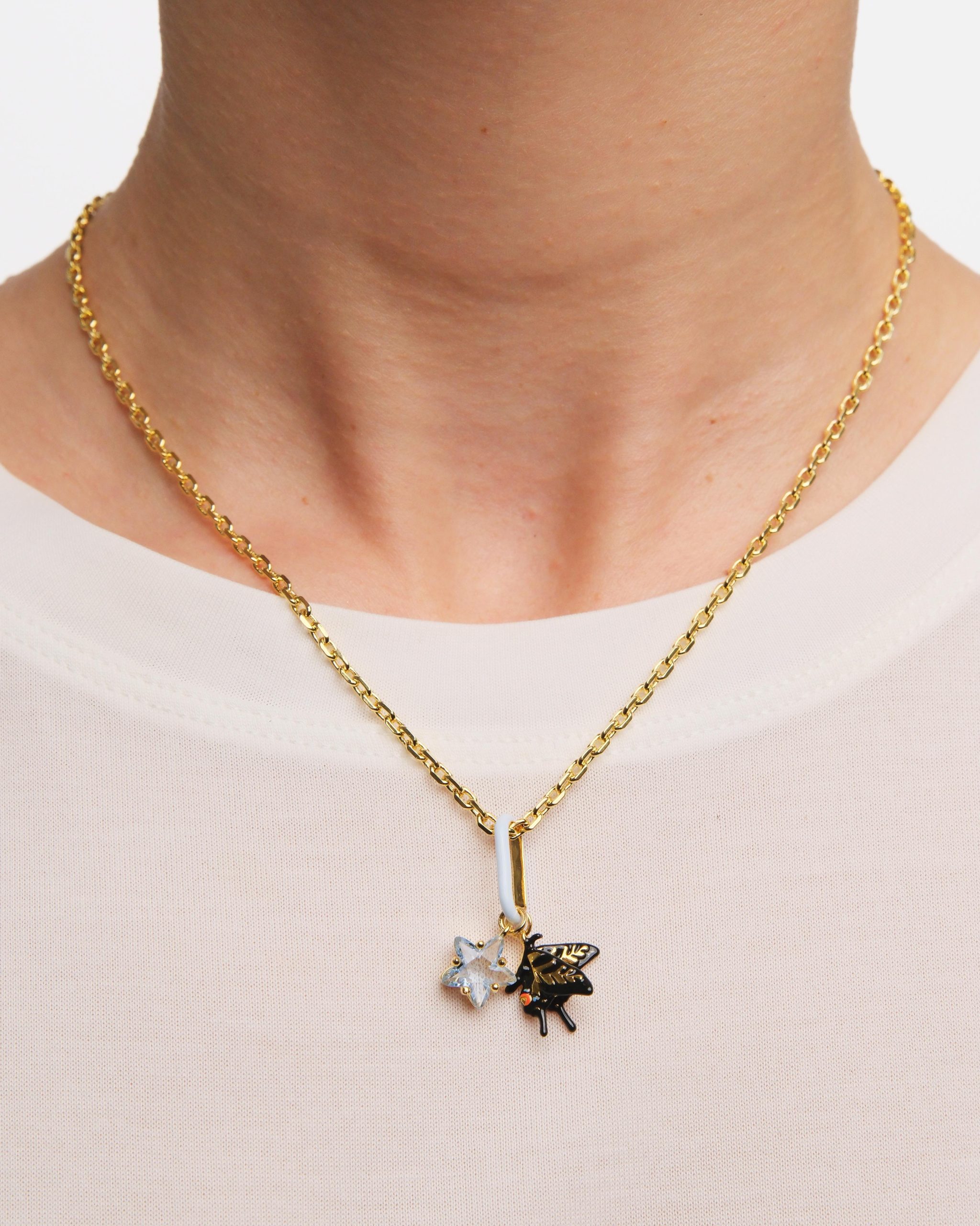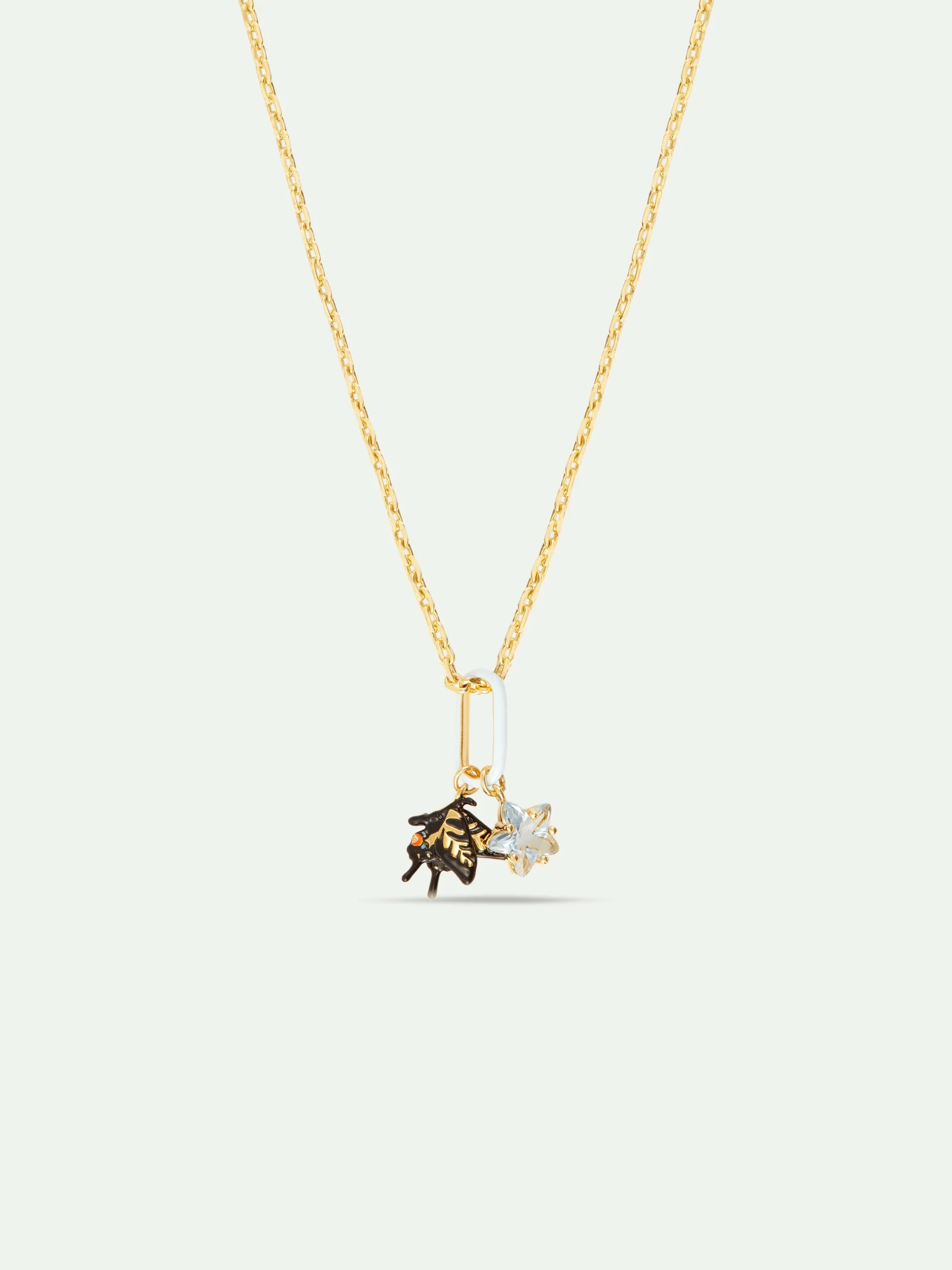 Collier pendentif, charm’s étoile facettée et papillon machaon accrochés à un anneau, chaîne en laiton doré à l’or fin. Le Temps des Rêves présente une fleur de solanum pour apporter une touche de fraîcheur dans les compositions.