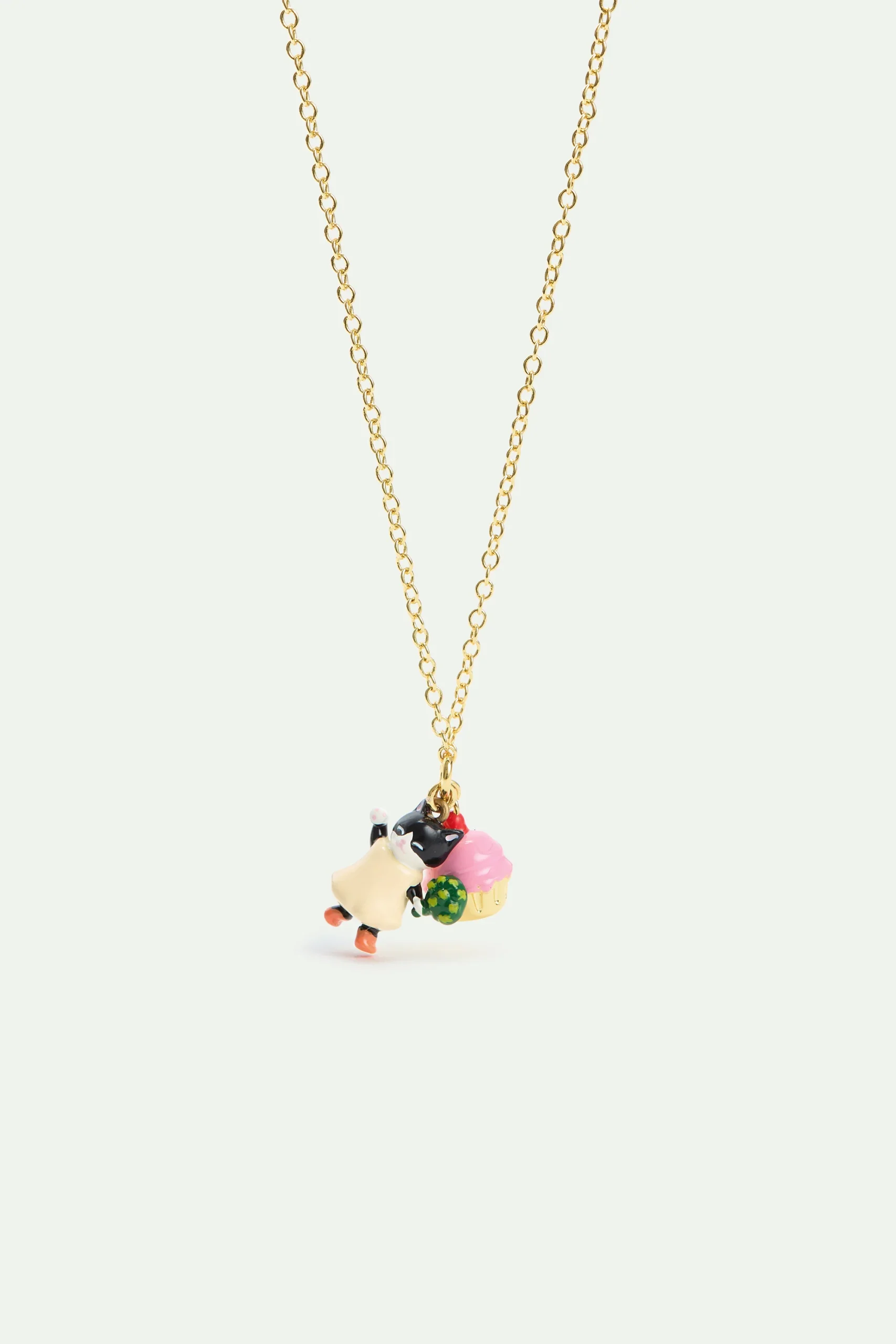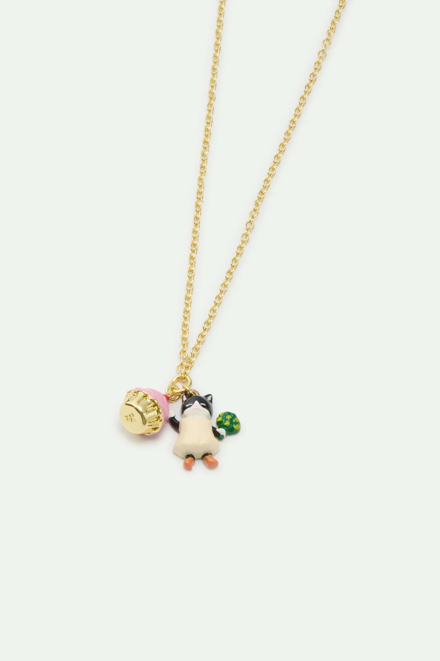 Collier pendentif chaton noir en tenue de pique-nique et patisserie peints à la main. La collection Happy Picnic suit une famille de chats dans une journée ensoleillée dans Paris, accompagnés de leur ami le chien.