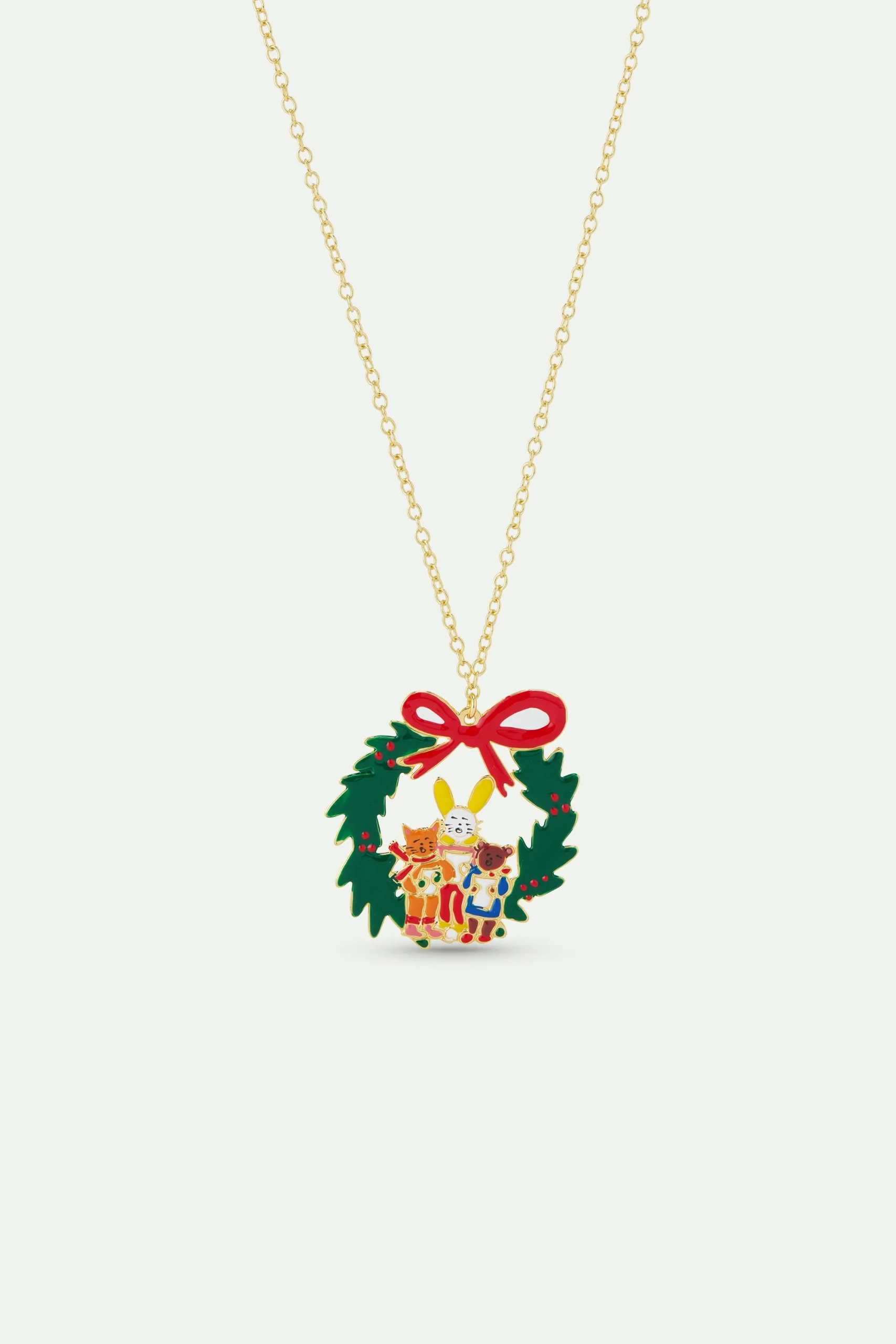Collier pendentif couronne et chorale de noël composé d’un ourson marron, d’un lapin blanc et d’un chat roux chantant peints à la main. Laiton doré à l’or fin.