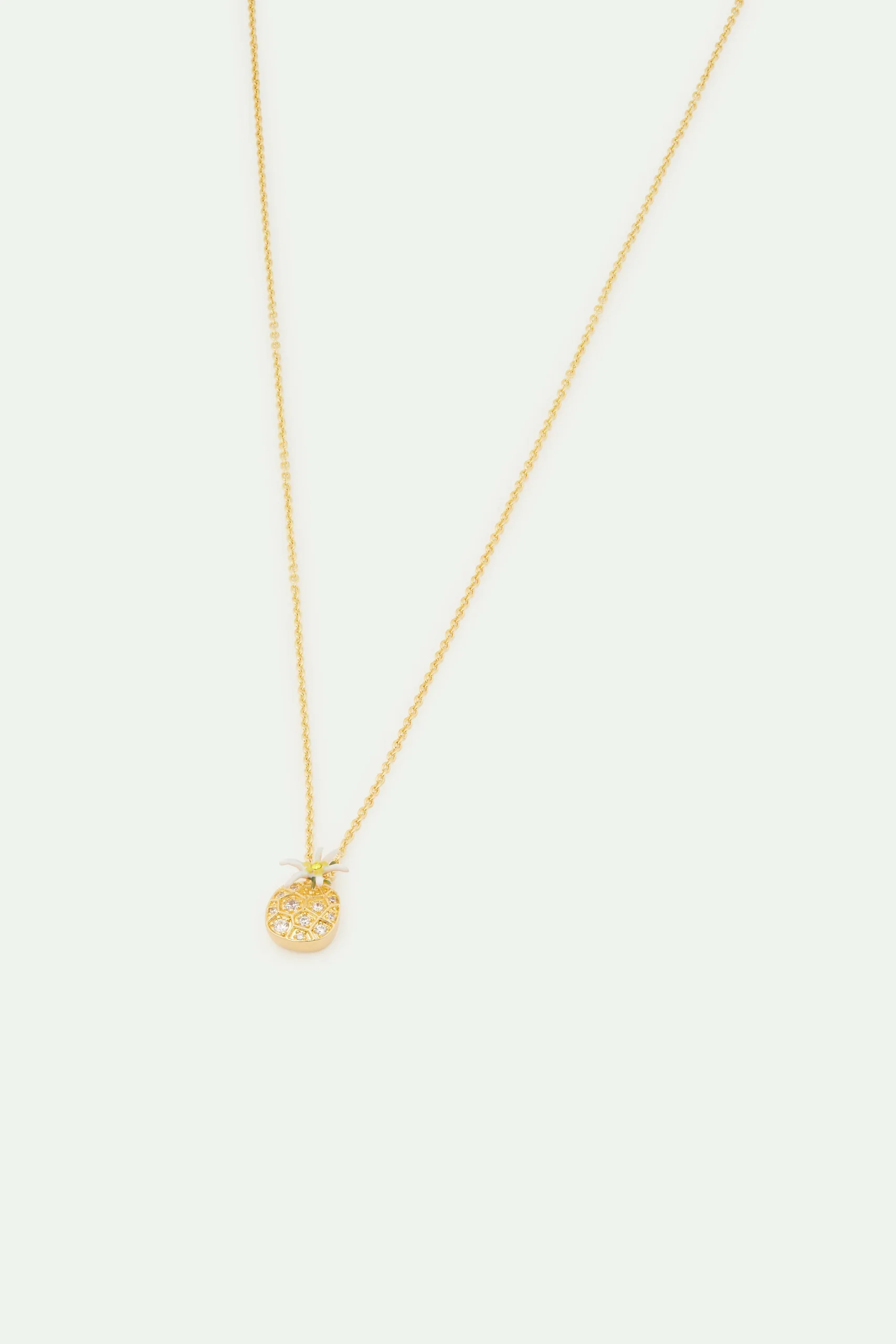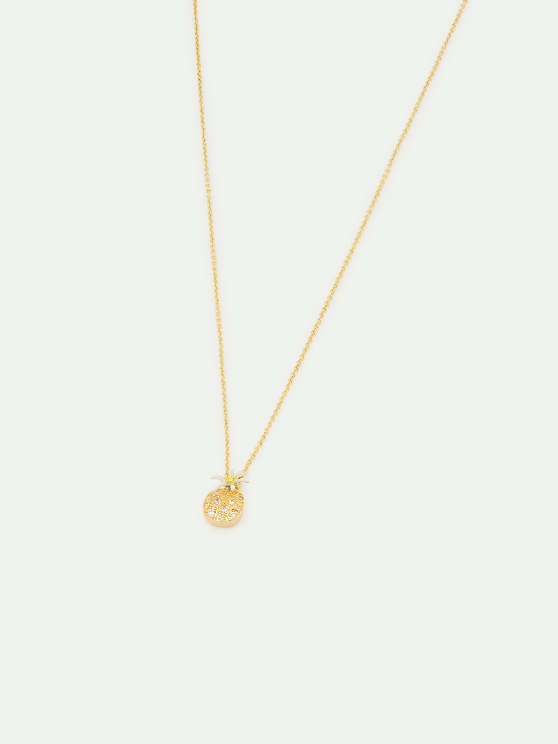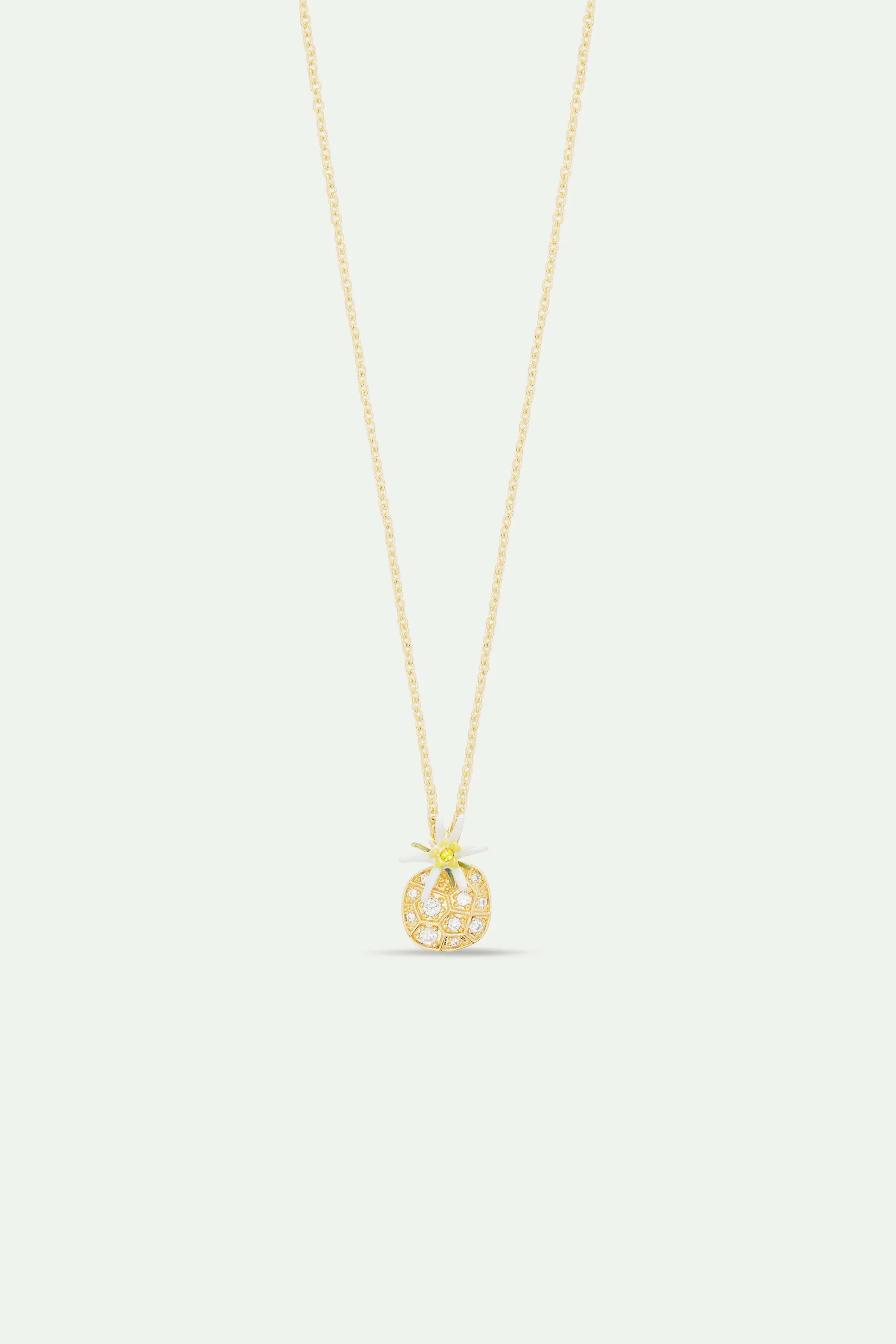 Collier pendentif présentant une fleur d’edelweiss aux pétales blancs, jaunes et verts. La fleur est accompagnée d’oxydes de zirconium, sertis en forme d’un nid d’abeille.