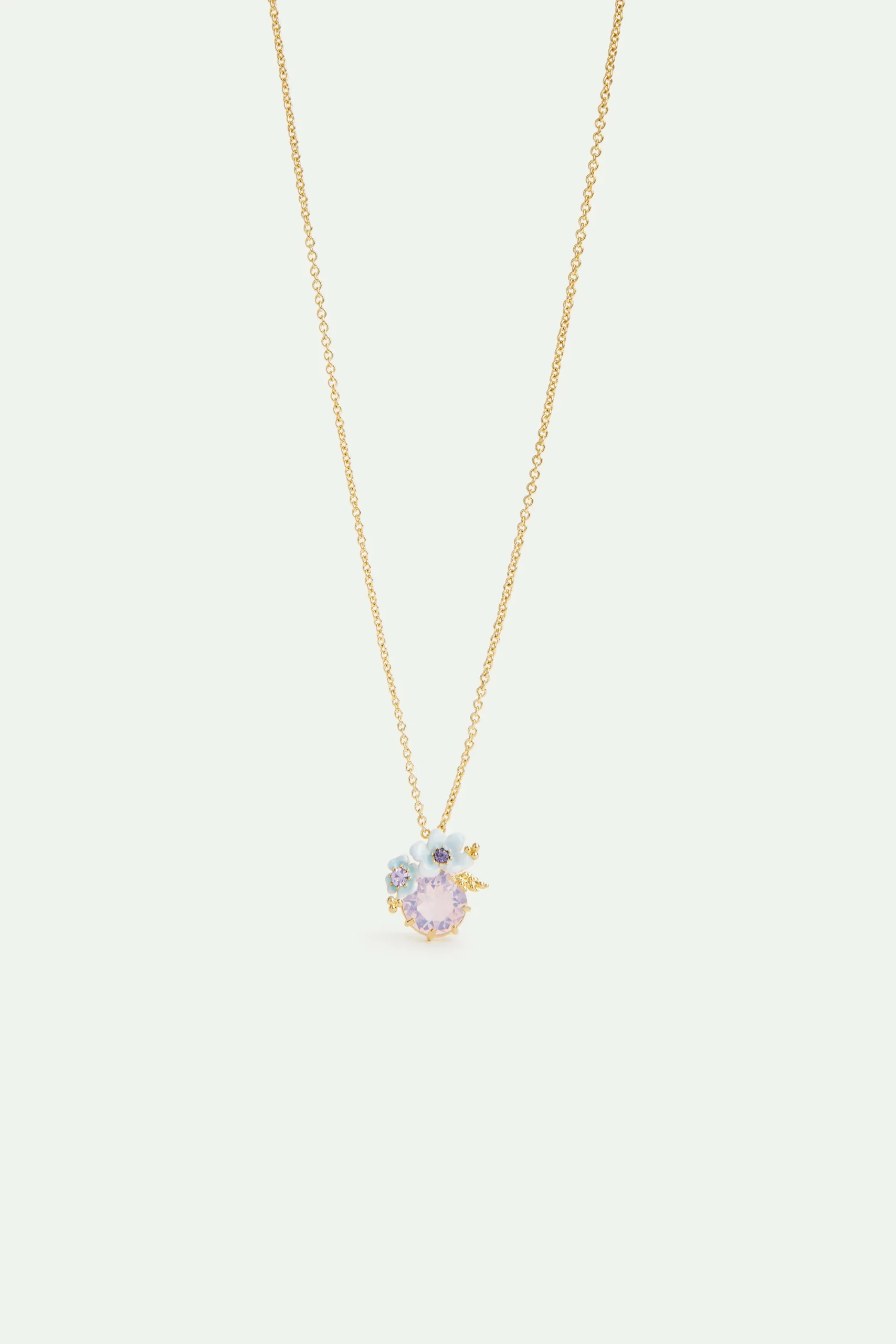 Collier pendentif pierre en verre facetté violet lavande, ornée de petites fleurs bleues peintes à la main. Chaîne en laiton doré à l’or fin. Réédition de la première ligne de bijoux dédiée au mariage, la collection Je Le Veux est une gamme florale, ultra romantique et résolument féminine pour le bonheur des futures mariées et leurs demoiselles d’honneur.
